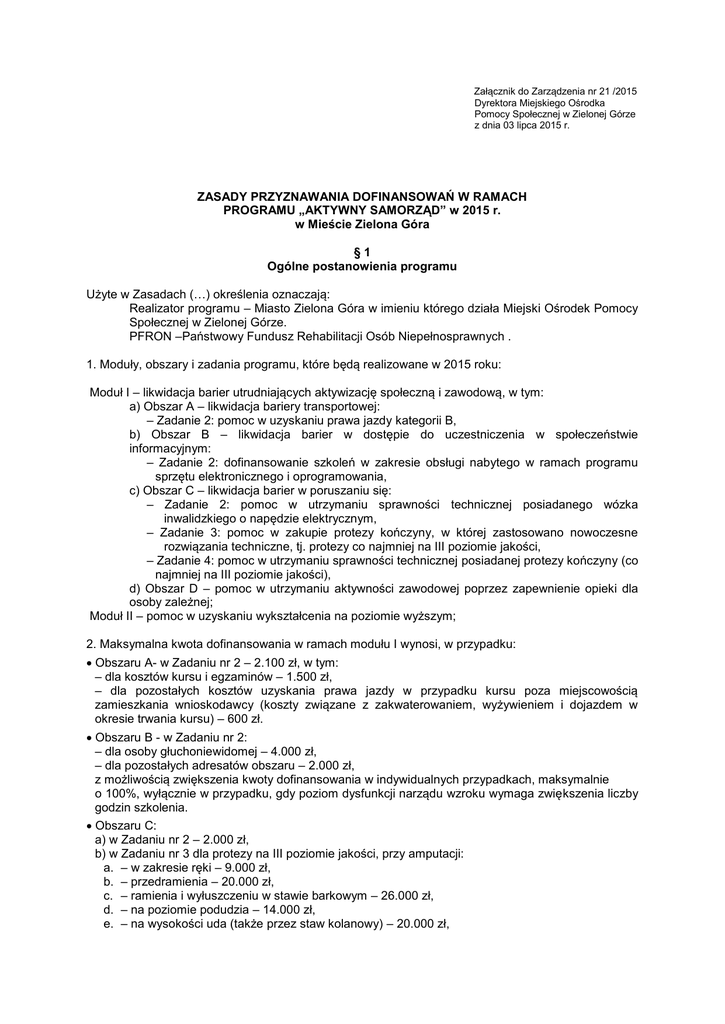 Załącznik do Zarządzenia nr 21 /2015 Dyrektora Miejskiego Ośrodka Pomocy Społecznej w Zielonej Górze z dnia 03 lipca 2015 r. ZASADY PRZYZNAWANIA DOFINANSOWAŃ W RAMACH PROGRAMU „AKTYWNY SAMORZĄD” w 2015 r. w Mieście Zielona Góra §1 Ogólne postanowienia programu Użyte w Zasadach (…) określenia oznaczają: Realizator programu – Miasto Zielona Góra w imieniu którego działa Miejski Ośrodek Pomocy Społecznej w Zielonej Górze. PFRON –Państwowy Fundusz Rehabilitacji Osób Niepełnosprawnych . 1. Moduły, obszary i zadania programu, które będą realizowane w 2015 roku: Moduł I – likwidacja barier utrudniających aktywizację społeczną i zawodową, w tym: a) Obszar A – likwidacja bariery transportowej: – Zadanie 2: pomoc w uzyskaniu prawa jazdy kategorii B, b) Obszar B – likwidacja barier w dostępie do uczestniczenia w społeczeństwie informacyjnym: – Zadanie 2: dofinansowanie szkoleń w zakresie obsługi nabytego w ramach programu sprzętu elektronicznego i oprogramowania, c) Obszar C – likwidacja barier w poruszaniu się: – Zadanie 2: pomoc w utrzymaniu sprawności technicznej posiadanego wózka inwalidzkiego o napędzie elektrycznym, – Zadanie 3: pomoc w zakupie protezy kończyny, w której zastosowano nowoczesne rozwiązania techniczne, tj. protezy co najmniej na III poziomie jakości, – Zadanie 4: pomoc w utrzymaniu sprawności technicznej posiadanej protezy kończyny (co najmniej na III poziomie jakości), d) Obszar D – pomoc w utrzymaniu aktywności zawodowej poprzez zapewnienie opieki dla osoby zależnej; Moduł II – pomoc w uzyskaniu wykształcenia na poziomie wyższym; 2. Maksymalna kwota dofinansowania w ramach modułu I wynosi, w przypadku: Obszaru A- w Zadaniu nr 2 – 2.100 zł, w tym: – dla kosztów kursu i egzaminów – 1.500 zł, – dla pozostałych kosztów uzyskania prawa jazdy w przypadku kursu poza miejscowością zamieszkania wnioskodawcy (koszty związane z zakwaterowaniem, wyżywieniem i dojazdem w okresie trwania kursu) – 600 zł. Obszaru B - w Zadaniu nr 2: – dla osoby głuchoniewidomej – 4.000 zł, – dla pozostałych adresatów obszaru – 2.000 zł, z możliwością zwiększenia kwoty dofinansowania w indywidualnych przypadkach, maksymalnie o 100%, wyłącznie w przypadku, gdy poziom dysfunkcji narządu wzroku wymaga zwiększenia liczby godzin szkolenia. Obszaru C: a) w Zadaniu nr 2 – 2.000 zł, b) w Zadaniu nr 3 dla protezy na III poziomie jakości, przy amputacji: a. – w zakresie ręki – 9.000 zł, b. – przedramienia – 20.000 zł, c. – ramienia i wyłuszczeniu w stawie barkowym – 26.000 zł, d. – na poziomie podudzia – 14.000 zł, e. – na wysokości uda (także przez staw kolanowy) – 20.000 zł, f. – uda i wyłuszczeniu w stawie biodrowym – 25.000 zł, z możliwością zwiększenia kwoty dofinansowania w wyjątkowych przypadkach i wyłącznie wtedy, gdy celowość zwiększenia jakości protezy do poziomu IV (dla zdolności do pracy wnioskodawcy), zostanie zarekomendowana przez eksperta PFRON c) w Zadaniu nr 4 – do 30% kwot, o których mowa w lit. c. Obszaru D – 200 zł miesięcznie, jednak nie więcej niż 2.400 zł w ciągu roku – tytułem kosztów opieki nad każdą osobą zależną. 3. W ramach modułu II kwota dofinansowania poniesionych kosztów nauki, dotyczących semestru/półrocza objętego dofinansowaniem, wynosi w przypadku: 1) dodatku na pokrycie kosztów kształcenia – nie mniej niż 700 zł, maksymalnie 1.000 zł, 2) dodatku na uiszczenie opłaty za przeprowadzenie przewodu doktorskiego - do 4.000 zł, 3) opłaty za naukę (czesne) – równowartość kosztów czesnego w ramach jednej, aktualnie realizowanej formy kształcenia na poziomie wyższym ( na jednym kierunku) – niezależnie od daty poniesienia kosztów, z uwzględnieniem ust. 4-7, a także ust. 8 pkt 2 lit. a. 4. Dodatek na pokrycie kosztów kształcenia może być zwiększony (o ile przyznane przez PFRON środki będą wystarczające), nie więcej niż o: 1) 500 zł – w przypadku, gdy wnioskodawca ponosi koszty z tytułu pobierania nauki poza miejscem zamieszkania, 2) 700 zł – w innych przypadkach – gdy wnioskodawca ponosi koszty dodatkowe z powodu barier w poruszaniu się lub z powodu barier w komunikowaniu się – wyłącznie z tytułu pomocy tłumacza migowego, przewodnika osoby niewidomej, asystenta osoby niepełnosprawnej, 3) 300 zł – w przypadku, gdy wnioskodawca posiada aktualną (ważna) Kartę Dużej Rodziny. 5. Dopuszczalność udzielania pomocy w ramach modułu II: 1) każdy wnioskodawca może uzyskać pomoc ze środków PFRON łącznie maksymalnie w ramach 20 (dwudziestu) semestrów/półroczy różnych form kształcenia na poziomie wyższym – warunek ten dotyczy także wsparcia udzielonego w ramach programów PFRON: a) „STUDENT – kształcenie ustawiczne osób niepełnosprawnych” b) „STUDENT II – kształcenie ustawiczne osób niepełnosprawnych”, z uwzględnieniem pkt 2, 2) wnioskodawcy, którzy do dnia złożenia wniosku uzyskali pomoc ze środków PFRON w ramach większej liczby semestrów/półroczy, niż wskazana w pkt 1, mogą uzyskać pomoc w ramach programu – do czasu ukończenia rozpoczętych do dnia 31 stycznia 2014 roku, form kształcenia na poziomie wyższym, jeśli są one realizowane zgodnie z planem/programem studiów, 3) decyzja o ponownym dofinansowaniu kosztów nauki w przypadku powtarzania przez wnioskodawcę semestru/półrocza/ roku szkolnego lub akademickiego – należy do kompetencji realizatora programu, z zastrzeżeniem pkt 4, 4) wypłata dofinansowania w sytuacji powtarzania semestru /półrocza/ roku szkolnego lub akademickiego przez wnioskodawcę jest dozwolona w ramach dopuszczalnej, łącznej liczby semestrów/półroczy, o której mowa w pkt 1 – z zastrzeżeniem, iż może to nastąpić jeden raz w ciągu trwania nauki w ramach danej formy kształcenia na poziomie wyższym, chyba, że kolejne powtarzanie semestru/pó