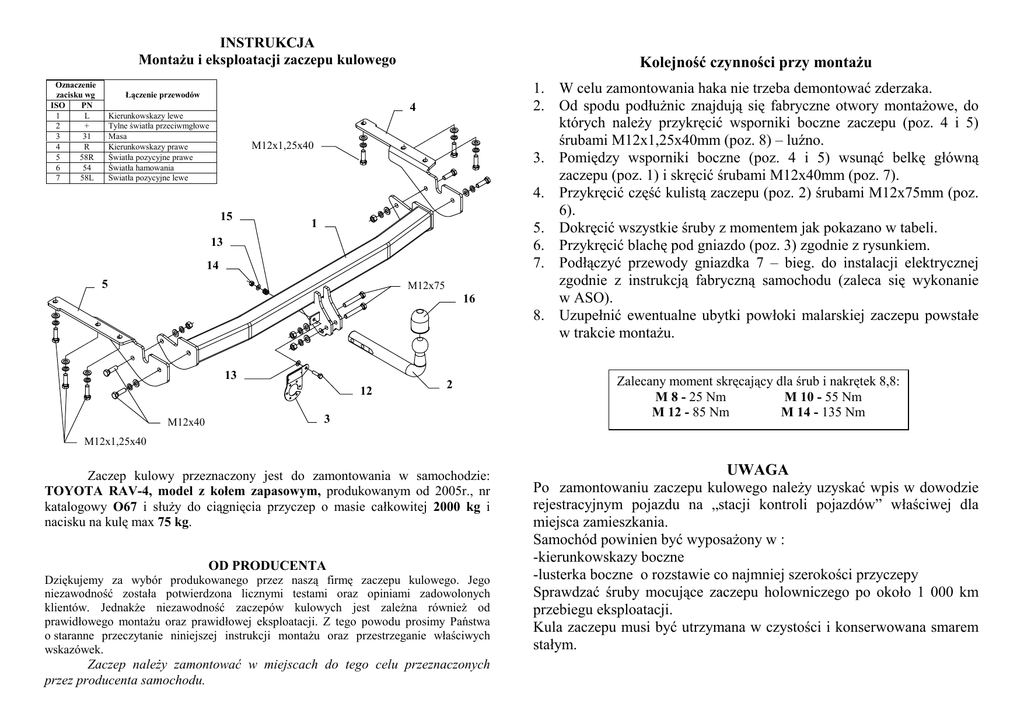 INSTRUKCJA MontaŜu i eksploatacji zaczepu kulowego Oznaczenie zacisku wg ISO PN 1 L 2 + 3 31 4 R 5 58R 6 54 7 58L Kolejność czynności przy montaŜu Łączenie przewodów 4 Kierunkowskazy lewe Tylne światła przeciwmgłowe Masa Kierunkowskazy prawe Światła pozycyjne prawe Światła hamowania Światła pozycyjne lewe M12x1,25x40 15 1 13 14 5 M12x75 16 13 12 M12x40 2 3 1. W celu zamontowania haka nie trzeba demontować zderzaka. 2. Od spodu podłuŜnic znajdują się fabryczne otwory montaŜowe, do których naleŜy przykręcić wsporniki boczne zaczepu (poz. 4 i 5) śrubami M12x1,25x40mm (poz. 8) – luźno. 3. Pomiędzy wsporniki boczne (poz. 4 i 5) wsunąć belkę główną zaczepu (poz. 1) i skręcić śrubami M12x40mm (poz. 7). 4. Przykręcić część kulistą zaczepu (poz. 2) śrubami M12x75mm (poz. 6). 5. Dokręcić wszystkie śruby z momentem jak pokazano w tabeli. 6. Przykręcić blachę pod gniazdo (poz. 3) zgodnie z rysunkiem. 7. Podłączyć przewody gniazdka 7 – bieg. do instalacji elektrycznej zgodnie z instrukcją fabryczną samochodu (zaleca się wykonanie w ASO). 8. Uzupełnić ewentualne ubytki powłoki malarskiej zaczepu powstałe w trakcie montaŜu. Zalecany moment skręcający dla śrub i nakrętek 8,8: M 8 - 25 Nm M 10 - 55 Nm M 12 - 85 Nm M 14 - 135 Nm M12x1,25x40 Zaczep kulowy przeznaczony jest do zamontowania w samochodzie: TOYOTA RAV-4, model z kołem zapasowym, produkowanym od 2005r., nr katalogowy O67 i słuŜy do ciągnięcia przyczep o masie całkowitej 2000 kg i nacisku na kulę max 75 kg. OD PRODUCENTA Dziękujemy za wybór produkowanego przez naszą firmę zaczepu kulowego. Jego niezawodność została potwierdzona licznymi testami oraz opiniami zadowolonych klientów. JednakŜe niezawodność zaczepów kulowych jest zaleŜna równieŜ od prawidłowego montaŜu oraz prawidłowej eksploatacji. Z tego powodu prosimy Państwa o staranne przeczytanie niniejszej instrukcji montaŜu oraz przestrzeganie właściwych wskazówek. Zaczep naleŜy zamontować w miejscach do tego celu przeznaczonych przez producenta samochodu. UWAGA Po zamontowaniu zaczepu kulowego naleŜy uzyskać wpis w dowodzie rejestracyjnym pojazdu na „stacji kontroli pojazdów” właściwej dla miejsca zamieszkania. Samochód powinien być wyposaŜony w : -kierunkowskazy boczne -lusterka boczne o rozstawie co najmniej szerokości przyczepy Sprawdzać śruby mocujące zaczepu holowniczego po około 1 000 km przebiegu eksploatacji. Kula zaczepu musi być utrzymana w czystości i konserwowana smarem stałym. PPUH AUTO-HAK S.J. WyposaŜenie zaczepu: Produkcja Haków Holowniczych Henryk & Zbigniew Nejman 76-200 SŁUPSK ul. Słoneczna 16K tel/fax (059) 8-414-414; 8-414-413 E-mail: [email protected] www. autohak.com.pl Zaczep kulowy bez wyposaŜenia elektrycznego Klasa: A50-X Nr kat. O67 Przeznaczony do zamontowania w samochodzie: Producent: TOYOTA Model: RAV-4 model z kołem zapasowym produkowanym od 2005r. Dane techniczne: wartość siły D: 10,4 kN maksymalna masa przyczepy: 2000 kg maksymalny nacisk na kulę: 75 kg Numer homologacji zgodnie z dyrektywą 94/20/WE: e20*94/20*0105*00 KARTA GWARANCYJNA Producent udziela gwarancji niniejszą kartą gwarancyjną na okres 24 miesięcy licząc od dnia zakupu zaczepu kulowego do samochodu: TOYOTA RAV-4 (model z kołem zapasowym) produkowanego od 2005r. Data produkcji .............................. Data zakupu............................................. Zakres gwarancji obejmuje wyłącznie wady jakościowe wynikające z winy producenta. Gwarancja nie obejmuje natomiast uszkodzeń zawinionych przez nabywcę, wynikających z niewłaściwego montaŜu, uŜytkowania lub konserwacji, uszkodzeń mechanicznych, normalnego zuŜycia podczas eksploatacji itp. Gwarancja udzielona na zakupiony towar nie wyłącza, nie ogranicza ani nie zawiesza uprawnień kupującego wynikających z niezgodności towaru z umową. Reklamacje naleŜy zgłaszać w punkcie sprzedaŜy, składając jednocześnie kartę gwarancyjną. Usunięcie "wady" następuje po stwierdzeniu przez punkt sprzedaŜy wspólnie z producentem słuszności złoŜonej reklamacji. Reklamacja powinna być załatwiona w ciągu 14 dni od dnia uznania reklamacji. Karta gwarancyjna jest niewaŜna jeŜeli nie jest wypełniona i podpisana. Data zgłoszenia reklamacji: ................................................................... INFORMACJA WSTĘPNA Zaczep kulowy jest skonstruowany zgodnie z zasadami bezpieczeństwa ruchu drogowego. Zaczep kulowy jest elementem wpływającym na bezpieczeństwo jazdy i moŜe zostać zainstalowany wyłącznie przez personel wyspecjalizowany. Niedopuszczalne jest dokonywanie jakichkolwiek zmian w konstrukcji zaczepu. Powoduje to wygaśniecie dopuszczenia do stosowania. W przypadku obecności masy izolacyjnej lub osłony podwozia w miejscu przylegania zaczepu, naleŜy ją usunąć. Nieosłonięte miejsca karoserii oraz wywiercone otwory naleŜy pomalować farbą antykorozyjną. Informacjami wiąŜącymi odnośnie wartości obciąŜeń są dane podawane przez producenta samochodu, względnie wartości maksymalnej masy przyczepy oraz maksymalnego nacisku na kulę, przy czym wartości parametrów zaczepu holowniczego nie mogą być przekroczone. Wzór do obliczania wartości siły D: Maks. masa przyczepy [kg] x Maks. masa samochodu [kg] Maks. masa przyczepy [kg] + Maks. masa samochodu [kg] X 9,81 = 1000 D [kN]