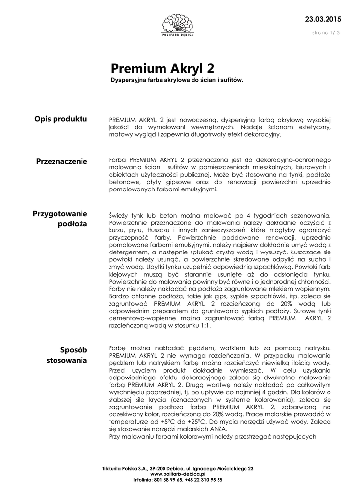 23.03.2015 strona 1/ 3 Premium Akryl 2 Dyspersyjna farba akrylowa do ścian i sufitów. Opis produktu Przeznaczenie Przygotowanie podłoża Sposób stosowania PREMIUM AKRYL 2 jest nowoczesną, dyspersyjną farbą akrylową wysokiej jakości do wymalowani wewnętrznych. Nadaje ścianom estetyczny, matowy wygląd i zapewnia długotrwały efekt dekoracyjny. Farba PREMIUM AKRYL 2 przeznaczona jest do dekoracyjno-ochronnego malowania ścian i sufitów w pomieszczeniach mieszkalnych, biurowych i obiektach użyteczności publicznej. Może być stosowana na tynki, podłoża betonowe, płyty gipsowe oraz do renowacji powierzchni uprzednio pomalowanych farbami emulsyjnymi. Świeży tynk lub beton można malować po 4 tygodniach sezonowania. Powierzchnie przeznaczone do malowania należy dokładnie oczyścić z kurzu, pyłu, tłuszczu i innych zanieczyszczeń, które mogłyby ograniczyć przyczepność farby. Powierzchnie poddawane renowacji, uprzednio pomalowane farbami emulsyjnymi, należy najpierw dokładnie umyć wodą z detergentem, a następnie spłukać czystą wodą i wysuszyć. Łuszczące się powłoki należy usunąć, a powierzchnie skredowane odpylić na sucho i zmyć wodą. Ubytki tynku uzupełnić odpowiednią szpachlówką. Powłoki farb klejowych muszą być starannie usunięte aż do odsłonięcia tynku. Powierzchnie do malowania powinny być równe i o jednorodnej chłonności. Farby nie należy nakładać na podłoża zagruntowane mlekiem wapiennym. Bardzo chłonne podłoża, takie jak gips, sypkie szpachlówki, itp. zaleca się zagruntować PREMIUM AKRYL 2 rozcieńczoną do 20% wodą lub odpowiednim preparatem do gruntowania sypkich podłoży. Surowe tynki cementowo-wapienne można zagruntować farbą PREMIUM AKRYL 2 rozcieńczoną wodą w stosunku 1:1. Farbę można nakładać pędzlem, wałkiem lub za pomocą natrysku. PREMIUM AKRYL 2 nie wymaga rozcieńczania. W przypadku malowania pędzlem lub natryskiem farbę można rozcieńczyć niewielką ilością wody. Przed użyciem produkt dokładnie wymieszać. W celu uzyskania odpowiedniego efektu dekoracyjnego zaleca się dwukrotne malowanie farbą PREMIUM AKRYL 2. Drugą warstwę należy nakładać po całkowitym wyschnięciu poprzedniej, tj. po upływie co najmniej 4 godzin. Dla kolorów o słabszej sile krycia (oznaczonych w systemie kolorowania), zaleca się zagruntowanie podłoża farbą PREMIUM AKRYL 2, zabarwioną na oczekiwany kolor, rozcieńczoną do 20% wodą. Prace malarskie prowadzić w temperaturze od +5°C do +25°C. Do mycia narzędzi używać wody. Zaleca się stosowanie narzędzi malarskich ANZA. Przy malowaniu farbami kolorowymi należy przestrzegać następujących Tikkurila Polska S.A., 39-200 Dębica, ul. Ignacego Mościckiego 23 www.polifarb-debica.pl Infolinia: 801 88 99 65, +48 22 310 95 55 23.03.2015 strona 2/ 3 Premium Akryl 2 Dyspersyjna farba akrylowa do ścian i sufitów. zasad: aby uniknąć różnic w odcieniach należy upewnić się, czy została przygotowana odpowiednia ilość farby z jednej partii produkcyjnej, bezpośrednio przed malowaniem należy wymieszać farbę z różnych opakowań, jedno pomieszczenie malować tylko jedną techniką malarską przy intensywnych kolorach nie wykonywać miejscowych poprawek po wyschnięciu powłoki, lecz pomalować całą ścianę. Prace prowadzić w temperaturze od +5°C do +25°C. Rozcieńczalnik/mycie narzędzi: woda. Kolor Stopień Połysku Wydajność Teoretyczna Termin przydatności Opakowania Wskazówki BHP i ppoż. Biały i bazy dostosowane do barwienia w systemie AVATINT, który umożliwia uzyskanie pełnej gamy kolorów wg kart NCS i RAL. Powłoki w kolorze białym i w kolorze z bazy C są odporne na delikatne przemywanie wodą z rozcieńczonym detergentem. Pełny mat. Do 12 m2/l przy jednokrotnym malowaniu, w zależności od chłonności podłoża i użytego narzędzia malarskiego. 24 miesięce od daty produkcji, w fabrycznie zamkniętym opakowaniu. 1l; 3l; 10l (biała), 0,9l; 2,7l; 9l (bazy) Produkt zastosowany zgodnie z przeznaczeniem i instrukcją stosowania nie stwarza zagrożenia dla zdrowia i środowiska. Farbę należy przechowywać w miejscu niedostępnym dla dzieci. Pomieszczenia po zastosowaniu produktu należy wietrzyć do zaniku zapachu i po tym czasie nadają się do użytkowania. Podczas malowania nosić odpowiednie ubranie robocze oraz rękawice ochronne. Zawiera 1,2-benzoizotiazol-3(2H)-on, 2-metylo-2H- izotiazol-3-onu i mieszanina poreakcyjna 5-chloro-2-metylo-4-izotiazolin-3-onu [nr WE 247-500-7] i 2-metylo-4- -izotiazolin-3-onu [nr WE 220-239-6] (3:1). Może powodować wystąpienie reakcji alergicznej. Przed przystąpieniem do mycia narzędzi wodą, należy je dobrze wytrzeć, w celu usunięcia możliwie największej ilości farby. Resztki płynnego produktu przekazać firmom specjalistycznym posiadającym stosowne zezwolenie w celu utylizacji. Płynne pozostałości po malowaniu usunąć zgodnie z obowiązującymi Tikkurila Polska S.A., 39-200 Dębica, ul. Ignacego Mościckiego 23 www.polifarb-debica.pl Infolinia: 801 88 99 65, +48 22 310 95 55 23.03.2015 strona 3/ 3 Premium Akryl 2 Dyspersyjna farba akrylowa do ścian i sufitów. przepisami. Puste opakowania należy oddać do odzysku unieszkodliwienia. Karta charakterystyki dostępna na życzenie Klienta. Transport i przechowywanie Parametry techniczne lub Farbę chronić przed zamarzaniem i promieniowaniem słonecznym. Przechowywać i transportować w szczelnie zamkniętym opakowaniu, w temperaturze od +5° C do +25° C. Składować w pomieszczeniach suchych i przewiewnych. Lepkość (+23°C) Gęstość 98-108 maks.1,48 g/cm3 Połysk z powłoki Czas wysychania powłoki w temp. +20 ± 2oC i przy wilgotności względnej powietrza 55 ± 5% stopień V ok. 2 maks. 2 godz. Produkt posiada Atest Higieniczny. Norma: ZN-WG-25:2008 Kat. A/a. Dopuszczalna zawartość LZO od 2010 roku – 30 g/l. Produkt zawiera poniżej 30 g/l LZO. Powyższe informacje nie są wyczerpujące i kompletne