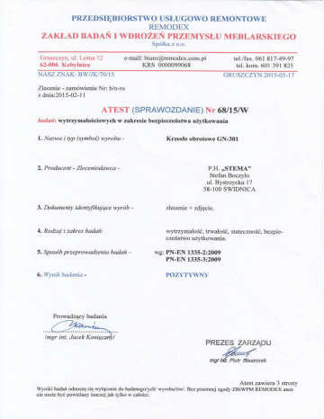 PRZEDSIĘBIORSTWO USŁUGOWO REMONTOWE REMODEx ZAKŁAD BADAŃ I WDROŻEŃ PRZEMYSŁU MEBLARSKIEGO Spólka z o,o. 12 Kobylnica Gruszczyn, ul. Leśna 62-006 e-mail: [email protected] KRS 0000099068 NASZ ZNAK: BwJK/70l15 tel./fąx.061 817-49-97 tel. kom.601 391 825 GRUSZCZYN 20] 5_03-17 Z]ecenie - zamówienie Nr: h/n-ru z dńa:2015-02-1'1 ATEST (SPRAWOZDANlE) Nr 68/15/W ba daft 1. wytrzymałościowychw zakie§i€ bezpieczeń§twa Nazwa i typ (synbol) wyobu - ułtkowania Kr,że§ło obiotolve GN-30l P.H.,STEMA" 2. Producent - Zleceniodąwca - Stefan Boczyło rr1. Bystrzycka 17 58_100 3. Dobumenty identyJikujqce 4, wyób - zlecenie + zdjęcie. Rodzaj i zakres badań: 5. Sposób plzeprowadzenirl Św]DNIcA Ę}trz}małość,awałość,statecmość, bezpieczeństwo uż},tkowania. badań 6. Wynik htJanhL - wg: PN-EN 1335-2|2009 PN-EN 1335-3:2009 POZYTYWNY Prowadzący badania PREZES ZARZADU ą,,/' Wriń. Piotr Błaszczak Atest zawie]-a 3 strony wyniki badan odnoszą się wyłącznie do badanego/ycb/ w}robu/ów. Bez pisernnej zgody ZBiwPM REMODEX atest nie może być powielany inaczej jak ty]ko w całości, str. 2 ATEST Nr 68/15/w badań bezpieczeństwa KRZESLO OBROTOWE Nazwa, symbol i typ meóla] Krze§lo obrotowe GN-30l WYMAGANIA BEZPIECZENSTWA: zadżiory, ostre kJawędzie niedopuszczalne Wynik badania porytywny otlvalte końce ruI, możliwośćplzytrzaśnięcia i przyszcz}pnięcia zgoalne z normą poz}t}nvny pkt, Rodzaj badania PN-EN 4.Ll Wymagania 4.1 .2 części ruchome i nastawne nie powodują urazów porytyłny 4.|.3 połączenia częścinośnych nie poluzowu|ą się poz}tywny 4.1 -4 smarowaIrie częŚci przesuwnych ńe powodują plamienia pozytywny STATECZNOSC: Rodzaj badania Nr Utrata róWnowagi pźy obciązeniu przedniej kawędzi siedziska do dołu 2 3 4 Utrata Iównowagi do przodu Utrata równowagi na bok kzesła z poręcza- mi Utrata równowagi do tyfu Bądanie pĘeprowądził: Wynik badania obciążenie masa poz].ĘĄvny 27 kg siła pionowa F1 600 N N siła pionowa F1 250 N siłapionowa F2 350 N siła pozioma F3 20 N siła pionowa F1 600 N siła pozioma F2 192 N siła pozioma Fz 20 pozyt]Ąvny poż)tywny pou},t}nvny stl. 3 ATEST Nr ó8/15M badań bezpieczeństwa KRZESŁO OBROTOWE NązjĄ,a, symbol i typ meóla: Krzesło obrotowe GN-301 WYTRz\a4AŁoŚC i TRWAŁoŚć cześćmebla Nr ] 2 obciążenia przednia krawędź siedziska - siedzisko - opaxcię punk1 3 trwałość siedziska i opaxcia c puŃt B punkt J punk E punk F Dunkt H punk1 D 4 poIęcze pozyty!\ny siła pionowa 1 600 N siła pozioma 560 N 10 poz},t},\\Ły 120000 poż}4y\łny 80000 poz},tywny N siła pionowa 1200 N siła pozioma 320 N siła pionowa 1200 N siła pozioma 320 N siła pionowa 1500 20000 siła pionowa 1200 N siła pozioma 320 N 20000 siła pionowa 1100 N siła pionowa 750 N siła pionowa 900 N siła pionowa 450 N siła pożoma 400 20000 N N odchylona o 10" od Dionu 6 ohracanie krzesła kółka./* obciązenie siedziska p,'Ą-60 ks. p.C-35ks opór toczenia siła minimum 15 trwałość obciąźenie siedziska D.A - 1l0 kg H Badanie przeptowadził : .i ., N !vo poą.tywny pożyt}avny .6_ś ź poą4y!!ny 5 poz),ty\łny 5 poż)tywny 10 porytyllny 60000 poż)ł},\rny 20000 poz),t)Ąr.ny ] N oozltlrłnv siła - 28 N UWAGA: dopuszczalnę maksymalne obciążnie siedziska - 150 kg /* - typu Wynik badania 10 siła 400 5 Wymaqania N siła pionowa 1600 pul1 A cykle 36000 poz},t}\,ny