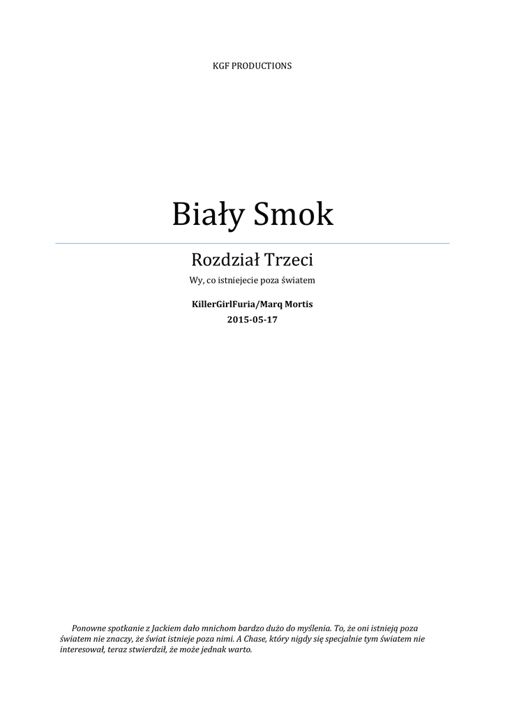KGF PRODUCTIONS Biały Smok Rozdział Trzeci Wy, co istniejecie poza światem KillerGirlFuria/Marq Mortis 2015-05-17 Ponowne spotkanie z Jackiem dało mnichom bardzo dużo do myślenia. To, że oni istnieją poza światem nie znaczy, że świat istnieje poza nimi. A Chase, który nigdy się specjalnie tym światem nie interesował, teraz stwierdził, że może jednak warto. Biały Smok 17 maja 2015 Atmosfera w świątyni dzisiaj wyjątkowo różniła się od tej zwyczajowej, szczególnie po powrocie młodych mnichów. Każdy z nich wydawał się czymś wyjątkowo poruszony i każdy wyrażał to w zupełnie inny sposób. Fung nawet nie zdążył zapytać jak poszedł Pojedynek, kiedy cała piątka rozpierzchła się po terenie. Nawet Dojo, wyjątkowo, był bardzo cichy i spokojny. Co gorsza nikt nawet nie szepnął mu słowa o tym, co zaszło – czegokolwiek, co mogłoby naprowadzić go na właściwy trop. I przez to Fung był bardzo zmartwiony. Jeśli nie wiedział, z jakim problemem borykają się jego uczniowie to jak miał im pomóc? Siedział właśnie w świątynnej kuchni przy stole, Rezem z świątynnym smokiem. - Dojo? – zapytał stary mistrz podchodząc do miniaturowego smoka siedzącego na drewnianej ramie okrągłego, otwartego okna. – Powiesz mi, co się stało? - Później, mistrzu – westchnął smok, odwracając powoli nieproporcjonalnie dużą głowę w jego stronę. – Sam sobie musze to najpierw poukładać. - Dobrze. Nie naciskam. - Wiem, że się o nas martwisz, ale to, co się dzisiaj stało… Ja nawet nie wiem, jak to opowiedzieć. Muszę pomyśleć. Sam. Fung kiwnął głową, wychodząc z pomieszczenia. Teraz wiedział, że stało się coś naprawdę ważnego, ale nadal nie wiedział, co. Mimo to, na razie postanowił nie naciskać. Wierzył, że jeśli dzieciaki lub Dojo będą chcieli mu powiedzieć, to powiedzą. Kimiko kiwnęła tylko głową, kiedy mistrz Fung przeszedł obok niej, zajęta wystukiwaniem czegoś na swoim tablecie. Spicer Corporations, mówił nagłówek pogrubionymi, wielkimi literami. Od kiedy tylko wrócili, Kimiko szukała wszelkich informacji o nowej firmie Jacka i była szczerze zaskoczona tym, jak wiele już znalazła. Musiała przyznać, że Jack naprawdę wziął się za siebie w ciągu tych ostatnich pięciu lat. Tak bardzo, że osiągnął niemożliwe – dla zwykłego człowieka – rzeczy. W jego środowisku nazywano go po prostu geniuszem. W ciągu tych pięciu lat zdał trzy doktoraty na trzech najbardziej prestiżowych uczelniach świata, założył i rozwinął firmę, przy czym stał się praktycznie jednym z najbogatszych ludzi na świecie, i jednym z najbardziej liczących się w środowisku nie tylko biznesowym, ale i – co ciekawe – politycznym. A to były tylko ogólno dostępne informacje o jego publicznych osiągnięciach. Po tym, co Kimiko zaobserwowała, nie próżnował także jeśli chodziło o treningi. Co ją najbardziej uderzyło to fakt, że główną siedzibę firmy – tę, której adres podał – miał nigdzie indziej, niż w Szanghaju. Nie dość, że było to w Chinach, to jeszcze całkiem blisko od ich świątyni. Przez te pięć lat Jack działał tuż pod ich nosami, a oni nie zauważyli absolutnie niczego. - Masz coś? – zapytał cicho Raimundo, siadając obok dziewczyny i podając jej kubek ciepłej herbaty. Kimiko westchnęła, biorąc naczynie w dłoń i upijając nieco bursztynowego płynu. - Nic ponad to, co miałam pół godziny temu – odpowiedziała, odstawiając kubek na ziemię obok swojej nogi. – Jakim cudem on się wybudował tuż pod naszym nosem, a my nic nie zauważyliśmy? Przecież tyle razy byliśmy w Szanghaju! – syknęła dziewczyna. - Spicer miał rację – przyznał Raimundo. – Nie znamy świata poza świątynią. - Nienawidzę, kiedy inni mają rację – stwierdziła dziewczyna, odkładając tablet i biorąc kubek w dłonie. – Tak bardzo tego nienawidzę. - Ja też nie. Chodź, sprawdzimy co u Claya może? - Ta… ~(x)~ Clay siedział na wysokim, zimnym murze otaczającym świątynię pozornie bezpiecznym kręgiem, twarzą zwrócony w stronę tego, co znajdowało się poza ‘bezpiecznym’ okręgiem, poza ostoja, którą wszystkie smoki doskonale znały. Jego kowbojski kapelusz leżał obok, do połowy wypełniony ziarnem, o całej powierzchni zajętej przez głodne ptactwo. Blondwłosy kowboj siedział pochylony przed siebie, z rękami wspartymi na udach, wpatrzony w błękitny horyzont na wschodzie. Słońce ogrzewało mu kark. Strona 2 Biały Smok 17 maja 2015 Ptactwo nagle podniosło w piski i wszystkie, jak jeden poderwały się do góry omal nie przewracając kapelusza, kiedy Raimundo i Kimiko bez trudu wskoczyli na wysoki mur, siadając obok kowboja bez słowa. - O czym tak myślisz? – zapytał Raimundo, łapiąc jeden z mniejszych, luźnych kamyczków i rzucił go przed siebie. - O świecie – odparł Clay. – Znaczy, ja lubię życie mnicha. Bardzo lubię. Ale to pojawienie się Jacka dało mi do myślenia… Ile świata już nam uciekło przez te… Siedem lat w świątyni? Kimiko już otwierała usta, żeby się odezwać, ale dopiero wtedy zorientowała się, że nie ma pojęcia, co chce powiedzieć. Clay miał rację, nieważne jak poruszyć tę kwestię. Jack też miał rację. To, że oni istnieli poza światem nie znaczyło, że świat istniał poza nimi. Co więcej, znaczyło to, że ten świat im uciekał, oddalał się od nich, pomiędzy wiecznymi treningami, odszukiwaniem Wu, pojedynkami ze złem, zamknięci w świątyni, ślepi na to, co było wokoło. - Życie nam ucieka – wyszeptała nagle dziewczyna, unosząc blade, delikatne dłonie do góry, oglądając je z każdej strony. – Ucieka, przecieka przez palce jak woda, przesypuje się jak piasek. A my jesteśmy tu uziemieni, w tej świątyni, na zawsze. Kimiko podniosła dłoń wysoko do góry, patrząc na błękit nieba między szeroko rozłożonymi palcami z brzydkim grymase