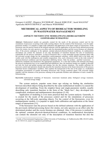 Proceedings of ECOpole Vol. 4, No. 1 2010 Grzegorz ŁAGÓD1, Zbigniew SUCHORAB1, Henryk SOBCZUK1, Jacek MALICKI1 Agnieszka MONTUSIEWICZ1 and Marcin WIDOMSKI1 METHODICAL ASPECTS OF BIOREACTOR MODELING IN WASTEWATER MANAGEMENT ASPEKTY METODYCZNE MODELOWANIA BIOREAKTORÓW GOSPODARKI ŚCIEKOWEJ Abstract: Mathematical models are generally created for the needs of the processes control and for the simulations of processes occurring at the really existing objects. For the control of the bioreactors, even for multiparameter models, it is popular to apply both calibration and application at the linear ranges of interactions. If the bioreactor runs the process based on the defined substrate with the application of the previously defined processing factor (for strains, not only species) as an effect only the determined product and the excess biomass are obtained. Also, if the process undergoes in the optimal, constant physical-chemical-biotical conditions, its mathematical description can contain the elements of not only description of transition function but also of mechanisms responsible for the process realization. A kind of bioreactor like a n-step municipal sewage treatment plant with the activated sewage sludge has the unidentified, multicomponent substrate, which differs both in the daily and weekly scale with the multispecies and variable composition. Also, such a bioreactor works in the wide extend of physical-chemical conditions and time-dependent inhibiting factors. Only the product - purified wastewater - is defined by standards and should have the appropriate parameters. It is clear that models with elements describing the process mechanisms have to be complicated and multifactor, thus, the nonlinear models are capable to describe not only the local and global maxima and minima, but also the extreme situations. The models sufficient for processes control and operation should only describe the transition function in the linear interaction of the process important factors (independent variables). That explains the background of the aim of the paper as a methodical assumption presentation of models describing bioreactors like sewage treatment plants with activated sludge together with the elements of the processes running in the particular facilities and calibration of such a model by biomonitoring. Keywords: mathematical modeling of bioreactor, wastewater treatment plant, biological sewage treatment, activated sewage sludge The system analysis, popular some times ago relying on finding the similarities between described objects being described by the same mathematical models [1] caused the development of modeling. From the simplest linear and single-parameter models, usually describing only transition function in the form of the “black box”, they developed into complicated, nonlinear and multiparameter descriptions [2-10]. Application of modeling is even more practical than the system analysis. Generally, it is created for the needs of the processes control and for the simulations of processes occurring at the full-scale operating objects. For the control of the bioreactors, even for multiparameter models, it is popular to apply both calibration and application at the linear ranges of interactions [11]. If the bioreactor runs the process based on the defined substrate with the application of the previously defined processing factor (for strains, not only species) as an effect only the determined product and the excess biomass are obtained. Also, if the process is realized in the optimal, constant physical-chemical-biotical conditions, its mathematical description can contain the elements not only of the description of transition function but also the 1 Faculty of Environmental Engineering, Lublin University of Technology, ul. Nadbystrzycka 40B, 20-618 Lublin, tel. 81 538 43 22, email: [email protected] 68 G. Łagód, Z. Suchorab, H. Sobczuk, J. Malicki, A. Montusiewicz and M. Widomski mechanisms responsible for process realization. So, it is possible to get the “grey box” or even the white one instead of the “black box” model. A n-step municipal sewage treatment plant with the activated sewage sludge considered as a bioreactor has the unidentified, multicomponent substrate, which differs both in the daily and weekly scale with the multispecies and variable composition. Such a bioreactor works in the wide extend of physical (temperature) and chemical conditions (various and differently available sources of organic carbon, nitrogen, phosphorous and other nutrients), different variables, time dependent inhibiting factors (both allochtonic and autochtonic), biotic factors (processing factor shaped by the saprobes inflowed from sewer system and with air flux), organic loads, sludge age and contamination toxic substances [12, 13]. Only the final product - the purified wastewater - is defined by law and should have appropriate parameters. It is clear that models with elements describing the process mechanisms have to be complicated and multifactor. Thus, the non-linear models are capable to describe not only the local and global maxima and minima, but also the extreme situations. Models sufficient for processes control and operation should only describe the transition function in the linear interaction of the process important factors (independent variables). Bioreactor description Bioreactors like municipal sewage treatment plants with activated sewage sludge can be considered, at least, in two separate ways. The first one is based on the possibly accurate description of the processes removing compounds of C, N, P and suspensions from the sewage. The second one is the attempt to build the tool useful in bioreactor control. Block diagram of the biological WWTP removing C, N, P and suspension is presented in Figure 1. 8 1 2 3 4 5 6 10 7 9 11 9a 4a 14 12 13 Fig. 1. Block diagram of the biological WWTP removing C, N, P and suspension, where: 1 - Measuring diffuser; 2 - Screen chamber; 