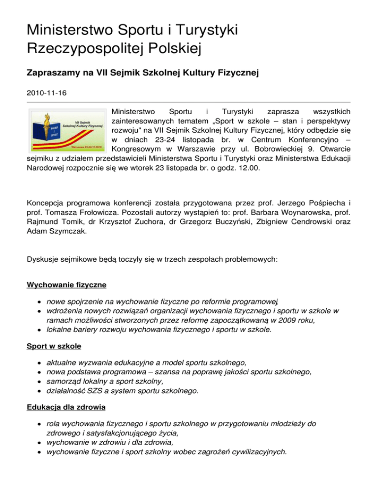 Ministerstwo Sportu i Turystyki Rzeczypospolitej Polskiej Zapraszamy na VII Sejmik Szkolnej Kultury Fizycznej 2010-11-16 Ministerstwo Sportu i Turystyki zaprasza wszystkich zainteresowanych tematem „Sport w szkole – stan i perspektywy rozwoju" na VII Sejmik Szkolnej Kultury Fizycznej, który odbędzie się w dniach 23-24 listopada br. w Centrum Konferencyjno – Kongresowym w Warszawie przy ul. Bobrowieckiej 9. Otwarcie sejmiku z udziałem przedstawicieli Ministerstwa Sportu i Turystyki oraz Ministerstwa Edukacji Narodowej rozpocznie się we wtorek 23 listopada br. o godz. 12.00. Koncepcja programowa konferencji została przygotowana przez prof. Jerzego Pośpiecha i prof. Tomasza Frołowicza. Pozostali autorzy wystąpień to: prof. Barbara Woynarowska, prof. Rajmund Tomik, dr Krzysztof Zuchora, dr Grzegorz Buczyński, Zbigniew Cendrowski oraz Adam Szymczak. Dyskusje sejmikowe będą toczyły się w trzech zespołach problemowych: Wychowanie fizyczne nowe spojrzenie na wychowanie fizyczne po reformie programowej, wdrożenia nowych rozwiązań organizacji wychowania fizycznego i sportu w szkole w ramach możliwości stworzonych przez reformę zapoczątkowaną w 2009 roku, lokalne bariery rozwoju wychowania fizycznego i sportu w szkole. Sport w szkole aktualne wyzwania edukacyjne a model sportu szkolnego, nowa podstawa programowa – szansa na poprawę jakości sportu szkolnego, samorząd lokalny a sport szkolny, działalność SZS a system sportu szkolnego. Edukacja dla zdrowia rola wychowania fizycznego i sportu szkolnego w przygotowaniu młodzieży do zdrowego i satysfakcjonującego życia, wychowanie w zdrowiu i dla zdrowia, wychowanie fizyczne i sport szkolny wobec zagrożeń cywilizacyjnych. Dyskusja poprzedzająca i przygotowująca do sejmiku toczy się obecnie na łamach czasopisma „LIDER" http://lider.szs.pl/ Zaplanowano udział ponad 130 uczestników, w tym pięcioosobowe delegacje z poszczególnych województw złożone z przedstawicieli kuratoriów oświaty, dyrektorów szkół, nauczycieli wf, przedstawicieli Szkolnego Związku Sportowego, a także przedstawicieli środowisk naukowych. Gośćmi sejmiku będą ponadto posłowie z Komisji Kultury Fizycznej i Turystyki Sejmu RP. PROGRAM SEJMIKU 23.XI.2010 r. 1200-1230 Otwarcie obrad - z udziałem przedstawicieli Ministerstwa Sportu i Turystyki oraz Ministerstwa Edukacji Narodowej 1230-1400 I sesja plenarna prof. Jerzy Pośpiech: Współczesne tendencje w europejskim wychowaniu fizycznym i sporcie szkolnym prof. Tomasz Frołowicz: Reforma wychowania fizycznego- szanse i zagrożenia prof. Rajmund Tomik: Sport w polskiej szkole – struktury, finansowanie, regulacje prawne 1400-1530 przerwa 1530- 1700 II sesja plenarna prof. Barbara Woynarowska: Edukacja zdrowotna w wychowaniu fizycznym dr Krzysztof Zuchora: Edukacja olimpijska (Autor zredaguje ostateczną wersję tematu wystąpienia) dr Grzegorz Buczyński: Wyniki kontroli wychowania fizycznego przeprowadzonej przez Najwyższą Izbę Kontroli w latach 2009-2010. 1700-1730 przerwa 1730-1830 I sesja zespołów problemowych 24.XI.2010 r. 900-1030 II sesja zespołów problemowych 1030-1100 przerwa 1100-1230 III sesja zespołów problemowych 1230-1245 przerwa 1245-1415 III sesja plenarna Wnioski z prac zespołów problemowych (referują moderatorzy). Podsumowanie i zamknięcie obrad.