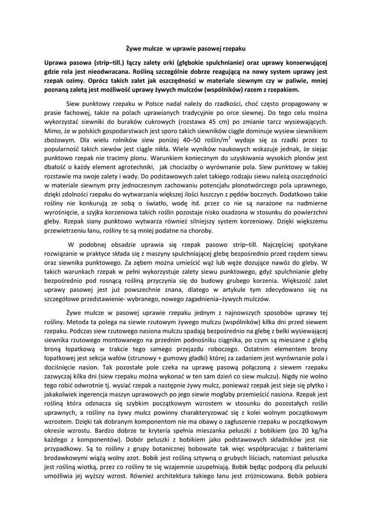 Żywe mulcze w uprawie pasowej rzepaku Uprawa pasowa (strip–till.) łączy zalety orki (głębokie spulchnianie) oraz uprawy konserwującej gdzie rola jest nieodwracana. Rośliną szczególnie dobrze reagującą na nowy system uprawy jest rzepak ozimy. Oprócz takich zalet jak oszczędności w materiale siewnym czy w paliwie, mniej poznaną zaletą jest możliwość uprawy żywych mulczów (wspólników) razem z rzepakiem. Siew punktowy rzepaku w Polsce nadal należy do rzadkości, choć często propagowany w prasie fachowej, także na polach uprawianych tradycyjnie po orce siewnej. Do tego celu można wykorzystać siewniki do buraków cukrowych (rozstawa 45 cm) po zmianie tarcz wysiewających. Mimo, że w polskich gospodarstwach jest sporo takich siewników ciągle dominuje wysiew siewnikiem zbożowym. Dla wielu rolników siew poniżej 40–50 roślin/m2 wydaje się za rzadki przez to popularność takich siewów jest ciągle nikła. Wiele wyników naukowych wskazuje jednak, że siejąc punktowo rzepak nie tracimy plonu. Warunkiem koniecznym do uzyskiwania wysokich plonów jest dbałość o każdy element agrotechniki, jak chociażby o wyrównanie pola. Siew punktowy w takiej rozstawie ma swoje zalety i wady. Do podstawowych zalet takiego rodzaju siewu należą oszczędności w materiale siewnym przy jednoczesnym zachowaniu potencjału plonotwórczego pola uprawnego, dzięki zdolności rzepaku do wytwarzania większej ilości łuszczyn z pędów bocznych. Dodatkowo takie rośliny nie konkurują ze sobą o światło, wodę itd. przez co nie są narażone na nadmierne wyrośnięcie, a szyjka korzeniowa takich roślin pozostaje nisko osadzona w stosunku do powierzchni gleby. Rzepak siany punktowo wytwarza również silniejszy system korzeniowy. Dzięki większemu przewietrzeniu łanu, rośliny te są mniej podatne na choroby. W podobnej obsadzie uprawia się rzepak pasowo strip–till. Najczęściej spotykane rozwiązanie w praktyce składa się z maszyny spulchniającej glebę bezpośrednio przed rzędem siewu oraz siewnika punktowego. Za zębem można umieścić wąż lub węże dozujące nawóz do gleby. W takich warunkach rzepak w pełni wykorzystuje zalety siewu punktowego, gdyż spulchnianie gleby bezpośrednio pod rosnącą rośliną przyczynia się do budowy grubego korzenia. Większość zalet uprawy pasowej jest już powszechnie znana, dlatego w artykule tym zdecydowano się na szczegółowe przedstawienie- wybranego, nowego zagadnienia–żywych mulczów. Żywe mulcze w pasowej uprawie rzepaku jednym z najnowszych sposobów uprawy tej rośliny. Metoda ta polega na siewie rzutowym żywego mulczu (wspólników) kilka dni przed siewem rzepaku. Podczas siew rzutowego nasiona mulczu spadają bezpośrednio na glebę z belki wysiewającej siewnika rzutowego montowanego na przednim podnośniku ciągnika, po czym są mieszane z glebą broną łopatkową w trakcie tego samego przejazdu roboczego. Ostatnim elementem brony łopatkowej jest sekcja wałów (strunowy + gumowy gładki) której za zadaniem jest wyrównanie pola i dociśnięcie nasion. Tak pozostałe pole czeka na uprawę pasową połączoną z siewem rzepaku zazwyczaj kilka dni (siew rzepaku można wykonać w ten sam dzień co siew mulczu). Nigdy nie wolno tego robić odwrotnie tj. wysiać rzepak a następnie żywy mulcz, ponieważ rzepak jest sieje się płytko i jakakolwiek ingerencja maszyn uprawowych po jego siewie mogłaby przemieścić nasiona. Rzepak jest rośliną która odznacza się szybkim początkowym wzrostem w stosunku do pozostałych roślin uprawnych, a rośliny na żywy mulcz powinny charakteryzować się z kolei wolnym początkowym wzrostem. Dzięki tak dobranym komponentom nie ma obawy o zagłuszenie rzepaku w początkowym okresie wzrostu. Bardzo dobrze te kryteria spełnia mieszanka peluszki z bobikiem (po 20 kg/ha każdego z komponentów). Dobór peluszki z bobikiem jako podstawowych składników jest nie przypadkowy. Są to rośliny z grupy botanicznej bobowate tak więc współpracując z bakteriami brodawkowymi wiążą wolny azot. Bobik jest rośliną sztywną o grubych liściach, natomiast peluszka jest rośliną wiotką, przez co rośliny te się wzajemnie uzupełniają. Bobik będąc podporą dla peluszki umożliwia jej wyższy wzrost. Również architektura takiego łanu jest zróżnicowana. Bobik pobiera światło z wyższych pięter natomiast peluszka płożąc się po ziemi zajmuje dolne przestrzenie. Rośliny strączkowe powinny być siane nieco głębiej z uwagi na sposób kiełkowania i dość grube ziarno co w znacznym stopniu ogranicza szybkie (w stosunku do rzepaku) wschody, co również umożliwia rzepakowi normalny wzrost. Korzystnym zjawiskiem jest zakwitnięcie żywego mulczu przed zimą, ponieważ w tej fazie są one bardzo wrażliwe na mróz przez co szybko obumierają. Do takiej mieszanki można też dodać 10 kg/ha wyki jarej oraz ok. 2 kg/ha koniczyny czerwonej. Od kilku lat w Ryczeniu (woj.dolnośląskie) testuje się możliwość wprowadzania w międzyrzędzia roślin, które wspólnie rosną z rzepakiem do zimy– żywych mulczów. Idea zrodziła, się po obserwacjach pól uprawianych pasowo. Rzepak ozimy wysiewa się w naszych warunkach w okresie 15–30 sierpnia, tak więc szkoda aby ten czas się „marnował” a taki podsiew wzbogaca stanowisko. W okresie sierpień–październik jeśli zachodzą optymalne warunki wodne rośliny intensywnie wegetują, dotyczy to także żywego mulczu w międzyrzędziu. Przy rozstawie rzędów wynoszącej 45 cm około 70% gleby w początkowym okresie wegetacji rzepaku jest wolna i w te miejsce wykorzystuje żywy mulcz. Trudno jednoznacznie stwierdzić ile masy można wprowadzić w ten sposób do gleby, ale w gospodarstwach w których nie używa się pługa celem rolnika powinno być nieustanne wprowadzanie nowej materii organicznej. W przypadku międzyplonów znaczenie mają nie tylko części nadziemne (łodygi i liscie) i części podziem