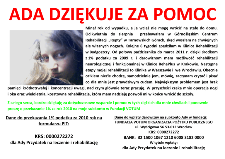 ADA DZIĘKUJE ZA POMOC Minął rok od wypadku, a ja wciąż nie mogę wrócić na stałe do domu. Od kwietnia do sierpnia przebywałam w Górnośląskim Centrum Rehabilitacji „Repty” w Tarnowskich Górach, skąd wyszłam na chwiejnych ale własnych nogach. Kolejne 6 tygodni spędziłam w Klinice Rehabilitacji w Bydgoszczy. Od połowy października do marca 2011 r. dzięki środkom z 1% podatku za 2009 r. i darowiznom mam możliwość rehabilitacji neurologicznej i funkcjonalnej w Klinice RehaPlus w Krakowie. Następne etapy mojej rehabilitacji to Klinika w Warszawie i we Wrocławiu. Obecnie całkiem nieźle chodzę, samodzielnie jem, mówię, zaczynam czytać i pisać co dla mnie jest prawdziwym cudem. Największym problemem jest brak pamięci krótkotrwałej i koncentracji uwagi, nad czym głównie teraz pracuję. W przyszłości czeka mnie operacja nogi i oka oraz wieloletnia, kosztowna rehabilitacja, która mam nadzieję pozwoli mi w końcu wrócić do szkoły. Z całego serca, bardzo dziękuję za dotychczasowe wsparcie i pomoc w tych ciężkich dla mnie chwilach i ponownie proszę o przekazanie 1% za rok 2010 na moje subkonto w Fundacji VOTUM Dane do przekazania 1% podatku za 2010 rok na formularzu PIT: Dane do wpłaty darowizny na subkonto Ady w fundacji: FUNDACJA VOTUM ORGANIZACJA POŻYTKU PUBLICZNEGO ul. Wyścigowa 56 53-012 Wrocław KRS: 0000272272 KRS: 0000272272 BANK: 32 1500 1067 1210 6008 3182 0000 dla Ady Przydatek na leczenie i rehabilitację W tytule wpłaty: dla Ady Przydatek na leczenie i rehabilitację
