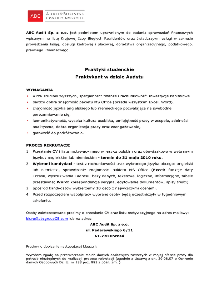 ABC Audit Sp. z o.o. jest podmiotem uprawnionym do badania sprawozdań finansowych wpisanym na listę Krajowej Izby Biegłych Rewidentów oraz świadczącym usługi w zakresie prowadzenia ksiąg, obsługi kadrowej i płacowej, doradztwa organizacyjnego, podatkowego, prawnego i finansowego. Praktyki studenckie Praktykant w dziale Audytu WYMAGANIA V rok studiów wyŜszych, specjalność: finanse i rachunkowość, inwestycje kapitałowe bardzo dobra znajomość pakietu MS Office (przede wszystkim Excel, Word), znajomość języka angielskiego lub niemieckiego pozwalająca na swobodne porozumiewanie się, komunikatywność, wysoka kultura osobista, umiejętność pracy w zespole, zdolności analityczne, dobra organizacja pracy oraz zaangaŜowanie, gotowość do podróŜowania. PROCES REKRUTACJI 1. Przesłanie CV i listu motywacyjnego w języku polskim oraz obowiązkowo w wybranym języku: angielskim lub niemieckim - termin do 31 maja 2010 roku. 2. Wybrani kandydaci - test z rachunkowości oraz wybranego języka obcego: angielski lub niemiecki, sprawdzenie znajomości pakietu MS Office (Excel: funkcje daty i czasu, wyszukiwania i adresu, bazy danych, tekstowe, logiczne, informacyjne, tabele przestawne; Word: korespondencja seryjna, edytowanie dokumentów, spisy treści) 3. Spośród kandydatów wybierzemy 10 osób z najwyŜszymi ocenami. 4. Przed rozpoczęciem współpracy wybrane osoby będą uczestniczyły w tygodniowym szkoleniu. Osoby zainteresowane prosimy o przesłanie CV oraz listu motywacyjnego na adres mailowy: [email protected] lub na adres: ABC Audit Sp. z o.o. ul. Paderewskiego 6/11 61-770 Poznań Prosimy o dopisanie następującej klauzuli: WyraŜam zgodę na przetwarzanie moich danych osobowych zawartych w mojej ofercie pracy dla potrzeb niezbędnych do realizacji procesu rekrutacji (zgodnie z Ustawą z dn. 29.08.97 o Ochronie danych Osobowych Dz. U. nr 133 poz. 883 z póŜn. zm. )