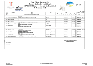 Finał Winter Dressage Cup Zawody Regionalne w ujeżdżeniu HIPODROM Sopot Sopocki Klub Jeździecki 7 - 8 marzec 2015 P-2 Sopot 8,03,2014 No. Start No. 1 043 2 028 3 032 4 012 5 015 Zawodnik Koń Competitor Horse sex\breed\colour\sire\dam/siredam\born\Pass.No\ Frau Fugger kl\old\kara\Fürst Fugger\Wicomaggia / Dimaggio2010 Marco Marta Orlowska \\ Brando Grand Maura Reszuta wal\wlkp\siwa\Grand de la Cour\Bandola / Arszenik\2008 Elekt Paula Januszewska-Klimczak og\xo\cgn\Leksykon \Edena / Eternit\2000 Ewa Kalicka Rokosz wal\sp\c.gn\Elf \Rewolta / Horyń\1999 Anna Tyrkiel-Baranowska 1 034 Wiktoria Sagan 2 002 Julia Bilicka 3 011 Klaudia Hałeła 4 045 Weronika Winiarska Fontain /kuc/ wal\kuc\Guinness \Fauna / Faruk\2006 STENVAENGE CHARLES /kuc/ wal\c.gn\kuc\Innellan Kestrel\Liv / NN\2002 Buttini /kuc/ wal\kara\kuc\Broadway \Boquet / Bolero\2002 Jacky 35 /kuc/ wal\DRP\bul\Victorias Ornat\Windrose / Weras\1997 Klub E H pl bpk POM 61,061% SKJ Total 2 64,697% 1 62,879% 150 zł 61,515% 1 62,576% 2 62,045% SKJ Sopot 57,576% 3 62,424% 3 60,000% bpk POM 56,667% 4 57,879% 5 57,273% 55,000% 5 58,939% 4 56,970% PEGAZ Reda 61,970% 2 65,000% 2 63,485% 120 zł Pomorska Liga Jeździecka 60,758% 3 65,455% 1 63,106% Pomorska Liga Jeździecka 62,879% 1 61,818% 3 62,348% KJ Pegaz Reda 56,364% 4 57,273% 4 56,818% % pl NAGRODA pl % pl B % KSPSK Kwieki pl M C % % ______________________________ Sędzia Główny/ President of Ground Jury Wacław Pruchniewicz EHC- W. Pruchniewicz MB- A. Piasecka 692 991 471 www.htezawody.pl Procent Wyniki HTE marketing Jacek Ryczywolski godz. wydruku 18:24 Finał Winter Dressage Cup Zawody Regionalne w ujeżdżeniu HIPODROM Sopot Sopocki Klub Jeździecki 7 - 8 marzec 2015 N-5 Sopot 8,03,2014 No. Start No. 1 2 3 4 5 6 7 1 Zawodnik Koń Competitor Horse sex\breed\colour\sire\dam/siredam\born\Pass.No\ 005 Sonia Chwirot 021 Paula Mańczak 042 Blanka Turska 009 Agata Gietka 040 Alicja Trawińska 036 Olga Starsierska 031 Maura Reszuta 002 Julia Bilicka Klub E % Madera kl\siwa\Elmero \Medyka / Mangan\1999 Donna Karan 13 kl\han\kara\Don Crusador \Rieke / Rotspon\2008 Discovery wal\han\c.gn\Don Henrico\Allice / Argentan\2008 Thoswin Veldhoek \\ Diego Ramirez \\ Foxi kl\wlkp\siwa\Agar \Fakiria / Fakir\2002 Roland wal\wlkp\gn\Le Voltaire\Rolanda / Los\2002 SKJ STENVAENGE CHARLES /kuc/ wal\c.gn\kuc\Innellan Kestrel\Liv / NN\2002 Pomorska Liga Jeździecka CSJ Coval Biały Bór CSJ COVA BB KJ Młyńska Struga bpk KJ Pegaz Reda SKJ Sopot H pl % M C pl % pl % B pl % pl NAGRODA Total 59,571% 2 60,429% 2 62,429% 1 60,810% 180 zł 60,857% 1 59,714% 3 61,429% 2 60,667% 100 zł 58,143% 3 58,857% 4 59,571% 3 58,857% 56,286% 5 60,714% 1 59,000% 4 58,667% 57,429% 4 58,857% 4 56,857% 6 57,714% 53,143% 6 56,286% 6 57,000% 5 55,476% 51,286% 7 51,429% 7 53,286% 7 52,000% 63,143% 1 63,000% 1 62,714% 1 62,952% 40 zł ______________________________ Sędzia Główny/ President of Ground Jury Wacław Pruchniewicz EH- W. Pruchniewicz C- A. Piasecka MB- Z. Górska 692 991 471 www.htezawody.pl Procent Wyniki HTE marketing Jacek Ryczywolski godz. wydruku 18:24 Finał Winter Dressage Cup Zawody Regionalne w ujeżdżeniu HIPODROM Sopot Sopocki Klub Jeździecki 7 - 8 marzec 2015 CS-2 Sopot 8,03,2014 No. Start No. Zawodnik Koń Competitor Horse sex\breed\colour\sire\dam/siredam\born\Pass.No\ 1 014 Tomasz Jasiński 2 006 Mateusz Cichoń Klub E % Teo wal\KWPN\siwy\Democraat \Helga / Uniform\1999 Sini Santos RF M\bay\wurt\ Sir Oldenburg\Dufte Bine B/ Dream of Heidelberg H pl % M C pl % pl % B pl % pl NAGRODA Total KSJ Zagozd 66,200% 1 62,900% 1 63,500% 1 64,200% 120 zł KJ Lider 61,100% 2 62,700% 2 58,900% 2 60,900% ______________________________ Sędzia Główny/ President of Ground Jury Wacław Pruchniewicz EH- Z. Górska C- A. Piasecka MB- W. Pruchniewicz 692 991 471 www.htezawody.pl Procent Wyniki HTE marketing Jacek Ryczywolski godz. wydruku 18:24 Finał Winter Dressage Cup Zawody Regionalne w ujeżdżeniu HIPODROM Sopot Sopocki Klub Jeździecki 7 - 8 marzec 2015 C-1 Sopot 8,03,2014 No. Start No. 1 2 3 4 1 Zawodnik Koń Competitor Horse sex\breed\colour\sire\dam/siredam\born\Pass.No\ 042 Blanka Turska 009 Agata Gietka 008 Aleksandra Furgo 030 Joanna Plata 003 Bianca Blumel 039 Alicja Trawińska Klub E % Discovery wal\han\c.gn\Don Henrico\Allice / Argentan\2008 Thoswin Veldhoek \\ Donna Larra P kl\sp\gn\Larron \Dunka / Davidoff\2006 Cyna kl\trak\kaszt\Machandel \Cypia / Pigmalion\2007 Nelano wal\sp\gn\Liban \Niezapominajka / Davidoff\2006 CSJ COVA BB Rocardo /kuc/ wal\DRP\Rashing Boy\Ordrina/Orcus\2004 bpk KJ Młyńska Struga KJ Leśna Podkowa Pomorska Liga Jeździecka H pl M C % pl % pl 60,735% 2 61,324% 60,882% 1 59,265% 56,471% B pl NAGRODA Total % pl 1 59,853% 2 60,637% 250 zł 59,706% 2 61,029% 1 60,539% 3 57,206% 3 57,353% 3 57,941% 4 52,206% 4 51,029% 4 53,235% % KJ Koński Gaj elim. 64,559% 1 62,794% 1 61,765% 1 63,039% 50 zł ______________________________ Sędzia Główny/ President of Ground Jury Wacław Pruchniewicz EH- Z. Górska C- W. Pruchniewicz MB- A. Piasecka 692 991 471 www.htezawody.pl Procent Wyniki HTE marketing Jacek Ryczywolski godz. wydruku 18:24 Finał Winter Dressage Cup Zawody Regionalne w ujeżdżeniu HIPODROM Sopot Sopocki Klub Jeździecki 7 - 8 marzec 2015 C-3 Sopot 8,03,2014 No. Start No. 1 2 3 4 1 Zawodnik Koń Competitor Horse sex\breed\colour\sire\dam/siredam\born\Pass.No\ 019 Aleksandra Lesner 007 Kornelia Domagalska 005 Sonia Chwirot 008 Aleksandra Furgo 039 Alicja Trawińska Klub Ogólne KJ Pegaz Reda Rocardo /kuc/ wal\DRP\Rashing Boy\Ordrina/Orcus\2004 bpk POM PLJ SKJ KJ Leśna Podkowa M C pl % pl % B pl % pl NAGRODA Total 66,447% 1 63,158% 1 64,605% 1 64,737% 200 zł 61,974% 2 60,263% 3 61,579% 2 61,272% 60,658% 3 60,395% 2 61,316% 3 60,789% 55,921% 4 57,105% 4 55,789% 4 56,272% 63,289% 1 62,105% 1 61,842% 1 62,412% 50 zł ______________________________ Sędzia Główny/ President of Ground Jury Wacław Pruchniewicz EH- A. Piasecka C- Z. Górska MB- W. Pruchniewicz 692 991 471 www.