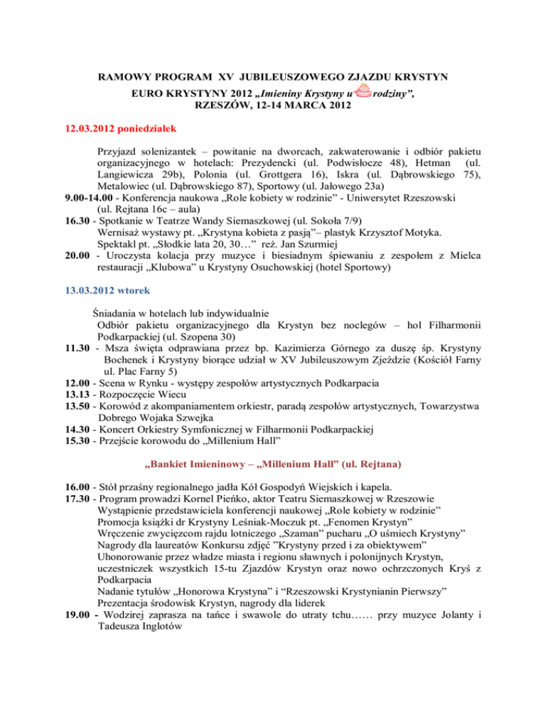 RAMOWY PROGRAM XV JUBILEUSZOWEGO ZJAZDU KRYSTYN EURO KRYSTYNY 2012 „Imieniny Krystyny u RZESZÓW, 12-14 MARCA 2012 rodziny”, 12.03.2012 poniedziałek Przyjazd solenizantek – powitanie na dworcach, zakwaterowanie i odbiór pakietu organizacyjnego w hotelach: Prezydencki (ul. Podwisłocze 48), Hetman (ul. Langiewicza 29b), Polonia (ul. Grottgera 16), Iskra (ul. Dąbrowskiego 75), Metalowiec (ul. Dąbrowskiego 87), Sportowy (ul. Jałowego 23a) 9.00-14.00 - Konferencja naukowa „Role kobiety w rodzinie” - Uniwersytet Rzeszowski (ul. Rejtana 16c – aula) 16.30 - Spotkanie w Teatrze Wandy Siemaszkowej (ul. Sokoła 7/9) Wernisaż wystawy pt. „Krystyna kobieta z pasją”– plastyk Krzysztof Motyka. Spektakl pt. „Słodkie lata 20, 30…” reż. Jan Szurmiej 20.00 - Uroczysta kolacja przy muzyce i biesiadnym śpiewaniu z zespołem z Mielca restauracji „Klubowa” u Krystyny Osuchowskiej (hotel Sportowy) 13.03.2012 wtorek Śniadania w hotelach lub indywidualnie Odbiór pakietu organizacyjnego dla Krystyn bez noclegów – hol Filharmonii Podkarpackiej (ul. Szopena 30) 11.30 - Msza święta odprawiana przez bp. Kazimierza Górnego za duszę śp. Krystyny Bochenek i Krystyny biorące udział w XV Jubileuszowym Zjeździe (Kościół Farny ul. Plac Farny 5) 12.00 - Scena w Rynku - występy zespołów artystycznych Podkarpacia 13.13 - Rozpoczęcie Wiecu 13.50 - Korowód z akompaniamentem orkiestr, paradą zespołów artystycznych, Towarzystwa Dobrego Wojaka Szwejka 14.30 - Koncert Orkiestry Symfonicznej w Filharmonii Podkarpackiej 15.30 - Przejście korowodu do „Millenium Hall” „Bankiet Imieninowy – „Millenium Hall” (ul. Rejtana) 16.00 - Stół przaśny regionalnego jadła Kół Gospodyń Wiejskich i kapela. 17.30 - Program prowadzi Kornel Pieńko, aktor Teatru Siemaszkowej w Rzeszowie Wystąpienie przedstawiciela konferencji naukowej „Role kobiety w rodzinie” Promocja książki dr Krystyny Leśniak-Moczuk pt. „Fenomen Krystyn” Wręczenie zwycięzcom rajdu lotniczego „Szaman” pucharu „O uśmiech Krystyny” Nagrody dla laureatów Konkursu zdjęć ”Krystyny przed i za obiektywem” Uhonorowanie przez władze miasta i regionu sławnych i polonijnych Krystyn, uczestniczek wszystkich 15-tu Zjazdów Krystyn oraz nowo ochrzczonych Kryś z Podkarpacia Nadanie tytułów „Honorowa Krystyna” i “Rzeszowski Krystynianin Pierwszy” Prezentacja środowisk Krystyn, nagrody dla liderek 19.00 - Wodzirej zaprasza na tańce i swawole do utraty tchu…… przy muzyce Jolanty i Tadeusza Inglotów Fakultatywne spotkania: Plastyków – Krystyny: Bileńki, Niebudek Gawron (galeria II piętro) Literackie – Krystyny: Januszewska, Konecka, Lenkowska (prowadzi Adam Bienias) (kawiarnia przy księgarni Matras) 20.00 - Koncert – Jan Wojdak i Wawele, prowadzenie Jan Stępień, Polskie Radio Kraków Taniec z Krystynami 21.00 Niespodzianki dla Krystyn Jubilatek urodzonych 13 marca – wariacje cukiernicze (Cukiernia Juliusz Orłowski & Kazimierz Rak) Rewia strojów świata (Chiny, Dubaj, Hawaje, Hiszpania, Kuba, itp.) istnieje możliwość zgłoszenia w kwestionariuszu swojego występu Chrzest Krystyny Cd. tańce i swawole do utraty tchu…… 22.30 - Niespodzianka płonąca Cd. tańce i swawole do utraty tchu…… 14.03.2012 środa 8.00 - Śniadania w hotelach 9.00 - Wycieczka do Łańcuta – zwiedzanie Zamku-Muzeum, powozowni, oranżerii, storczykarni. Objazd autokarem po Rzeszowie z przewodnikiem 14.00 - Obiady w hotelach Lub wycieczki fakultatywne: 5.00 - do Lwowa (14/15.03.12 - nocleg, wyżywienie, zwiedzanie m.in. słynnego Cmentarza Łyczakowskiego i Orląt Lwowskich, Galerii bogatej w obrazy malarzy polskich, zwiedzanie miasta, Opery Lwowskiej, dyskoteka) 9.00 - do Łańcuta i Krasiczyna - zwiedzanie Zamku-Muzeum, powozowni, oranżerii, storczykarni w Łańcucie, zwiedzanie Zamku-Muzeum w Krasiczynie W czasie trwania Zjazdu funkcjonuje: KIERMASZ SZTUKI LUDOWEJ PODKARPACIA KKK - KOBIECY KĄCIK KRYSTYN: Modna Krystyna od stóp do głów – promocyjne ceny w wybranych salonach w „Millenium Hall” oraz w salonach obuwniczych „Prima Strada” - Karta Stałego Klienta od Krystyny Sitek Bibliofilów – promocyjne ceny książek w Antykwariacie u Krystyny Szkutnik (ul. Mickiewicza 17) Fotograficzny – zdjęcie w nakryciu głowy dwórki królewskiej na tle panoramy Rzeszowa (w hotelach) Fryzjerski – promocyjne ceny na usługi fryzjerskie w salonach w „Millenium Hall” Kosmetyczny - promocyjne ceny na usługi kosmetyczne w salonach w „Millenium Hall” i w salonie Krystyny Szczęch „Gloria” ul. (3 Maja 7) Medyczny – lekarki Krystyny: Batorska-Lewkowicz, Weglowska-Kalinka („Millenium Hall”) Psychologiczny – psycholog: Barbara Marczuk prawdę Ci powie……(„Millenium Hall”) A jak psycholog nie pomoże to pomoże może… wino SANTA CHRISTINA TOSCANIA w promocyjnej cenie dla solenizantek (LOVE BAR „Millenium Hall” – parter) Dodatkowe atrakcje: 1) Mecz piłki nożnej „Eurokrystyny contra Księża” (11.03. godz.17.00 stadion ”Orlik” w Hyżnem) 2) Filmy o Krystynach i z Krystynami (10-16.03. Multikino w „Millenium Hall”) 3) Zwiedzanie Muzeum Dobranocek (10-16.03. gratis, ul. Mickiewicza 13) 4) Zwiedzanie Podziemnej Trasy Turystycznej w Rynku Rzeszowa (gratis - zapisy grup w kasie PTT) 5) Zwiedzanie Muzeum Wódek w Łańcucie z degustacją (11.03. i 16.03. godz. 10.00 gratis 2 grupy po 20 osób) z możliwością zwiedzania Muzeum-Zamku i powozowni w Łańcucie (zapisy i opłata za przejazd w recepcji hotel Sportowy) 6) Uczestnictwo w godzinnej sesji coachingowej prowadzonej przez Krystynę JagielskąGasińską ze Szwecji "Czy życie może być jaśniejsze, lżejsze, bardziej ukierunkowane, wdzięczniejsze?", "Jaśniejsza strona życia", "Dążenie do celu" (14.03. po obiedzie - 2 grupy po 30 osób, gratis – decyduje kolejność zgłoszeń, świetlica - hotel „Sportowy”) . 7) Indywidualny pobyt w Bieszczadach w gospodarstwach agrot