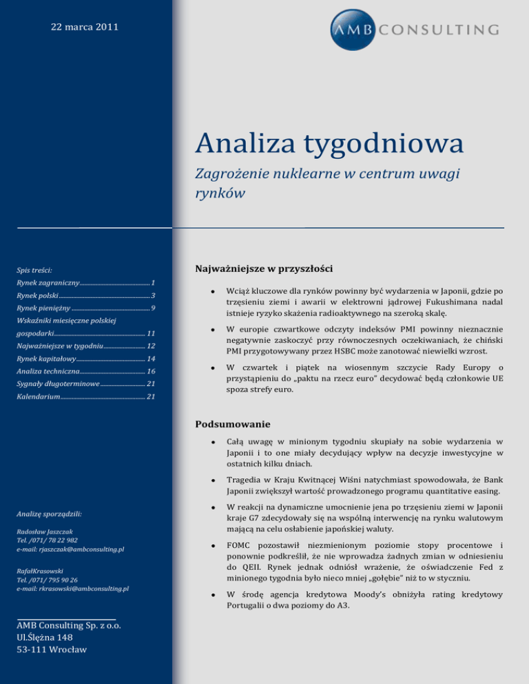 22 marca 2011 Analiza tygodniowa Zagrożenie nuklearne w centrum uwagi rynków Spis treści: Rynek zagraniczny ............................................ 1 Rynek polski ......................................................... 3 Rynek pieniężny ................................................. 9 Wskaźniki miesięczne polskiej gospodarki ......................................................... 11 Najważniejsze w tygodniu .......................... 12 Rynek kapitałowy ........................................... 14 Analiza techniczna......................................... 16 Sygnały długoterminowe ............................ 21 Kalendarium ..................................................... 21 Najważniejsze w przyszłości Wciąż kluczowe dla rynków powinny być wydarzenia w Japonii, gdzie po trzęsieniu ziemi i awarii w elektrowni jądrowej Fukushimana nadal istnieje ryzyko skażenia radioaktywnego na szeroką skalę. W europie czwartkowe odczyty indeksów PMI powinny nieznacznie negatywnie zaskoczyć przy równoczesnych oczekiwaniach, że chiński PMI przygotowywany przez HSBC może zanotować niewielki wzrost. W czwartek i piątek na wiosennym szczycie Rady Europy o przystąpieniu do „paktu na rzecz euro” decydować będą członkowie UE spoza strefy euro. Podsumowanie Całą uwagę w minionym tygodniu skupiały na sobie wydarzenia w Japonii i to one miały decydujący wpływ na decyzje inwestycyjne w ostatnich kilku dniach. Tragedia w Kraju Kwitnącej Wiśni natychmiast spowodowała, że Bank Japonii zwiększył wartość prowadzonego programu quantitative easing. Analizę sporządzili: Radosław Jaszczak Tel. /071/ 78 22 982 e-mail: [email protected] RafałKrasowski Tel. /071/ 795 90 26 e-mail: [email protected] AMB Consulting Sp. z o.o. Ul.Ślężna 148 53-111 Wrocław W reakcji na dynamiczne umocnienie jena po trzęsieniu ziemi w Japonii kraje G7 zdecydowały się na wspólną interwencję na rynku walutowym mającą na celu osłabienie japońskiej waluty. FOMC pozostawił niezmienionym poziomie stopy procentowe i ponownie podkreślił, że nie wprowadza żadnych zmian w odniesieniu do QEII. Rynek jednak odniósł wrażenie, że oświadczenie Fed z minionego tygodnia było nieco mniej „gołębie” niż to w styczniu. W środę agencja kredytowa Moody’s obniżyła rating kredytowy Portugalii o dwa poziomy do A3. Analiza tygodniowa z dn. 22.03.2011 Rynek zagraniczny Wydarzenia w USA Obecny tydzień nie obfituje w publikacje makroekonomiczne, przede wszystkim w odniesieniu do amerykańskiej gospodarki. W poniedziałek na rynek napłynęły już dane nt. sprzedaży domów na rynku wtórnym w lutym. Okazały się one dużo gorsze od prognoz – w tempie annualizowanym sprzedano w lutym 4,88 mln domów wobec prognoz na poziomie 5,1 mln oraz ostatniego odczytu 5,4 mln. W środę opublikowane zostaną jeszcze wyniki sprzedaży nowych domów. Jednak i w tym przypadku rynek oczekuje gorszych aniżeli przed miesiącem odczytów. Jeżeli tak rzeczywiście się stanie, będzie to kolejny argument dla Fed świadczący o słuszności wciąż prowadzonych programów stymulujących. Wciąż bowiem nie widać trwałej poprawy na rynku nieruchomości a pamiętajmy, że po drugiej wojnie światowej nie było w amerykańskiej gospodarce wyjścia z recesji bez poprawy na tym rynku. W obecnym tygodniu poznamy także dynamikę zamówień na dobra trwałego użytku w lutym oraz ostateczną wartość indeksu Uniwersytetu Michigan w marcu. W przypadku tego ostatniego, przede wszystkim ze względu na bardzo wyraźny w ostatnim czasie wzrost cen paliw, możemy obserwować wyraźny spadek. Rynek oczekuje, że osiągnie on wartość 68,2 pkt. wobec 77,5 pkt. w lutym. Warto zwrócić uwagę przede wszystkim na oczekiwania inflacyjne będące częścią indeksu. We wstępnej publikacji indeksu właśnie za marzec, oczekiwania inflacyjne w perspektywie pięciu lat wzrosły wobec ostatniego odczytu z 2,9 proc. do 3,2 proc. Jeżeli tendencja ta potwierdzi się, będzie to amunicja dla jastrzębiej części Fed opowiadającej się za ograniczaniem programów pomocowych. A w obecnym tygodniu nie zabraknie właśnie wypowiedzi przedstawicieli Fed. Przede wszystkim w środę w San Diego swoją prelekcję będzie miał Ben Bernanke, w którą rynek może się bacznie wsłuchiwać. Wydarzenia w strefie euro Kluczowym wydarzeniem w strefie euro będzie szczyt Unii Europejskiej w czwartek i piątek. Na szczycie tym okaże się, które kraje przystąpią do „paktu na rzecz konkurencyjności”. W miniony piątek węgierski dyplomata powiedział: „Kraje strefy euro na szczycie przedstawią pierwsze konkretne zobowiązania. Kraje pozostałej dziesiątki, która nie należy do strefy euro, będą miały okazję, by powiedzieć, czy wchodzą do paktu”. Nie ma bowiem żadnych reguł i wymogów jakie kraje spoza strefy euro mogą wstąpić w ramy nowego paktu. Jedynym warunkiem jest zgoda na realizację jego wymogów: będą zbliżać swoje polityki gospodarcze w ramach zatrudnienia, konkurencyjności gospodarczej czy stabilności finansowej. W dokumencie przeczytać można: Konkurencyjność ma zasadnicze znaczenie dla szybszego i trwalszego wzrostu UE w perspektywie średnio- i długoterminowej, dla podniesienia poziomu dochodów obywateli i dla zachowania naszych modeli społecznych. Zachęca się państwa członkowskie spoza strefy euro do uczestniczenia w pakcie na zasadzie dobrowolności. www.ambconsulting.pl 1 Analiza tygodniowa z dn. 22.03.2011 Polska już zapowiedziała, że weźmie udział w projekcie. Premier, Donald Tusk powiedział 11 marca w Bruseli: Polska jest gotowa do przystąpienia do paktu. (...) Z satysfakcją mogę powiedzieć, że obawa, że wzmocni się pokusa tworzenia dwóch prędkości (...), została zażegnana. W tej kwestii jestem dużo spokojniejszy niż wtedy, kiedy pomysł paktu się rodził. Oprócz Polski przystąpienie do paktu zapowiedziała już Dania. Wielce praw