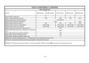 MASY SAMOCHODU C-CROSSER Masa pojazdu (kg) CH7W XJSFZL6/R6 XJHFZL6/R6 XJXFZL6/R6 Liczba miejsc siedzących 5 7 Masa w stanie gotowym do jazdy 1790 1825 Dopuszczalna masa całkowita pojazdu 2410 [2510] Dopuszczalny nacisk na przednią oś 1030 Dopuszczalny nacisk na tylną oś 760 800 Dopuszczalny nacisk na oś (przednią) 1150 [1150] 1110 [1150] Dopuszczalny nacisk na oś (tylną) 1260 [1440] 1300 [1440] Dopuszczalna masa całkowita z przyczepą (*) 4510 Masa maksymalna przyczepy z hamulcem - Nachylenie 2000 12 % Masa maksymalna przyczepy bez hamulca 750 Maksymalny nacisk na hak holowniczy 100 Maksymalne obciąŜenie drąŜków dachowych 8 Maksymalny nacisk na hak holowniczy = ObciąŜenie pionowe haka holowniczego (CVA) Wartości w nawiasach kwadratowych dotyczą pojazdów z hakiem holowniczym XJPFZL6/R6 5 1790 7 1825 760 1150 [1150] 1260 [1440] 1025 800 1110 [1150] 1300 [1440] UWAGA: (*) Dopuszczalna masa całkowita z przyczepą maleje o 10% na kaŜde 1000 m wysokości nad poziomem morza. 14 XJDFZL6/R6
