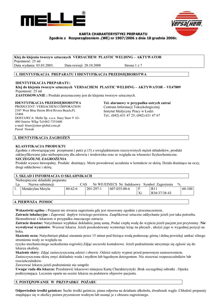 Klej do klejenia tworzyw sztucznych VERSACHEM PLASTIC WELDING – AKTYWATOR Pojemność: 25 ml Data wydania: 03.03.2003. Data rewizji: 20.10.2008 Strona 1 z 7 1. IDENTYFIKACJA PREPARATU I IDENTYFIKACJA PRZEDSIĘBIORSTWA IDENTYFIKACJA PREPARATU: Klej do klejenia tworzyw sztucznych VERSACHEM PLASTIC WELDING – AKTYWATOR – VE47809 Pojemność: 25 ml ZASTOSOWANIE : Produkt przeznaczony jest do klejenia tworzyw sztucznych. IDENTYFIKACJA PRZEDSIĘBIORSTWA PRODUCENT: VERSACHEM CORPORATION 2107 West Blue Heron Blvd Rivera Beach,FL 33404 DOSTAWCA: Melle Sp. z.o.o. Stary Staw 9 63400 Ostrów Wlkp Tel:062-7351600 e-mail: [email protected] Paweł Nowak Tel. alarmowy w przypadku ostrych zatruć Centrum Informacji Toksykologicznej Instytut Medycyny Pracy w Łodzi Tel.: (042) 631 47 25; (042) 631 47 67 2. IDENTYFIKACJA ZAGROśEŃ KLASYFIKACJA PRODUKTU Zgodnie z obowiązującymi przepisami ( patrz p.15) z uwzględnieniem rzeczywistych stęŜeń składników, produkt zaklasyfikowano jako niebezpieczny dla zdrowia i środowiska oraz ze względu na własności fizykochemiczne. SZCZEGÓLNE ZAGROśENIA Produkt wysoce łatwopalny. Produkt draŜniący. MoŜe powodować uczulenia w kontakcie ze skórą. Działa draŜniąco na oczy, drogi oddechowe i skórę. 3. SKŁAD I INFORMACJA O SKŁADNIKACH Niebezpieczne składniki preparatu: Lp. Nazwa substancji CAS Nr WE/EINECS Nr. Indeksowy Symbol ZagroŜenia 1. Metakrylan Metylu 80-62-6 201-297-1 607-035-00-6 F R11 Xi R36/37/38-43 % 60-100 4. PIERWSZA POMOC Wskazówki ogólne : Preparat nie stwarza zagroŜenia gdy jest stosowany zgodnie z przeznaczeniem.. Zatrucie inhalacyjne : Zapewnić dopływ świeŜego powietrza. Zaaplikować sztuczne oddychanie jeŜeli jest taka potrzeba. Skonsultować z lekarzem w przypadku znaczącego zatrucia. Zatrucie doustne: Natychmiast wypłukać dokładnie jamę ustną .Podać ciepłą wodę do wypicia jeŜeli pacjent jest przytomny .Nie wywoływać wymiotów. Wezwać lekarza .JeŜeli poszkodowany wymiotuje leŜąc na plecach , ułoŜyć jego w wygodnej pozycji na boku. SkaŜenie oczu: Natychmiast płukać starannie przez 15 minut pod bieŜąca wodą podnosząc górną i dolną powiekę( unikać silnego strumienia wody ze względu na ryzyko mechanicznego uszkodzenia rogówki).Zdjąć soczewki kontaktowe. JeŜeli podraŜnienie utrzymuje się zgłosić się do lekarza okulisty. SkaŜenie skóry: Zdjąć zanieczyszczoną odzieŜ i obuwie .OdzieŜ naleŜy wyprać przed ponownym zastosowaniem. Zanieczyszczona skórę zmyć dokładnie woda i mydłem lub łagodnym detergentem .Nie stosować rozpuszczalników lub rozcieńczalników. Zawezwać lekarza jeŜeli podraŜnienie nie ustąpiło Uwaga/ rada dla lekarza: Przedstawić lekarzowi niniejsza Kartę Charakterystyki .Brak szczególnej odtrutki . Opieka podtrzymująca. Leczenie oparte na ocenie lekarza na podstawie objawów pacjenta. 5. POSTĘPOWANIE W PRZYPADKU POśARU Odpowiednie środki gaśnicze: Suche środki gaśnicze, piana odporna na działanie alkoholu, dwutlenek węgla .Chłodzić preparaty znajdujące się w okolicy poŜaru prysznicem wodnym lub usunąć je z obszaru zagroŜonego. Klej do klejenia tworzyw sztucznych VERSACHEM PLASTIC WELDING – AKTYWATOR Pojemność: 25 ml strona 2 z 7 Środki gaśnicze , których nie wolno uŜywać ze względów bezpieczeństwa: Gaszenie pełnym strumieniem wody poniewaŜ moŜe to spowodować rozrzucanie i rozszerzanie ognia. Środki ochrony indywidualnej dla straŜaków: UŜywać zabezpieczeń dla górnych dróg oddechowych , sprzęt ochronny dróg oddechowych –taki jak na wyposaŜeniu straŜaków oraz ubranie ochronne. ZagroŜenia związane ze spalaniem: Nie naleŜy wdychać dymów. Jest moŜliwość wystąpienia polimeryzacji .. Przy poŜarze duŜych ilości materiału moŜe wystąpić gwałtowna polimeryzacja tworząc znaczny wzrost produktów rozkładu termicznego i/ lub pęknięcie opakowań. MoŜliwe tworzenie wybuchowych mieszanin z powietrzem .MoŜliwość powstawania niebezpiecznych gazów i par. Inne wskazówki: Wystrzegać się zapłonu wstecznego .Zachować środki ostroŜności dla uniknięcia wyładowań elektrostatycznych. 6. POSTĘPOWANIE W PRZYPADKU NIEZAMIERZONEGO UWOLNIENIA DO ŚRODOWISKA Środki ochrony indywidualnej: Nie wdychać par. UŜywać masek ochronnych ,gumowych rękawic i innych zalecanych przez przepisy BHP ubrań roboczych. Przestrzegać przepisów bezpieczeństwa pkt 7 i 8. Środki ostroŜności w zakresie ochrony środowiska: Zapobiec przedostaniu się do ziemi , podłoŜa oraz kanalizacji ryzyko wybuchu. Metody oczyszczania: Małe ilości rozlanej cieczy zebrać przy pomocy szmatki; zanieczyszczoną powierzchnię spłukać wodą , wodę zebrać do pojemników. Większe ilości substancji zebrać do szczelnie zamkniętych pojemników. Spłukać zanieczyszczoną powierzchnię do usunięcia resztek preparatu. Inne specjalne zalecenia: Nie ma. 7. POSTEPOWANIE Z PREPARATEM I ICH MAGAZYNOWANIE Posługiwanie się: - zapobieganie zatruciom zapewnić odpowiednią wentylację pomieszczeń jeŜeli występuje ryzyko powstania oparów. Unikać kontaktu ze skórą i oczami. - zapobieganie poŜarom i wybuchom: Zapobiec wyładowaniom elektrostatycznym poprzez usunięcie tkanin elektryzujących , części metalowe urządzeń muszą być uziemione. Wydać zakaz palenia tytoniu. Usunąć źródła zapłonu i ognia. Magazynowanie: -Wymogi odnośnie pomieszczeń magazynowych i warunków przechowywania: -Przechowywać w oryginalnych zamkniętych pojemnikach . Starannie zamykać otwarte pojemniki, przechowywać w pozycji pionowej dla wyeliminowania moŜliwości rozlania. Inne uwagi odnośnie warunków przechowywania: Przechowywać zawsze w zamkniętych pojemnikach , odpowiadającym klasą oryginalnym pojemnikom. Magazynować w suchym , krytym i dobrze wentylowanym miejscu. Chronić przed bezpośrednim oddziaływaniem ciepła i promieniowania słonecznego. Nie przechowywać w pobliŜu źródeł ognia . Rodzaj opakowań :Strzykawka z tw