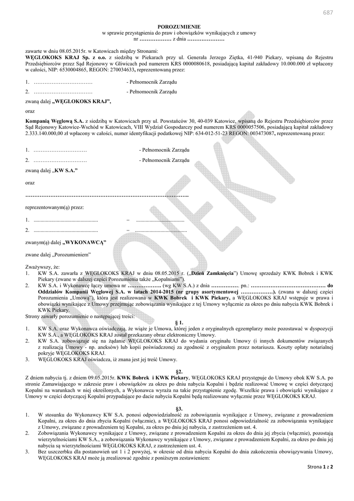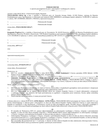 687 POROZUMIENIE w sprawie przystąpienia do praw i obowiązków wynikających z umowy nr ……………… z dnia ………………… zawarte w dniu 08.05.2015r. w Katowicach między Stronami: WĘGLOKOKS KRAJ Sp. z o.o. z siedzibą w Piekarach przy ul. Generała Jerzego Ziętka, 41-940 Piekary, wpisaną do Rejestru Przedsiębiorców przez Sąd Rejonowy w Gliwicach pod numerem KRS 0000080618, posiadającą kapitał zakładowy 10.000.000 zł wpłacony w całości, NIP: 6530004865, REGON: 270034633, reprezentowaną przez: 1. …………………………… - Pełnomocnik Zarządu 2. …………………………… - Pełnomocnik Zarządu zwaną dalej „WĘGLOKOKS KRAJ”, oraz Kompanią Węglową S.A. z siedzibą w Katowicach przy ul. Powstańców 30, 40-039 Katowice, wpisaną do Rejestru Przedsiębiorców przez Sąd Rejonowy Katowice-Wschód w Katowicach, VIII Wydział Gospodarczy pod numerem KRS 0000057506, posiadającą kapitał zakładowy 2.333.140.000,00 zł wpłacony w całości, numer identyfikacji podatkowej NIP: 634-012-51-23 REGON: 003473087, reprezentowaną przez: 1. ………………………… - Pełnomocnik Zarządu 2. ………………………… - Pełnomocnik Zarządu zwaną dalej „KW S.A.” oraz ……………………………………………………………………………….. reprezentowanym(ą) przez: 1. ................................................ − .................................... 2. ................................................ − ....................................... zwanym(ą) dalej „WYKONAWCĄ” zwane dalej „Porozumieniem” Zważywszy, że: 1. KW S.A. zawarła z WĘGLOKOKS KRAJ w dniu 08.05.2015 r. („Dzień Zamknięcia”) Umowę sprzedaży KWK Bobrek i KWK Piekary (zwane w dalszej części Porozumienia także „Kopalniami”). 2. KW S.A. i Wykonawcę łączy umowa nr ………………. (wg KW S.A.) z dnia ……………. pn.: …………………………………… do Oddziałów Kompanii Węglowej S.A. w latach 2014-2015 (nr grupy asortymentowej ………………). (zwana w dalszej części Porozumienia „Umową”), która jest realizowana w KWK Bobrek i KWK Piekary, a WĘGLOKOKS KRAJ wstępuje w prawa i obowiązki wynikające z Umowy przejmując zobowiązania wynikające z tej Umowy wyłącznie za okres po dniu nabycia KWK Bobrek i KWK Piekary. Strony zawarły porozumienie o następującej treści: § 1. 1. KW S.A. oraz Wykonawca oświadczają, że wiąże je Umowa, której jeden z oryginalnych egzemplarzy może pozostawać w dyspozycji KW S.A., a WĘGLOKOKS KRAJ został przekazany obraz elektroniczny Umowy. 2. KW S.A. zobowiązuje się na żądanie WĘGLOKOKS KRAJ do wydania oryginału Umowy (i innych dokumentów związanych z realizacją Umowy - np. aneksów) lub kopii poświadczonej za zgodność z oryginałem przez notariusza. Koszty opłaty notarialnej pokryje WĘGLOKOKS KRAJ. 3. WĘGLOKOKS KRAJ oświadcza, iż znana jest jej treść Umowy. §2. Z dniem nabycia tj. z dniem 09.05.2015r. KWK Bobrek i KWK Piekary, WĘGLOKOKS KRAJ przystępuje do Umowy obok KW S.A. po stronie Zamawiającego w zakresie praw i obowiązków za okres po dniu nabycia Kopalni i będzie realizować Umowę w części dotyczącej Kopalni na warunkach w niej określonych, a Wykonawca wyraża na takie przystąpienie zgodę. Wszelkie prawa i obowiązki wynikające z Umowy w części dotyczącej Kopalni przypadające po dacie nabycia Kopalni będą realizowane wyłącznie przez WĘGLOKOKS KRAJ. 1. 2. 3. §3. W stosunku do Wykonawcy KW S.A. ponosi odpowiedzialność za zobowiązania wynikające z Umowy, związane z prowadzeniem Kopalni, za okres do dnia zbycia Kopalni (włącznie), a WĘGLOKOKS KRAJ ponosi odpowiedzialność za zobowiązania wynikające z Umowy, związane z prowadzeniem tej Kopalni, za okres po dniu jej nabycia, z zastrzeżeniem ust. 4. Zobowiązania Wykonawcy wynikające z Umowy, związane z prowadzeniem Kopalni za okres do dnia jej zbycia (włącznie), pozostają wierzytelnościami KW S.A., a zobowiązania Wykonawcy wynikające z Umowy, związane z prowadzeniem Kopalni, za okres po dniu jej nabycia są wierzytelnościami WĘGLOKOKS KRAJ, z zastrzeżeniem ust. 4. Bez uszczerbku dla postanowień ust 1 i 2 powyżej, w okresie od dnia nabycia Kopalni do dnia zakończenia obowiązywania Umowy, WĘGLOKOKS KRAJ może ją zrealizować zgodnie z poniższym zestawieniem: Strona 1 z 2 687 KWK Bobrek limit wynosi netto: …………………. wartość zrealizowanych w KW S.A. zamówień/zleceń wynosi netto: ………………… wartość wystawionych i niezrealizowanych zamówień/zleceń wynosi netto: ………………… wartość pozostała do realizacji netto: ……………………… KWK Piekary limit wynosi netto: ………………… wartość zrealizowanych w KW S.A. zamówień/zleceń wynosi netto: ………………… wartość wystawionych i niezrealizowanych zamówień/zleceń wynosi netto: ……………….. wartość pozostała do realizacji netto: ………………….. 4. W związku z postanowieniami ust 1-3 powyżej, strony postanawiają, że jeżeli zapisy Umowy przewidują wystawianie zamówień/zleceń: a) za zamówienia/zlecenia zrealizowane do dnia zbycia Kopalni (włącznie) odpowiada KW S.A., b) zamówienia/zlecenia złożone przez KW S.A. u Wykonawcy przed dniem zbycia Kopalni, których realizacja nastąpi po dniu nabycia bez względu na datę ich złożenia przez KW S.A., zostaną wykonane na rzecz WĘGLOKOKS KRAJ, a WĘGLOKOKS KRAJ będą przysługiwały wszelkie prawa oraz obciążały wszelkie obowiązki związane z ich realizacją, w tym obowiązek zapłaty wynagrodzenia na rzecz Wykonawcy. §4. Faktury za realizację przedmiotu zamówienia Wykonawca będzie wystawiać i przesyłać: 1. za zamówienia/zlecenia zrealizowane do dnia zbycia Kopalni – tj. do dnia 08.05.2015r. (włącznie) zgodnie z zamówieniem/zleceniem i przesyłać na adres wskazany w zamówieniu/zleceniu. 2. za zamó