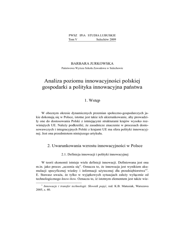 PWSZ IPiA STUDIA LUBUSKIE Tom V Sulechów 2009 BARBARA JURKOWSKA Państwowa Wyższa Szkoła Zawodowa w Sulechowie Analiza poziomu innowacyjności polskiej gospodarki a polityka innowacyjna państwa 1. Wstęp W obecnym okresie dynamicznych przemian społeczno-gospodarczych jakie dokonują się w Polsce, istotne jest takie ich ukierunkowanie, aby prowadziły one do dostosowania Polski z istniejącymi strukturami krajów wysoko rozwiniętych UE. Należy podkreślić, że zasadnicze znaczenie w procesach dostosowawczych i integracyjnych Polski z krajami UE ma sfera polityki innowacyjnej. Jest ona przedmiotem niniejszego artykułu. 2. Uwarunkowania wzrostu innowacyjności w Polsce 2.1. Definicja innowacji i polityki innowacyjnej W teorii ekonomii istnieje wiele definicji innowacji. Definiowana jest ona m.in. jako proces „uczenia się”. Oznacza to, że innowacja jest wynikiem akumulacji specyficznej wiedzy i informacji użytecznej dla przedsiębiorstwa”1. E. Stawasz uważa, że tylko w wyjątkowych sytuacjach zależy wyłącznie od technologicznego know-how. Oznacza to, iż istotnym elementem jest także wie1 Innowacje i transfer technologii. Słownik pojęć, red. K.B. Matusiak, Warszawa 2005, s. 40. 294 BARBARA JURKOWSKA dza. Wynika z tego konieczność rozwijania oświaty i szkolnictwa wyższego w dziedzinach społecznych i ekonomicznych2. Niekiedy innowacje pojmowane są stricte marketingowo, gdzie jako innowacja postrzegany jest każdy projekt tworzący przewagę konkurencyjną3. Według terminologii OECD działalność innowacyjna to szereg działań o charakterze naukowym (badawczym), technicznym, organizacyjnym, finansowym i handlowym, których celem jest opracowanie i wdrożenie nowych lub istotnie ulepszonych produktów i procesów4. Z kolei, artykuł 2 Ustawy z dnia 30 maja 2008 r. o niektórych formach wspierania działalności innowacyjnej działalnością innowacyjną nazywa, działalność polegającą na opracowaniu nowej technologii i uruchomieniu na jej podstawie wytwarzania nowych lub znacząco ulepszonych towarów, procesów lub usług5. Wszystkie wymienione elementy definicji innowacji wpisują się w obecne rozumienie tego terminu. Wyróżnione wcześniej cechy innowacyjności mają istotne znaczenie dla zdefiniowania pojęcia polityka innowacyjna. Polityka innowacyjna jest zestawem elementów polityki naukowej i polityki technologicznej. Rozumiana jest jako jedna z polityk gospodarczych, która obejmuje m.in. następujące obszary: – wzmacnianie powiązań w narodowym systemie innowacji, – kształtowanie i rozbudowywanie zdolności do wprowadzania innowacji zarówno w dziedzinie techniki i technologii, jak też organizacji i edukacji, – wykorzystanie współpracy międzynarodowej oraz procesów globalizacji w gospodarce6. 2 E. Stawasz, Przegląd podstawowych pojęć: innowacje, transfer technologii, krajowy i regionalny system innowacji, polityka innowacyjna, [w:] Instrumenty transferu technologii i pobudzania innowacji, red. T. Markowski, E. Stawasz, R. Zembaczyński, Warszawa 1997, s. 12. 3 S. Wiankowski, Z. Okrasa, M. Boguta, L. Borowicz, J. Borzęcki, Dostosowanie sfery badawczo-rozwojowej w Polsce do funkcjonowania w Europejskiej Przestrzeni Badawczej, Warszawa 2005, s. 19. 4 Terminologia wg Oslo Manual; http://www.oecd.org (17.06.2009). 5 Ustawa z dnia 30 maja 2008 r. o niektórych formach wspierania działalności innowacyjnej, DzU z 2008 r., Nr 116, poz. 730. 6 K. Kozioł, Modele polityki innowacyjnej w Unii Europejskiej, [w:] Innowacje w działalności przedsiębiorstw w integracji z Unią Europejską, red. W. Janasz, Warszawa 2005, s. 131. Analiza poziomu innowacyjności... 295 Elementy polityki innowacyjnej danego kraju kształtowane są pod wpływem specyficznych cech danego państwa, takich jak: doświadczenie historyczne, kultura, kapitał ludzki, uwarunkowania prawno-instytucjonalne itp7. Znaczenie polityki innowacyjnej wynika z dwóch faktów: – roli, jaką innowacje (technologiczne i organizacyjne) odgrywają we wzroście gospodarczym. We współczesnych gospodarkach rośnie waga innowacji w stosunku do tradycyjnych czynników wzrostu gospodarczego, takich jak ziemia, kapitał i siła robocza. Ekonomiści oceniają, że aż 2/3 wzrostu gospodarczego krajów rozwiniętych należy łączyć z wprowadzaniem innowacji; – tzw. zjawiska niedoskonałości funkcji samoregulacyjnej rynku, który sam z siebie, bez wsparcia rządów, nie jest w stanie zapewnić innowacyjności gospodarki na optymalnym – z punktu widzenia społecznego (konkurencyjność gospodarcza, rozwój regionalny, wzrost zatrudnienia) poziomie8. Głównym przedmiotem jej oddziaływania są przedsiębiorstwa, które ponoszą ryzyko podejmowania innowacji, w przypadku ich niepowodzenia. Służy temu tworzenie klimatu sprzyjającego innowacjom, wspieranie kultury innowacyjnej firm oraz rozwijanie usług na rzecz innowacji9. Polityka innowacyjna musi zatem wpłynąć na przedsiębiorstwo, kształtując jego zachowanie i środowisko w jakim działa. Istnieją różne drogi prowadzące do innowacji. Może mieć ona postać wynalazku lub nowego podejścia do prowadzenia działalności gospodarczej. Powszechnie stosowane są również pojęcia innowacji technologicznej, organizacyjnej, modelowej, prezentacyjnej10. 2.2. Cele i instrumenty polityki innowacyjnej Strategicznym celem polskiej polityki innowacyjnej na lata 2007-2013 jest wzrost innowacyjności przedsiębiorstw dla utrzymania gospodarki na ścieżce szybkiego rozwoju i dla tworzenia nowych, lepszych miejsc pracy11. Jednym z najważniejszych celów polityki innowacyjnej, zarówno rozwiniętych, jak i rozwijających się państw, jest rozwój krajowego i regionalnych sysL. Kwieciński, Unia Europejska. Polska. Dolny Śląsk – w kierunku innowacyjnej gospodarki, [w:] Innowacyjny jednolity rynek wyzwania dla wymiaru gospodarczego Unii Europejskiej, Warszawa 2007, s. 13. 8 Polityka innowacyjna w Polsce do 2006 roku, jako jeden 