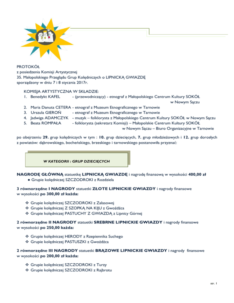 PROTOKÓŁ z posiedzenia Komisji Artystycznej 35. Małopolskiego Przeglądu Grup Kolędniczych o LIPNICKĄ GWIAZDĘ sporządzony w dniu 7 i 8 stycznia 2017r. KOMISJA ARTYSTYCZNA W SKŁADZIE: 1. Benedykt KAFEL - (przewodniczący) - etnograf z Małopolskiego Centrum Kultury SOKÓŁ w Nowym Sączu 2. Maria Danuta CETERA - etnograf z Muzeum Etnograficznego w Tarnowie 3. Urszula GIEROŃ - etnograf z Muzeum Etnograficznego w Tarnowie 4. Jadwiga ADAMCZYK - muzyk – folklorysta z Małopolskiego Centrum Kultury SOKÓŁ w Nowym Sączu 5. Beata ROMPAŁA - folklorysta (sekretarz Komisji) – Małopolskie Centrum Kultury SOKÓŁ w Nowym Sączu – Biuro Organizacyjne w Tarnowie po obejrzeniu 29. grup kolędniczych w tym : 10. grup dziecięcych, 7. grup młodzieżowych i 12. grup dorosłych z powiatów: dąbrowskiego, bocheńskiego, brzeskiego i tarnowskiego postanowiła przyznać: W KATEGORII : GRUP DZIECIĘCYCH NAGRODĘ GŁÓWNĄ statuetkę LIPNICKĄ GWIAZDĘ i nagrodę finansową w wysokości 400,00 zł ● Grupie kolędniczej SZCZODROKI z Rozdziela 3 równorzędne I NAGRODY statuetki ZŁOTE LIPNICKIE GWIAZDY i nagrody finansowe w wysokości po 300,00 zł każda: Grupie kolędniczej SZCZODROKI z Zalasowej Grupie kolędniczej Z SZOPKĄ NA KIJU z Gwoźdźca Grupie kolędniczej PASTUCHY Z GWIAZDĄ z Lipnicy Górnej 2 równorzędne II NAGRODY statuetki SREBRNE LIPNICKIE GWIAZDY i nagrody finansowe w wysokości po 250,00 każda: Grupie kolędniczej HERODY z Rzepiennika Suchego Grupie kolędniczej PASTUSZKI z Gwoźdźca 2 równorzędne III NAGRODY statuetki BRĄZOWE LIPNICKIE GWIAZDY i nagrody finansowe w wysokości po 200,00 zł każda: Grupie kolędniczej SZCZODROKI z Turzy Grupie kolędniczej SZCZODROKI z Rajbrotu str. 1 2 równorzędne WYRÓŻNIENIA i nagrody finansowe w wysokości po 100,00 zł każda: Grupie kolędniczej HERODY (Mali Lipniczanie) z Lipnicy Murowanej Grupie kolędniczej Z GWIAZDĄ (Mali Biskupianie) z Biskupic Radłowskich W KATEGORII : GRUP MŁODZIEZOWYCH NAGRODĘ GŁÓWNĄ statuetkę LIPNICKĄ GWIAZDĘ i nagrodę finansową w wysokości 500,00 zł ● Grupie kolędniczej DROBY z Rzepiennika Suchego I NAGRODĘ statuetkę ZŁOTĄ LIPNICKĄ GWIAZDĘ i nagrodę finansową w wysokości 400,00 zł Grupie kolędniczej DROBY z Rozdziela 2 równorzędne II NAGRODY statuetki SREBRNE LIPNICKIE GWIAZDY i nagrody finansowe w wysokości po 350,00 zł każda: Grupie kolędniczej HERODY z Gwoźdźca Grupie kolędniczej Z KOZĄ z Nowego Wiśnicza 3 równorzędne III NAGRODY statuetki BRĄZOWE LIPNICKIE GWIAZDY i nagrody finansowe w wysokości po 300,00 zł każda: Grupie kolędniczej HERODY (Lubeckie Szkuty) z Lubczy Grupie kolędniczej HERODY (Lipniczanie) z Lipnicy Murowanej Grupie kolędniczej Z GWIAZDĄ z Muchówki Do działu w Ogólnopolskich Spotkaniach Dziecięcych i Młodzieżowych Grup Kolędniczych 20. PASTUSZKOWE KOLĘDOWANIE w Podegrodziu, Komisja kwalifikuje; Dziecięcą grupę kolędniczą SZCZODROKI z Rozdziela Dziecięcą grupę kolędniczą SZCZODROKI z Zalasowej Dziecięcą grupę kolędniczą Z SZOPKĄ NA KIJU z Gwoźdźca Dziecięcą grupę kolędniczą PASTUCHY Z GWIAZDĄ z Lipnicy Górnej Młodzieżową grupę kolędniczą DROBY z Rzepiennika Suchego Młodzieżową grupę kolędniczą DROBY z Rozdziela W KATEGORII : GRUP DOROSŁYCH NAGRODĘ GŁÓWNĄ statuetkę LIPNICKĄ GWIAZDĘ i nagrodę finansową w wysokości 700,00 zł ● Grupie kolędniczej HERODY (Śmignianie) ze Śmigna 4 równorzędne I NAGRODY statuetki ZŁOTE LIPNICKIE GWIAZDY i nagrody finansowe w wysokości po 550,00 zł każda: Grupie kolędniczej Z TURONIEM (Gnojniczanie) z Gnojnika Grupie kolędniczej Z SZOPKĄ LALKOWĄ z Gwoźdźca Grupie kolędniczej HERODY (Nieczajnianie) z Nieczajnej Górnej Grupie kolędniczej HERODY (Zalasowianie) z Zalasowej str. 2 3 równorzędne II NAGRODY statuetki SREBRNE LIPNICKIE GWIAZDY i nagrody finansowe w wysokości po 400,00 zł każda: Grupie kolędniczej DROBY z Gwoźdźca Grupie kolędniczej Z KOZĄ (Lubcoki) z Lubczy Grupie kolędniczej Z TURONIEM (Pleśnioki) z Pleśnej 2 równorzędne III NAGRODY i statuetki BRĄZOWE LIPNICKIE GWIAZDY nagrody finansowe w wysokości po 300,00 zł każda: Grupie kolędniczej HERODY z Zabrnia Grupie kolędniczej Z TURONIEM (Kolędnicy znad Uszwicy) z Uszwi 2 równorzędne WYRÓŻNIENIA i nagrody finansowe w wysokości po 200,00 zł każda: Grupie kolędniczej Z TURONIEM (Biskupianie) z Biskupic Radłowskich Grupie kolędniczej Z GWIAZDĄ z Poręby Spytkowskiej Nagrody indywidualne za grę aktorską otrzymują: ● postać HERODA z grupy kolędniczej HERODY (Zalasowianie) z Zalasowej ● postać HERODA z grupy kolędniczej HERODY (Nieczajniacy) z Nieczajnej Górnej ● postać ŻYDA z grupy kolędniczej HERODY z Zabrnia Do działu w Ogólnopolskim Przeglądzie Grup Kolędniczych 45. GÓRALSKIEGO KARNAWAŁU w Bukowinie Tatrzańskiej, Komisja kwalifikuje; HERODY (Śmignianie) ze Śmigna Z TURONIEM (Gnojniczanie) z Gnojnika Z SZOPKĄ LALKOWĄ z Gwoźdźca HERODY (Nieczajnianie) z Nieczajnej Górnej HERODY (Zalasowianie) z Zalasowej DROBY z Gwoźdźca Z KOZĄ (Lubcoki) z Lubczy Z TURONIEM (Pleśnioki) z Pleśnej Komisja podkreśla duże znaczenie LIPNICKIEJ GWIAZDY dla utrzymania wysokiego poziomu prezentacji zwyczajów i obrzędów bożonarodzeniowych oraz upowszechniania tradycji kolędowania na Ziemi Tarnowskiej. Szczególnie cennym zjawiskiem widocznym w tegorocznym Konkursie jest liczne uczestnictwo dziecięcych grup kolędniczych. Cieszy fakt, że 35. edycja Lipnickiej Gwiazdy stała na wysokim poziomie szczególnie w kategorii grup dorosłych. Prosimy organizatorów o zapis regulaminowy, by grupy zmieniające kategorię wiekową (z dziecięcej na młodzieżową, z młodzieżowej na dorosłą) prezentowały inny program i repertuar niż w roku poprzednim. Ze względu na dużą ilość grup kolędniczych na Ziemi Tarnowskiej Komisja proponuje władzom samorządowym zorganizowanie eliminacji powiatowych do udziału w Małopolskim Przegl