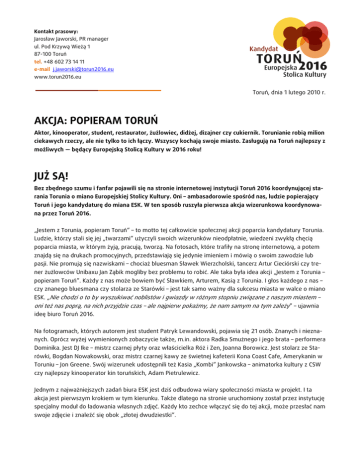 Kontakt prasowy: Jarosław Jaworski, PR manager ul. Pod Krzywą Wieżą 1 87-100 Toruń tel. +48 602 73 14 11 e-mail [email protected] www.torun2016.eu Toruń, dnia 1 lutego 2010 r. AKCJA: POPIERAM TORUŃ Aktor, kinooperator, student, restaurator, żużlowiec, didżej, dizajner czy cukiernik. Torunianie robią milion ciekawych rzeczy, ale nie tylko to ich łączy. Wszyscy kochają swoje miasto. Zasługują na Toruń najlepszy z możliwych — będący Europejską Stolicą Kultury w 2016 roku! JUŻ SĄ! Bez zbędnego szumu i fanfar pojawili się na stronie internetowej instytucji Toruń 2016 koordynującej starania Torunia o miano Europejskiej Stolicy Kultury. Oni – ambasadorowie spośród nas, ludzie popierający Toruń i jego kandydaturę do miana ESK. W ten sposób ruszyła pierwsza akcja wizerunkowa koordynowana przez Toruń 2016. „Jestem z Torunia, popieram Toruń” – to motto tej całkowicie społecznej akcji poparcia kandydatury Torunia. Ludzie, którzy stali się jej „twarzami” użyczyli swoich wizerunków nieodpłatnie, wiedzeni zwykłą chęcią poparcia miasta, w którym żyją, pracują, tworzą. Na fotosach, które trafiły na stronę internetową, a potem znajdą się na drukach promocyjnych, przedstawiają się jedynie imieniem i mówią o swoim zawodzie lub pasji. Nie promują się nazwiskami – chociaż bluesman Sławek Wierzcholski, tancerz Artur Cieciórski czy trener żużlowców Unibaxu Jan Ząbik mogliby bez problemu to robić. Ale taka była idea akcji „Jestem z Torunia – popieram Toruń”. Każdy z nas może bowiem być Sławkiem, Arturem, Kasią z Torunia. I głos każdego z nas – czy znanego bluesmana czy stolarza ze Starówki – jest tak samo ważny dla sukcesu miasta w walce o miano ESK. „Nie chodzi o to by wyszukiwać noblistów i gwiazdy w różnym stopniu związane z naszym miastem – oni też nas poprą, na nich przyjdzie czas – ale najpierw pokażmy, że nam samym na tym zależy” – ujawnia ideę biuro Toruń 2016. Na fotogramach, których autorem jest student Patryk Lewandowski, pojawia się 21 osób. Znanych i nieznanych. Oprócz wyżej wymienionych zobaczycie także, m.in. aktora Radka Smużnego i jego brata – performera Dominika. Jest DJ Ike – mistrz czarnej płyty oraz właścicielka Róż i Zen, Joanna Borowicz. Jest stolarz ze Starówki, Bogdan Nowakowski, oraz mistrz czarnej kawy ze świetnej kafeterii Kona Coast Cafe, Amerykanin w Toruniu – Jon Greene. Swój wizerunek udostępnili też Kasia „Kombi” Jankowska – animatorka kultury z CSW czy najlepszy kinooperator kin toruńskich, Adam Pietrulewicz. Jednym z najważniejszych zadań biura ESK jest dziś odbudowa wiary społeczności miasta w projekt. I ta akcja jest pierwszym krokiem w tym kierunku. Także dlatego na stronie uruchomiony został przez instytucję specjalny moduł do ładowania własnych zdjęć. Każdy kto zechce włączyć się do tej akcji, może przesłać nam swoje zdjęcie i znaleźć się obok „złotej dwudziestki”. Kontakt prasowy: Jarosław Jaworski, PR manager ul. Pod Krzywą Wieżą 1 87-100 Toruń tel. +48 602 73 14 11 e-mail [email protected] www.torun2016.eu „Pomysł jest prosty: Pokaż, że Ty też popierasz Toruń. Przyślij swoje zdjęcie i powiedz nam coś o sobie. Jak masz na imię, czym się zajmujesz? Niech zobaczą Cię inni” – tłumaczy ideę Przemek Draheim z Toruń 2016. Jak dodaje: „będzie nam miło, jeśli internauci polubią akcję i pomogą nam rozpropagować ją w sieci. Nie potrzeba wiele – wystarczy swoje poparcie przykleić na ulubionym blogu, na Facebooku czy Naszej Klasie, pochwalić się nim znajomym. Tak żeby w sieci zrobiło się od nas gęsto”. Instytucja Toruń 2016 zaplanowała akcję na okres całego lutego. Przez pierwsze dwa tygodnie koncentrować się ona będzie na działaniach internetowych – rozbudowie bazy zdjęć, mailing do opiniotwórczych mediów w kraju i propagowanie pomysłu. W połowie lutego zdjęcia części spośród 21 sportretowanych osób trafią na widokówki, plakaty i najprawdopodobniej także na billboardy. W planach jest zrealizowanie kilkunastosekundowych spotów promocyjnych z bohaterami akcji. Akcja zakończy się w marcu.