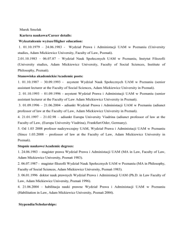 Marek Smolak Kariera naukowa/Career details: Wykształcenie wyższe/Higher education: 1. 01.10.1979 – 24.06.1983 - Wydział Prawa i Administacji UAM w Poznaniu (University studies, Adam Mickiewicz University, Faculty of Law, Poznań). 2.01.10.1983 – 06.07.87 – Wydział Nauk Społecznych UAM w Poznaniu, Instytut Filozofii (University studies, Adam Mickiewicz University, Faculty of Social Sciences, Institute of Philosophy, Poznań). Stanowiska akademickie/Academic posts: 1. 01.10.1987 – 30.09.1993 - asystent Wydział Nauk Społecznych UAM w Poznaniu (senior assistant lecturer at the Faculty of Social Sciences, Adam Mickiewicz University in Poznań). 2. 01.10.1993 – 01.09.1996 - asystent Wydział Prawa i Administacji UAM w Poznaniu (senior assistant lecturer at the Faculty of Law Adam Mickiewicz University in Poznań). 3. 01.09.1996 – 21.06.2004 - adiunkt Wydział Prawa i Administacji UAM w Poznaniu (adiunct professor of law at the Faculty of Law, Adam Mickiewicz University in Poznań). 4. 21.01.1997 – 21.02.98 – adiunkt Europa University Viadrina (adiunct professor of law at the Faculty of Law, (Europa University Viadrina), Frankfurt/Oder, Germany). 5. Od 1.03 2008 profesor nadzywczajny UAM, Wydział Prawa i Administacji UAM w Poznaniu (Since 1.03.2008 – professor of law at the Faculty of Law, Adam Mickiewicz University in Poznań). Stopnie naukowe/Academic degrees: 1. 24.06.1983 – magister prawa Wydział Prawa i Administacji UAM (MA in Law, Faculty of Law, Adam Mickiewicz University, Poznań 1983). 2. 06.07.1987 - magister filozofii Wydział Nauk Społecznych UAM w Poznaniu (MA in Philosophy, Faculty of Social Sciences, Adam Mickiewicz University, Poznań 1983). 3. 06.01.1996 doktor nauk prawnych Wydział Prawa i Administacji UAM (Ph.D. in Law Faculty of Law, Adam Mickiewicz University, Poznań 1996). 4. 21.06.2004 – habilitacja nauki prawne Wydział Prawa i Administacji UAM w Poznaniu (Habilitation in Law, Adam Mickiewicz University, Poznań 2004). Stypendia/Scholarships: 1. Stypendium Austriackiego Ministra Nauki (Austrian Ministry of Sciences Scholarship 15.09.1992 – 25.11.1992, Schlaining, European Peace University, Austria). 2. Stypendium Szwedzkiego Instytutu, Lund, Szwecja (The Swedish Institute Scholarship 19.01.1996 – 21.06.1996, Lund, Lund University, Faculty of Law, Sweden). 3. Stypendium Zaawansowanych Studiów w Humanistyce, The Institute for Advanced Studies in the Humanities, Uniwersytet w Edynburgu, Edynburg, Szkocja, (The University of Edinburgh, 05.05.2000 – 30.07. 2000, Faculty of Law, Scotland). 4. Stypendium Slavic Research Centre, Sapporo, Japonia (Hokkaido University 15. 07.200717.09.2007, Sapporo Japan. Profesor wizytujący/Visiting professor: 1. visiting professor 01.07.2001 - 30.07.2001, Wydział Prawa, Uniwersytet w Kapsztadzie, (Faculty of Law, Cape Town University, South Africa). 2. visiting professor 9.12 2004- 31.03.2005, Wydział Prawa Uniwersytet w Nagoi Japonia (Faculty of Law, Nagoya University, Japan). Wyjazdy naukowe (Research studies): 1. Helsińska Fundacja Praw Człowieka Warszawa, Polska (Helsinki Foundation of Human Rights, School of Human Rights Warsaw 13.02.1998- 14.06.1998 Poland). 2. International Institute for the Sociology of Law, Onati, Hiszpania, 21. 05. 2010 – 21.06. 2010, Onati, Spain. 3. International Institute for the Sociology of Law, Onati, Hiszpania 23. 05-21.06 2011, Onati, Spain. Zainteresowania naukowe/Discipline and field of specialization: Teoria i filozofia prawa, prawo konstytucyjne, prawa człowieka, etyka prawnicza, filozofia polityczna i moralna/jurisprudence, constitutional law, human rights, legal ethics, political and moral philosophy. Publikacje/Publications: Jestem autorem czterech książek oraz ponad sześcdziesięciu innych publikacji. I have written 4 books and 60 others publications. Major publications are: 1. Książki/books: Prawo, fakt, instytucja. Koncepcje teoretycznoprawne prawniczego pozytywizmu instytucjonalnego, Wyd. Naukowe UAM 1998, ss.163, ISBN 83-232-0869-7. (Law, Fact, Institution. Institutional Positivism and its conceptions, Poznań 1998, in Polish). 2. Uzasadnianie sądowe jako argumentacja z moralności politycznej. O legitymizacji władzy sędziowskiej, Zakamycze 2003, ss.260, ISBN 83-7333-327-4. (Judicial justification as a moralpolitical argumentation, Krakow 2003, in Polish). 3 Czesław Znamierowski. W poszukiwaniu sprawnego państwa. Wydawnictwo Poznańskie 2007, ss.155, ISBN 978-83-7177-468-3. (Czeslaw Znamierowski, Poznań 2007, in Polish). 4. Wykładnia celowościowa z perspektywy pragmatycznej. Wolters Kluwer Warszawa 2012, ss, 260, ISBN 978-83- 264-0774-1.(Legal interpretation from pragmatic point of view, Warsaw 2012, in Polish). 2. Główne artykuły/ Major articles: 1. H.L.A. Hart's postscript, „The Cambrian Law Review“, vol. 27, 1996, pp.75-81. (with M. Kordela). 2. Zmiana paradygmatu interpretacyjnego w okresie transformacji ustrojowej w Polsce, „Ruch Prawniczy Ekonomiczny i Socjologiczny”, vol. 3-4. 1998, ss.21-35, ISSN 0035-9629. (Change of Legal Paradigm during Transformation in Poland „Legal, Sociological and Economical Review“, vol. 3-4, 1998, in Polish). 3. Minority Rights and Legal Interpretation, [w:] Lidska prava proti Rasismu, T.Machalova (red.), Brno, 2001 ss.185-199. 4. The Rule of Law and the Politics of Adjudication in Poland, “East Central Europe, Eine wissenschaftliche Zeitschrift” vol. 28. 2001, ss.51 – 61. 5. Sprawiedliwość tranzycyjna na przykładzie Komisji Prawdy i Pojednania RPA, „Państwo i Prawo” , nr 11 2002, ss.66-74, ISSN 0031-0980. (Transitional Justice. Case of Truth and Reconciliation Commission in South Africa, „Law and State“, nr 11 2002 in Polish). 6.Lustration and Reconciliation. Polish and South African Experience, “ Archiv fur Rechts und Sozialphilosophie “, nr 3. 2003. 7. Sądownictwo konstytucyjne a autonomia prawa wobec polityki, „Ruch Prawniczy, Ekonomiczny i Socjologiczny”, z