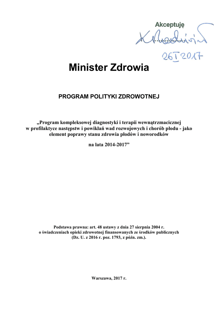 Akceptuję …………… Minister Zdrowia PROGRAM POLITYKI ZDROWOTNEJ „Program kompleksowej diagnostyki i terapii wewnątrzmacicznej w profilaktyce następstw i powikłań wad rozwojowych i chorób płodu - jako element poprawy stanu zdrowia płodów i noworodków na lata 2014-2017” Podstawa prawna: art. 48 ustawy z dnia 27 sierpnia 2004 r. o świadczeniach opieki zdrowotnej finansowanych ze środków publicznych (Dz. U. z 2016 r. poz. 1793, z późn. zm.). Warszawa, 2017 r. II. Streszczenie 1) Skrótowy opis celów i podstawowych elementów programu Na przestrzeni ostatnich kilkunastu lat dokonał się ogromny postęp w diagnostyce wad rozwojowych i chorób płodu. Wczesne wykrycie wad i chorób płodu jest ważnym elementem codziennej działalności lekarzy położników i ginekologów. Konieczność specjalnego postępowania w razie ich stwierdzenia oraz możliwość ewentualnej interwencji w łonie matki stwarza potrzebę rozszerzonej diagnostyki. Wprowadzanie i kontynuacja metod terapii wewnątrzmacicznej płodu z wykorzystaniem najnowocześniejszej aparatury pozwala na prowadzenie zabiegów terapeutycznych w takich patologiach jak: małowodzie, wielowodzie, zespół podkradania w ciąży bliźniaczej TTTS, uropatie zaporowe, wodogłowie wewnętrzne, uogólniony obrzęk płodu, zwyrodnienie torbielowate płuc płodu - CALM, guzy okolicy krzyżowej i przepukliny rdzeniowe kręgosłupa. Program oparty jest na aktualnej wiedzy medycznej i dowodach naukowych z zakresu ultrasonografii, położnictwa, neonatologii, genetyki oraz chirurgii dziecięcej. Istotą programu jest stworzenie rozwiązań organizacyjnych i doprowadzenie do szeregu przedsięwzięć, mających na celu przygotowanie i odpowiednie wyposażenie ośrodka referencyjnego oraz sukcesywne opracowywanie i wdrażanie niezbędnych schematów postępowania terapeutycznego. W założeniach programu należy zwrócić uwagę na: a) poprawę dostępności do leczenia wewnątrzmacicznego, b) niezbędne zabezpieczenie w aparaturę medyczną, c) możliwość wykonania zabiegów wewnątrzmacicznych u kobiet ciężarnych z rozpoznanymi wadami rozwojowymi i chorobami płodu, d) modyfikację sposobu prowadzenia ciąży, e) optymalizację opieki przedporodowej, porodowej i poporodowej. Cele główne programu: a) zastosowanie diagnostyki i wewnątrzmacicznej terapii płodu, która stwarza nowy system opieki nad ciężarną i płodem, b) poprawa stanu zdrowia noworodków poprzez zlikwidowanie powikłań okresu noworodkowego. 2 2) Określenie wysokości środków niezbędnych na realizację programu, w tym środków z budżetu ministra właściwego do spraw zdrowia, w kolejnych latach jego realizacji Rok 2014 2015 2016 2017 Planowane środki (wydatki bieżące) 1 400 000 1 433 600 1 690 000 1 503 239 Szacunkowa wysokość środków w kolejnych latach została uwzględniona w oparciu o wskaźnik cen towarów i usług konsumpcyjnych ustalony na rok 2014 w wysokości 2,4%. Wysokość środków w latach 2014-2017 może ulec zmianie, gdyż budżet na programy zdrowotne finansowane z rozdziału 85149-Programy Polityki Zdrowotnej planowany jest na okres jednego roku. Wobec powyższego wysokość środków finansowych przewidzianych do wydatkowania w ramach programu w latach 2014-2017 uzależniona jest od corocznych decyzji Kierownictwa Ministerstwa Zdrowia. 3) Spodziewane efekty i korzyści wynikające z potencjalnego wdrożenia programu, w tym określenie głównych mierzalnych/niemierzalnych korzyści i kosztów Dzięki doposażeniu w sprzęt i aparaturę medyczną z poprzednich lat funkcjonowania programu, możliwe było nowocześniejsze i sprawniejsze wykonywanie zabiegów na płodzie oraz zwiększenie dostępności leczenia wewnątrzmacicznego i modyfikacja stosowanych technik w terapii wewnątrzmacicznej. Zastosowanie diagnostyki i terapii wewnątrzmacicznej pozwala ograniczyć liczbę powikłań i następstw wad rozwojowych, wpływa na poprawę wewnątrzmacicznego stanu płodu, wydłużenie czasu trwania ciąży oraz na rodzenie się noworodków w lepszym stanie ogólnym. Poprawa stanu zdrowia noworodków - poprzez zlikwidowanie powikłań okresu noworodkowego - powoduje również skrócenie czasu pobytu noworodków w Oddziałach Intensywnej Terapii Noworodkowej. Głównym założeniem w nowej edycji programu jest realizacja kompleksowej diagnostyki i terapii płodu z wykorzystaniem wszystkich możliwości tak, aby najbardziej istotnym kryterium prawidłowości prowadzonej strategii diagnostyczno-leczniczej i wskaźnikiem jakości terapii było zabranie do domu zdrowego dziecka – home taken baby (HBT). III. Zdefiniowanie problemu/określenie potrzeby realizacji programu 1) Opis problemu Częstość występowania strukturalnych wad rozwojowych i chorób płodu mieści się w zakresie od 3-4,5/100 przypadków diagnozowanych płodów. Wartość średnia występowania wad u noworodków jest szacowana na około 3,5 % przypadków. Przy liczbie ok. 400 tys. porodów rocznie, ilość nowo rozpoznanych wad rozwojowych można szacować na ponad 14 000 3 w ciągu roku. Nie jest to jednak liczba wad, która wymaga terapii wewnątrzmacicznej. W tej grupie znajdują się wady letalne płodu z nieprawidłowym kariotypem, które nie są kwalifikowane do terapii. Poza tym wady kośćca, wady mózgowia, wady serca, wady twarzoczaszki, wady gałek ocznych, atrezji przełyku, dwunastnicy, patologie dłoni i stóp, wady dotyczące liczby palców i paliczków, wady metaboliczne i wady skórne uwarunkowane genetycznie – również nie podlegają terapii prenatalnej. W związku z tym liczbę płodów wymagających leczenia w trakcie ciąży szacuje się na ok. 0,5%, co stanowi 2000 przypadków na ok. 400 000 porodów rocznie. Powstało wiele metod diagnostyki przedurodzeniowej pozwalających na dokładne, wczesne i zarazem bezpieczne wykrywanie wad rozwojowych płodu. Konieczność specjalnego postępowania w przypadku ich stwierdzenia oraz możliwość ewen