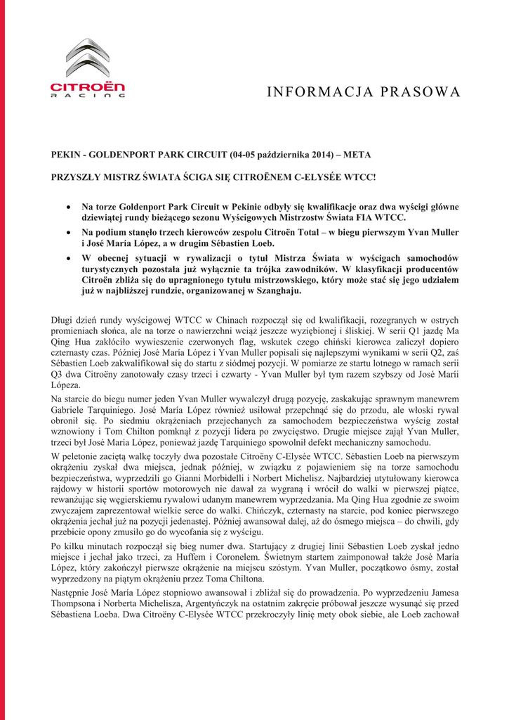 I N F O R MA C JA PR A SO W A PEKIN - GOLDENPORT PARK CIRCUIT (04-05 października 2014) – META PRZYSZŁY MISTRZ ŚWIATA ŚCIGA SIĘ CITROËNEM C-ELYSÉE WTCC! Na torze Goldenport Park Circuit w Pekinie odbyły się kwalifikacje oraz dwa wyścigi główne dziewiątej rundy bieżącego sezonu Wyścigowych Mistrzostw Świata FIA WTCC. Na podium stanęło trzech kierowców zespołu Citroën Total – w biegu pierwszym Yvan Muller i José María López, a w drugim Sébastien Loeb. W obecnej sytuacji w rywalizacji o tytuł Mistrza Świata w wyścigach samochodów turystycznych pozostała już wyłącznie ta trójka zawodników. W klasyfikacji producentów Citroën zbliża się do upragnionego tytułu mistrzowskiego, który może stać się jego udziałem już w najbliższej rundzie, organizowanej w Szanghaju. Długi dzień rundy wyścigowej WTCC w Chinach rozpoczął się od kwalifikacji, rozegranych w ostrych promieniach słońca, ale na torze o nawierzchni wciąż jeszcze wyziębionej i śliskiej. W serii Q1 jazdę Ma Qing Hua zakłóciło wywieszenie czerwonych flag, wskutek czego chiński kierowca zaliczył dopiero czternasty czas. Później José María López i Yvan Muller popisali się najlepszymi wynikami w serii Q2, zaś Sébastien Loeb zakwalifikował się do startu z siódmej pozycji. W pomiarze ze startu lotnego w ramach serii Q3 dwa Citroëny zanotowały czasy trzeci i czwarty - Yvan Muller był tym razem szybszy od José Maríi Lópeza. Na starcie do biegu numer jeden Yvan Muller wywalczył drugą pozycję, zaskakując sprawnym manewrem Gabriele Tarquiniego. José María López również usiłował przepchnąć się do przodu, ale włoski rywal obronił się. Po siedmiu okrążeniach przejechanych za samochodem bezpieczeństwa wyścig został wznowiony i Tom Chilton pomknął z pozycji lidera po zwycięstwo. Drugie miejsce zajął Yvan Muller, trzeci był José María López, ponieważ jazdę Tarquiniego spowolnił defekt mechaniczny samochodu. W peletonie zaciętą walkę toczyły dwa pozostałe Citroëny C-Elysée WTCC. Sébastien Loeb na pierwszym okrążeniu zyskał dwa miejsca, jednak później, w związku z pojawieniem się na torze samochodu bezpieczeństwa, wyprzedzili go Gianni Morbidelli i Norbert Michelisz. Najbardziej utytułowany kierowca rajdowy w historii sportów motorowych nie dawał za wygraną i wrócił do walki w pierwszej piątce, rewanżując się węgierskiemu rywalowi udanym manewrem wyprzedzania. Ma Qing Hua zgodnie ze swoim zwyczajem zaprezentował wielkie serce do walki. Chińczyk, czternasty na starcie, pod koniec pierwszego okrążenia jechał już na pozycji jedenastej. Później awansował dalej, aż do ósmego miejsca – do chwili, gdy przebicie opony zmusiło go do wycofania się z wyścigu. Po kilku minutach rozpoczął się bieg numer dwa. Startujący z drugiej linii Sébastien Loeb zyskał jedno miejsce i jechał jako trzeci, za Huffem i Coronelem. Świetnym startem zaimponował także José María López, który zakończył pierwsze okrążenie na miejscu szóstym. Yvan Muller, początkowo ósmy, został wyprzedzony na piątym okrążeniu przez Toma Chiltona. Następnie José María López stopniowo awansował i zbliżał się do prowadzenia. Po wyprzedzeniu Jamesa Thompsona i Norberta Michelisza, Argentyńczyk na ostatnim zakręcie próbował jeszcze wysunąć się przed Sébastiena Loeba. Dwa Citroëny C-Elysée WTCC przekroczyły linię mety obok siebie, ale Loeb zachował trzecie miejsce na podium z przewagą 3 tysięcznych sekundy. Yvan Muller pozostał do końca na dziewiątym miejscu, zaś Ma Qing Hua zakończył wyścig na pozycji nie punktowanej. Pomimo, że cały weekend – jako pierwszy w sezonie 2014 – upłynął bez zwycięstwa zespołu Citroën Total, francuska ekipa uważa pierwszą z dwóch chińskich rund WTCC za udaną. Ze względu na zdobyte punkty jest już pewne, że dalsza walka o tytuł wyścigowego Mistrza Świata rozegra się pomiędzy trójką jej kierowców, którymi są José María López (339 pkt), Yvan Muller (273 pkt) i Sébastien Loeb (238 pkt). Podsumowując wyniki uzyskane w Pekinie, najlepszy bilans wynosi z nich López, który powiększył swoją przewagę w tabeli nad Mullerem o sześć punktów. Co do klasyfikacji producentów, rywalizujących o tytuł wyścigowego mistrza świata w kategorii marek, Citroën potrzebuje do tego sukcesu już tylko piętnastu punktów. POWIEDZIELI NA MECIE: Yves Matton, Dyrektor Citroën Racing: „Teoretycznie patrząc, krótki i kręty tor w Pekinie nie był najlepszym miejscem dla naszych Citroënów C-Elysée WTCC, szczególnie, że nasi konkurencji korzystali z przewagi, jaką dawał im system kompensacji osiągów poprzez dociążanie samochodów. Istotnie, jest to pierwszy w tym sezonie weekend, w którym żaden z naszych kierowców nie wygrał żadnego z biegów. A jednak, w obydwu klasyfikacjach jest to dla nas runda pomyślna. W tej chwili myślimy już o czekających nas wyścigach w Szanghaju, które stanowią szczególnie ważne wydarzenie dla Citroëna”. José-María López: „Dla zespołu jako całości ten weekend miał przebieg bardziej złożony niż kilka poprzednich. Inne zespoły w ostatnich tygodniach intensywnie pracowały, zrobiły postępy i dostrzegamy, że przekłada się to na lepsze osiągi ich samochodów. Z mojego punktu widzenia wszystko biegnie w dobrym kierunku, gdyż udało mi się jeszcze powiększyć posiadaną przewagę. Niemniej, walka o mistrzostwo trwa dalej – w programie zostają nam jeszcze trzy rundy czyli sześć wyścigów”. Sébastien Loeb: „Muszę się przyznać, że w pierwszym biegu miałem problemy z właściwym czuciem zachowania się opon, przez co walczyłem z dość nieprzyjemnymi narowami samochodu. W biegu drugim poszło mi lepiej. Na pierwszych okrążeniach byłem nieco szybszy niż Tom Coronel, jednak nie na tyle, by móc go wyprzedzić. Pod koniec popełniłem drobny błąd, przez co dogonił mnie 