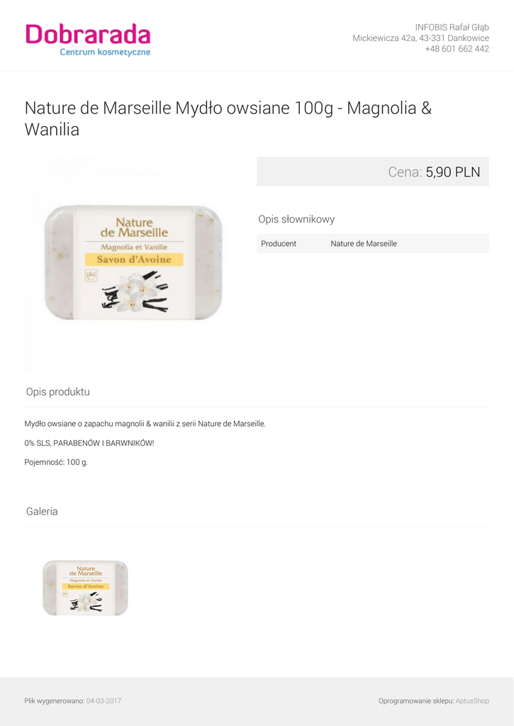 INFOBIS Rafał Głąb Mickiewicza 42a, 43-331 Dankowice +48 601 662 442 Nature de Marseille Mydło owsiane 100g - Magnolia & Wanilia Cena: 5,90 PLN Opis słownikowy Producent Nature de Marseille Opis produktu Mydło owsiane o zapachu magnolii & wanilii z serii Nature de Marseille. 0% SLS, PARABENÓW I BARWNIKÓW! Pojemność: 100 g. Galeria Plik wygenerowano: 04-03-2017 Powered by TCPDF (www.tcpdf.org) Oprogramowanie sklepu: AptusShop