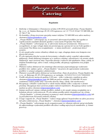 Regulamin 1. Stołówkę w Gimnazjum w Chotomowie od dnia 4.09.2014r prowadzi firma: Poezja Smaków Sp. z o.o.; ul. Stefana Batorego 49, 05-120 Legionowo; tel. 22 774 43 28 lub 723 600 800, fax 22 766 27 56; 2. Do kontaktu z firmą stworzono specjalny numer telefonu 723 600 800 oraz adres mailowy [email protected] 3. „Poezja Smaków” zobowiązuje się, że zawartość oferowanych posiłków jest zgodna ze współczesnymi zasadami dietetyki zgodnie z wytycznymi Programu Vita Menu. 4. „Poezja Smaków” zobowiązuje się, że oferowane menu jest urozmaicone. Oznacza to w szczególności, że zupy i drugie dania nie powtarzają się częściej niż raz na 6 dni zgodnie z wytycznymi Vita Menu oraz uwzględnianie – w miarę możliwości – preferencji dzieci/ uczniów. 5. Co do zasady pełny zestaw obiadowy składa się z zupy, drugiego dania oraz kompotu oraz desoru lub owocu. 6. W celu zapisania dziecka/ ucznia do korzystania z obiadów należy wypełnić odpowiednia deklarację. Druki deklaracji dostępne są w stołówce szkolnej, sekretariacie i na stronie szkoły. Deklaracja musi zawierać imię i nazwisko dziecka i rodziców lub opiekunów, klasę, szkołę, nr telefonu kontaktowego, adres e-mail, rodzaj posiłku, akceptację regulaminu oraz podpis rodziców. 7. Płatności należy dokonywać do ostatniego dnia miesiąca poprzedzającego wydawanie posiłków (tzw. opłata z góry). „Poezja Smaków” ma prawo do zaprzestaniu wydawania posiłków w sytuacji zalegania z płatnościami. 8. Płatności za posiłki należy dokonywać na konto firmy. Dane do przelewu: Poezja Smaków Sp. z o.o., ul. Batorego 49, 05-120 Legionowo, nr rachunku 50194010763121491700000000 9. Posiłki odwoływać można do godziny 8.30 rano – tylko i wyłącznie e-mailem na adres [email protected] lub SMS-em pod nr telefonu 723 600 800. W treści wiadomości należy podać imię i nazwisko dziecka, klasę, szkołę i dni nieobecności. 10. Rezygnację z obiadów wydawanych w szkole można składać tylko i wyłącznie w formie pisemnej. Rezygnacja musi zawierać podpis rodziców/opiekunów. Rezygnację należy wysłać mailem na adres [email protected] 11. Istnieje możliwość zmiany rodzaju posiłków, jednak co do zasady zmianę uwzględnia się w kolejnym okresie rozliczeniowym. W celu zmiany posiłku należy skontaktować się z firmą „Poezja Smaków” w formie pisemnej za pomocą e-mail [email protected] lub za pośrednictwem Personelu stołówki szkolnej. 12. Uwagi i sugestie do „Poezji Smaków” rodzice mogą zgłaszać bezpośrednio na adres pocztowy lub adres elektroniczny „Poezji Smaków”: [email protected] 13. „Poezja Smaków” zobowiązuję się do zorganizowania we własnym zakresie sprzęt niezbędny do odpowiedniego wydawania posiłków dla dzieci według najwyższych standardów, tj. bemar grzewczy. Poezja Smaków H&B Sp. z o.o. Stefana Batorego 49 05-120 Legionowo tel. +48 22 774 4328 fax +28 22 766 2756 [email protected] www.poezjasmakow.com