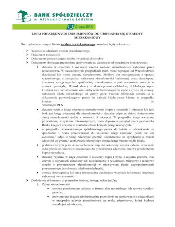 LISTA NIEZBĘDNYCH DOKUMENTÓW DO UBIEGANIA SIĘ O KREDYT MIESZKANIOWY Do uzyskania w naszym Banku kredytu mieszkaniowego potrzebne będą dokumenty: Wniosek o udzielenie kredytu mieszkaniowego Dokument tożsamości Dokumenty potwierdzające źródło i wysokość dochodów Dokumenty dotyczące przedmiotu kredytowania (w zależności od przedmiotu kredytowania): aktualna (z ostatnich 6 miesięcy) wycena wartości nieruchomości wykonana przez rzeczoznawcę. W uzasadnionych przypadkach Bank może wymagać od Wnioskodawcy aktualizacji lub nowej wyceny nieruchomości. Możliwe jest zrezygnowanie z operatu szacunkowego w przypadku: nabywania nieruchomości budowanej przez dewelopera, inwestora zastępczego lub spółdzielnię mieszkaniową – pod warunkiem zawarcia w umowie pomiędzy Wnioskodawcą a deweloperem/spółdzielnią dokładnego opisu kredytowanej nieruchomości oraz dołączenia harmonogramu wpłat z tytułu tej umowy; nabywania lokalu mieszkalnego od gminy, gdzie wszelkie informacje zawarte są w dokumencie potwierdzającym prawo do nabycia lokalu przez klienta; w przypadku kredytu do 300 000,00 PLN. aktualny odpis z księgi wieczystej nieruchomości (odpis z ostatnich 3 miesięcy) lub jeśli brak jest księgi wieczystej dla nieruchomości – aktualny odpis ze zbioru dokumentów danej nieruchomości (odpis z ostatnich 3 miesięcy). W przypadku księgi wieczystej prowadzonej w systemie informatycznym, Bank dopuszcza przegląd przez pracownika Banku księgo wieczystej w Centralnej Bazie Danych Ksiąg Wieczystych. w przypadku własnościowego spółdzielczego prawa do lokalu – oświadczenie ze spółdzielni o braku przeciwskazań do założenia księgi wieczystej (jeżeli nie jest założona)/ odpis z księgi wieczystej gruntu/ oświadczenie ze spółdzielni o prawie własności do gruntu/ użytkowania wieczystego i braku księgi wieczystej dla lokalu. podstawa nabycia praw do nieruchomości (np. akt notarialny, umowa nabycia, orzeczenie sądu, przydział, umowa zobowiązująca do przeniesienia własności, umowa przedwstępna kupna-sprzedaży). aktualny (wydany w ciągu ostatnich 3 miesięcy) wypis i wyrys z rejestru gruntów oraz decyzja o warunkach zabudowy lub zaświadczenie z właściwego miejscowo i rzeczowo urzędu o przeznaczeniu nieruchomości w miejscowym planie zagospodarowania przestrzennego (nie dotyczy lokali mieszkalnych). umowa deweloperska lub inna równoważna zawierająca wszystkie informacje dotyczące nabywanej nieruchomości. Dodatkowe dokumenty w przypadku kredytu, którego celem jest/są: 1. Zakup nieruchomości: umowa przedwstępna nabycia w formie aktu notarialnego lub umowy cywilnoprawnej; prawomocna decyzja administracyjna pozwolenia na użytkowanie z załącznikami w przypadku nabycia nieruchomości na rynku pierwotnym, której budowa została już zakończona; zaświadczenie ze spółdzielni o braku zaległości w opłatach wraz z informacją, komu przysługuje spółdzielcze własnościowe prawo do domu/lokalu – w przypadku zakupu spółdzielczego własnościowego prawa. 2. Zakup domu jednorodzinnego lub lokalu mieszkalnego od gminy lub Skarbu Państwa lub zakładu pracy: zaświadczenie gminy lub zakładu pracy o przeznaczeniu domu jednorodzinnego lub lokalu mieszkalnego do sprzedaży oraz cenie domu jednorodzinnego/lokalu mieszkalnego, a także o przysługującym Wnioskodawcy prawie pierwszeństwa nabycia tego domu jednorodzinnego/lokalu mieszkalnego i oświadczenie Wnioskodawcy o skorzystaniu z przysługującego mu prawa, albo zaświadczenie z gminy lub zakładu pracy o wyłonieniu nabywcy domu jednorodzinnego/lokalu mieszkalnego w drodze przetargu oraz cenie nabycia nieruchomości; 3. zmiana spółdzielczego lokatorskiego prawa do lokalu mieszkalnego/spółdzielczego własnościowego prawa do lokalu mieszkalnego w prawo własności: zaświadczenie ze spółdzielni mieszkaniowej o przydziale lokalu i wartości wkładu mieszkaniowego i budowlanego, zgoda spółdzielni mieszkaniowej na zmianę prawa do lokalu, zaświadczenie ze spółdzielni o braku zaległości w opłatach. 4. budowa, dokończenie budowy (wykończenie domu jednorodzinnego), rozbudowa, przebudowa, generalny remont, modernizacja realizowane przez Wnioskodawcę: pozwolenie na budowę lub przebudowę wraz z załącznikami o ile są wymagane przez organy administracyjne, harmonogram budowy, zaświadczenia o niezaleganiu z podatkiem od nieruchomości; dokumentacja projektowo-kosztorysowa obejmująca: zatwierdzony projekt architektoniczny z opisem technicznym (jeśli zakres robót wymaga zmiany projektu) oraz zestawienie całkowitych kosztów realizacji inwestycji, kosztów poniesionych i do poniesienia, fotografie wskazujące na stan zaawansowania robót budowlanych; dokumenty potwierdzające ubezpieczenie placu budowy od zdarzeń losowych lub domu jednorodzinnego/lokalu mieszkalnego od ognia i innych zdarzeń losowych; harmonogram budowy. 5. inwestycje realizowane przez inwestora zastępczego: umowa z inwestorem zastępczym, zawarta w formie aktu notarialnego lub umowy cywilno – prawnej, z zastrzeżeniem, iż możliwość przyjęcia umowy cywilno-prawnej dotyczy tylko inwestycji, co do których rozpoczęcie sprzedaży rozpoczęło się przed 28 kwietnia 2012r; oświadczenie inwestora zastępczego (na drukach Banku); pozwolenie na budowę zawierające klauzulę prawomocności, sporządzony przez inwestora harmonogram wnoszenia środków pieniężnych przez Wnioskodawcę (jeśli nie został zamieszczony w umowie zawartej miedzy Wnioskodawcą a inwestorem zastępczym); dokumenty dotyczące inwestora: odpis z KRS/zaświadczenie o wpisie do Centralnej Ewidencji i Informacji o Działalności Gospodarczej; kopia lub wypis z harmonogramu realizacji zaakceptowanego przez inwestora zastępczego, inwestycji sporządzonego lub 6. spłata innego kredytu mieszkaniowego w innym banku: umowa kredytu zawarta między Wnioskodawcą a bankiem wraz z aktualnym harmonogramem spłat; zaświadczenie z ban