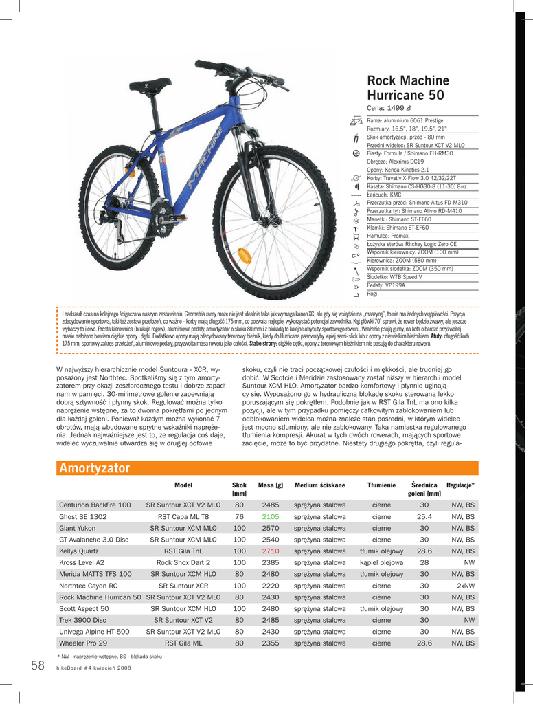 Rock Machine Hurricane 50 Cena: 1499 zł Rama: aluminium 6061 Prestige Rozmiary: 16.5”, 18”, 19.5”, 21” Skok amortyzacji: przód - 80 mm Przedni widelec: SR Suntour XCT V2 MLO Piasty: Formula / Shimano FH-RM30 Obręcze: Alexrims DC19 Opony: Kenda Kinetics 2.1 Korby: Truvativ X-Flow 3.0 42/32/22T Kaseta: Shimano CS-HG30-8 (11-30) 8-rz. Łańcuch: KMC Przerzutka przód: Shimano Altus FD-M310 Przerzutka tył: Shimano Alivio RD-M410 Manetki: Shimano ST-EF60 Klamki: Shimano ST-EF60 Hamulce: Promax Łożyska sterów: Ritchey Logic Zero OE Wspornik kierownicy: ZOOM (100 mm) Kierownica: ZOOM (580 mm) Wspornik siodełka: ZOOM (350 mm) Siodełko: WTB Speed V Pedały: VP199A Rogi: - I nadszedł czas na kolejnego ścigacza w naszym zestawieniu. Geometria ramy może nie jest idealnie taka jak wymaga kanon XC, ale gdy się wsiądzie na „maszynę”, to nie ma żadnych wątpliwości. Pozycja zdecydowanie sportowa, taki też zestaw przełożeń, co ważne - korby mają długość 175 mm, co pozwala najlepiej wykorzystać potencjał zawodnika. Kąt główki 70o sprawi, że rower będzie żwawy, ale jeszcze wybaczy to i owo. Prosta kierownica (brakuje rogów), aluminiowe pedały, amortyzator o skoku 80 mm i z blokadą to kolejne atrybuty sportowego roweru. Wrażenie psują gumy, na koła o bardzo przyzwoitej masie nałożono bowiem ciężkie opony i dętki. Dodatkowo opony mają zdecydowany terenowy bieżnik, kiedy do Hurricana pasowałyby lepiej semi-slick lub z opony z niewielkim bieżnikiem. Atuty: długość korb 175 mm, sportowy zakres przełożeń, aluminiowe pedały, przyzwoita masa roweru jako całości. Słabe strony: ciężkie dętki, opony z terenowym bieżnikiem nie pasują do charakteru roweru. W najwyższy hierarchicznie model Suntoura - XCR, wyposażony jest Northtec. Spotkaliśmy się z tym amortyzatorem przy okazji zeszłorocznego testu i dobrze zapadł nam w pamięci. 30-milimetrowe golenie zapewniają dobrą sztywność i płynny skok. Regulować można tylko naprężenie wstępne, za to dwoma pokrętłami po jednym dla każdej goleni. Ponieważ każdym można wykonać 7 obrotów, mają wbudowane sprytne wskaźniki naprężenia. Jednak najważniejsze jest to, że regulacja coś daje, widelec wyczuwalnie utwardza się w drugiej połowie skoku, czyli nie traci początkowej czułości i miękkości, ale trudniej go dobić. W Scotcie i Meridzie zastosowany został niższy w hierarchii model Suntour XCM HLO. Amortyzator bardzo komfortowy i płynnie uginający się. Wyposażono go w hydrauliczną blokadę skoku sterowaną lekko poruszającym się pokrętłem. Podobnie jak w RST Gila TnL ma ono kilka pozycji, ale w tym przypadku pomiędzy całkowitym zablokowaniem lub odblokowaniem widelca można znaleźć stan pośredni, w którym widelec jest mocno stłumiony, ale nie zablokowany. Taka namiastka regulowanego tłumienia kompresji. Akurat w tych dwóch rowerach, mających sportowe zacięcie, może to być przydatne. Niestety drugiego pokrętła, czyli regula- Amortyzator Centurion Backfire 100 Ghost SE 1302 Model Skok [mm] Masa [g] Medium ściskane Tłumienie SR Suntour XCT V2 MLO 80 2485 sprężyna stalowa cierne 30 NW, BS RST Capa ML T8 76 2105 sprężyna stalowa cierne 25.4 NW, BS Giant Yukon SR Suntour XCM MLO 100 2570 sprężyna stalowa cierne 30 NW, BS GT Avalanche 3.0 Disc SR Suntour XCM MLO 100 2540 sprężyna stalowa cierne 30 NW, BS NW, BS RST Gila TnL 100 2710 sprężyna stalowa tłumik olejowy 28.6 Rock Shox Dart 2 100 2385 sprężyna stalowa kąpiel olejowa 28 NW SR Suntour XCM HLO 80 2480 sprężyna stalowa tłumik olejowy 30 NW, BS SR Suntour XCR 100 2220 sprężyna stalowa cierne 30 2xNW 80 2430 sprężyna stalowa cierne 30 NW, BS 100 2480 sprężyna stalowa tłumik olejowy 30 NW, BS Kellys Quartz Kross Level A2 Merida MATTS TFS 100 Northtec Cayon RC Rock Machine Hurrican 50 SR Suntour XCT V2 MLO Scott Aspect 50 Trek 3900 Disc Univega Alpine HT-500 SR Suntour XCM HLO SR Suntour XCT V2 80 2485 sprężyna stalowa cierne 30 NW SR Suntour XCT V2 MLO 80 2430 sprężyna stalowa cierne 30 NW, BS RST Gila ML 80 2355 sprężyna stalowa cierne 28.6 NW, BS Wheeler Pro 29 58 Średnica Regulacje* goleni [mm] * NW - naprężenie wstępne, BS - blokada skoku bi k eB oar d #4 k wi ecień 2008