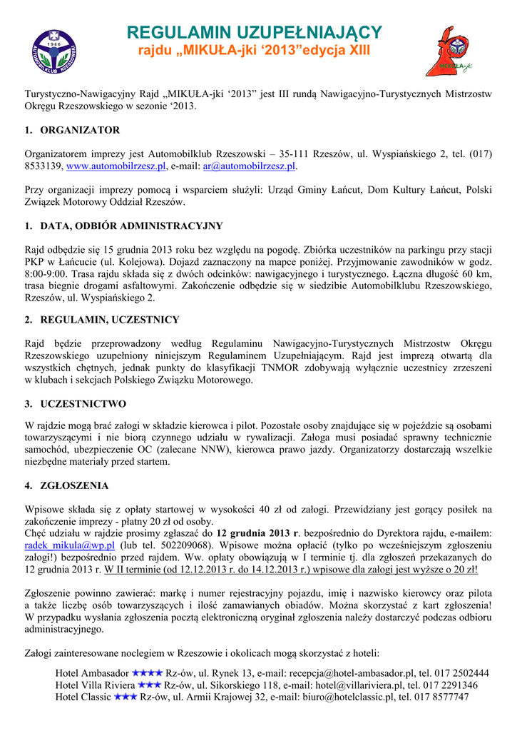 REGULAMIN UZUPEŁNIAJĄCY rajdu „MIKUŁA-jki ‘2013”edycja XIII Turystyczno-Nawigacyjny Rajd „MIKUŁA-jki ‘2013” jest III rundą Nawigacyjno-Turystycznych Mistrzostw Okręgu Rzeszowskiego w sezonie ‘2013. 1. ORGANIZATOR Organizatorem imprezy jest Automobilklub Rzeszowski – 35-111 Rzeszów, ul. Wyspiańskiego 2, tel. (017) 8533139, www.automobilrzesz.pl, e-mail: [email protected]. Przy organizacji imprezy pomocą i wsparciem służyli: Urząd Gminy Łańcut, Dom Kultury Łańcut, Polski Związek Motorowy Oddział Rzeszów. 1. DATA, ODBIÓR ADMINISTRACYJNY Rajd odbędzie się 15 grudnia 2013 roku bez względu na pogodę. Zbiórka uczestników na parkingu przy stacji PKP w Łańcucie (ul. Kolejowa). Dojazd zaznaczony na mapce poniżej. Przyjmowanie zawodników w godz. 8:00-9:00. Trasa rajdu składa się z dwóch odcinków: nawigacyjnego i turystycznego. Łączna długość 60 km, trasa biegnie drogami asfaltowymi. Zakończenie odbędzie się w siedzibie Automobilklubu Rzeszowskiego, Rzeszów, ul. Wyspiańskiego 2. 2. REGULAMIN, UCZESTNICY Rajd będzie przeprowadzony według Regulaminu Nawigacyjno-Turystycznych Mistrzostw Okręgu Rzeszowskiego uzupełniony niniejszym Regulaminem Uzupełniającym. Rajd jest imprezą otwartą dla wszystkich chętnych, jednak punkty do klasyfikacji TNMOR zdobywają wyłącznie uczestnicy zrzeszeni w klubach i sekcjach Polskiego Związku Motorowego. 3. UCZESTNICTWO W rajdzie mogą brać załogi w składzie kierowca i pilot. Pozostałe osoby znajdujące się w pojeździe są osobami towarzyszącymi i nie biorą czynnego udziału w rywalizacji. Załoga musi posiadać sprawny technicznie samochód, ubezpieczenie OC (zalecane NNW), kierowca prawo jazdy. Organizatorzy dostarczają wszelkie niezbędne materiały przed startem. 4. ZGŁOSZENIA Wpisowe składa się z opłaty startowej w wysokości 40 zł od załogi. Przewidziany jest gorący posiłek na zakończenie imprezy - płatny 20 zł od osoby. Chęć udziału w rajdzie prosimy zgłaszać do 12 grudnia 2013 r. bezpośrednio do Dyrektora rajdu, e-mailem: [email protected] (lub tel. 502209068). Wpisowe można opłacić (tylko po wcześniejszym zgłoszeniu załogi!) bezpośrednio przed rajdem. Ww. opłaty obowiązują w I terminie tj. dla zgłoszeń przekazanych do 12 grudnia 2013 r. W II terminie (od 12.12.2013 r. do 14.12.2013 r.) wpisowe dla załogi jest wyższe o 20 zł! Zgłoszenie powinno zawierać: markę i numer rejestracyjny pojazdu, imię i nazwisko kierowcy oraz pilota a także liczbę osób towarzyszących i ilość zamawianych obiadów. Można skorzystać z kart zgłoszenia! W przypadku wysłania zgłoszenia pocztą elektroniczną oryginał zgłoszenia należy dostarczyć podczas odbioru administracyjnego. Załogi zainteresowane noclegiem w Rzeszowie i okolicach mogą skorzystać z hoteli: Hotel Ambasador Rz-ów, ul. Rynek 13, e-mail: [email protected], tel. 017 2502444 Hotel Villa Riviera Rz-ów, ul. Sikorskiego 118, e-mail: [email protected], tel. 017 2291346 Hotel Classic Rz-ów, ul. Armii Krajowej 32, e-mail: [email protected], tel. 017 8577747 Hotel Polonia Rz-ów, ul. Grottgera 16, e-mail: [email protected], tel. 017 8520312 Hotel Orion Rz-ów, ul. Krakowska 443, e-mail: [email protected], tel. 017 8637351 Hotel Sportowy Rz-ów, ul. Jałowego 23 a, e-mail: [email protected], tel. 017 8592483 Hotel Iskra Rz-ów, ul. Dąbrowskiego 75 e-mail: [email protected], tel. 017 8549740 Schronisko Młodzieżowe PTSM Rz-ów, ul. Rynek 25, tel. 017 8534430 Motel Bogdanka, Łańcut, Armii Krajowej 82, e-mail: [email protected], tel. 017 2257451 Dom Wycieczkowy PTTK, Łańcut, ul. Dominikańska 1, e-mail: [email protected], tel. 017 2252052 Szkolne Schronisko Młodzieżowe, Łańcut, ul. Mickiewicza 3, tel. 017 2252961 PROGRAM RAJDU: 15 grudnia 2013 r. (niedziela) 8:00-9:00 - przyjmowanie uczestników 9:00 - obowiązkowa odprawa przedstartowa 9:30 - start do odcinka I ok. 10:30 - test BRD (bezpieczeństwo ruchu drogowego) i PPP(pierwsza pomoc przedmedyczna), start do odcinka II, w jego trakcie zwiedzanie skansenu Zagrody Muzeum Wsi Markowa ok. 15:00 - przyjazd pierwszej załogi na metę od 15:00 - gorący obiad ok. 16:00 - test turystyczny, kawa i herbata, poczęstunek ok. 18:00 - ogłoszenie wyników rajdu i uroczyste wręczenie nagród, zakończenie imprezy Uwaga: Organizator zastrzega sobie prawo wprowadzenia korekt czasowych. 5. WŁADZE RAJDU Dyrektor rajdu Kierownik trasy Biuro rajdu Przewodniczący komisji obliczeń Autorzy trasy Weryfikator trasy Radosław Mikuła Bożena Mikuła Bożena Mikuła, Agnieszka Mikuła Jerzy Gierałt Radosław Mikuła, Marcin Szczygieł Bożena Mikuła 6. JURY Radosław Mikuła – przewodniczący OKSPiT PZM Rzeszów (przewodniczący Jury) Bożena Mikuła – przedstawiciel organizatora – wylosowany przedstawiciel zawodników 7. POSTANOWIENIA KOŃCOWE Zaleca się zaopatrzenie załóg w latarkę, ciepłe ubranie (buty) oraz kompas. Samochód powinien być wyposażony w opony zimowe, linkę holowniczą i łopatkę do śniegu. Organizator nie przyjmuje na siebie żadnej odpowiedzialności za szkody i straty tak w stosunku do załóg i ich sprzętu, jak też za spowodowane przez nich straty w stosunku do osób trzecich ich mienia przez cały czas trwania imprezy. Przez podpisanie zgłoszenia załoga i jej osoby towarzyszące zobowiązują się do bezwzględnego przestrzegania regulaminu TNMOR i niniejszego regulaminu uzupełniającego imprezy, poszanowania przepisów ruchu drogowego, ppoż. i porządkowych podczas trwania rajdu. Organizator zastrzega sobie prawo do wprowadzania dodatkowych komunikatów przedstartowych i zarządzeń. Dyrektor rajdu Radosław Mikuła Mapka dojazdowa do STARTU rajdu: parking ul. Kolejowa (przy stacji PKP).