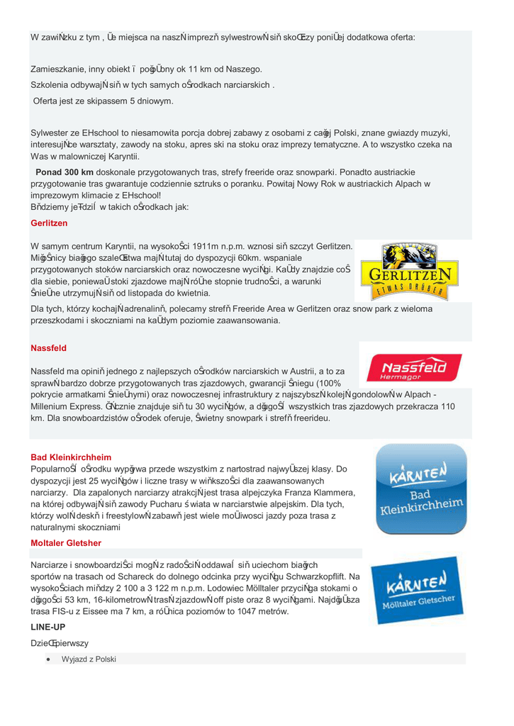W zawiązku z tym , że miejsca na naszą imprezę sylwestrową się skończy poniżej dodatkowa oferta: Zamieszkanie, inny obiekt – położony ok 11 km od Naszego. Szkolenia odbywają się w tych samych ośrodkach narciarskich . Oferta jest ze skipassem 5 dniowym. Sylwester ze EHschool to niesamowita porcja dobrej zabawy z osobami z całej Polski, znane gwiazdy muzyki, interesujące warsztaty, zawody na stoku, apres ski na stoku oraz imprezy tematyczne. A to wszystko czeka na Was w malowniczej Karyntii. Ponad 300 km doskonale przygotowanych tras, strefy freeride oraz snowparki. Ponadto austriackie przygotowanie tras gwarantuje codziennie sztruks o poranku. Powitaj Nowy Rok w austriackich Alpach w imprezowym klimacie z EHschool! Będziemy jeździć w takich ośrodkach jak: Gerlitzen W samym centrum Karyntii, na wysokości 1911m n.p.m. wznosi się szczyt Gerlitzen. Miłośnicy białego szaleństwa mają tutaj do dyspozycji 60km. wspaniale przygotowanych stoków narciarskich oraz nowoczesne wyciągi. Każdy znajdzie coś dla siebie, ponieważ stoki zjazdowe mają różne stopnie trudności, a warunki śnieżne utrzymują się od listopada do kwietnia. Dla tych, którzy kochają adrenalinę, polecamy strefę Freeride Area w Gerlitzen oraz snow park z wieloma przeszkodami i skoczniami na każdym poziomie zaawansowania. Nassfeld Nassfeld ma opinię jednego z najlepszych ośrodków narciarskich w Austrii, a to za sprawą bardzo dobrze przygotowanych tras zjazdowych, gwarancji śniegu (100% pokrycie armatkami śnieżnymi) oraz nowoczesnej infrastruktury z najszybszą koleją gondolową w Alpach Millenium Express. Łącznie znajduje się tu 30 wyciągów, a długość wszystkich tras zjazdowych przekracza 110 km. Dla snowboardzistów ośrodek oferuje, świetny snowpark i strefę freerideu. Bad Kleinkirchheim Popularność ośrodku wypływa przede wszystkim z nartostrad najwyższej klasy. Do dyspozycji jest 25 wyciągów i liczne trasy w większości dla zaawansowanych narciarzy. Dla zapalonych narciarzy atrakcją jest trasa alpejczyka Franza Klammera, na której odbywają się zawody Pucharu Świata w narciarstwie alpejskim. Dla tych, którzy wolą deskę i freestylową zabawę jest wiele możliwosci jazdy poza trasa z naturalnymi skoczniami Moltaler Gletsher Narciarze i snowboardziści mogą z radością oddawać się uciechom białych sportów na trasach od Schareck do dolnego odcinka przy wyciągu Schwarzkopflift. Na wysokościach między 2 100 a 3 122 m n.p.m. Lodowiec Mölltaler przyciąga stokami o długości 53 km, 16-kilometrową trasą zjazdową off piste oraz 8 wyciągami. Najdłuższa trasa FIS-u z Eissee ma 7 km, a różnica poziomów to 1047 metrów. LINE-UP Dzień pierwszy · Wyjazd z Polski · Nocny przejazd Dzień drugi · Przyjazd do miejscowości Faak am See · Zakwaterowanie w hotelu · Obiadokolacja w hotelu · Impreza integracyjna w hotelu Dzień trzeci · Śniadanie · Wyjazd na stok Nassfeld · Obiadokolacja · Wieczorne animacje Dzień czwarty · Śniadanie · Wyjazd na stok Moltaler Gletsher (lodowiec) · Powrót do hotelu · Obiadokolacja · Wieczorne animacje Dzień piąty · Śniadanie · Wyjazd na stok Gerlitzen · Wyjazd na zakupy w supermarkecie · Kolacja sylwestrowa i start imprezy Dzień szósty · Śniadanie · Wyjazd na stok Nassfeld · Powrót do hotelu · Obiadokolacja · Wieczorne animacje Dzień siódmy · Śniadanie · Wykwaterowanie · Wyjazd na stok Bad Kleinkirchheim i jazda w opór · Wejście na Termy Romańskie w Bad Kleinkirchheim · Kolacja we własnym zakresie w licznych knajpkach w Bad Kleinkirchheim · Wyjazd do Polski Dzień ósmy · Przyjazd do Polski Podany program ma charakter ramowy i poszczególne punkty mogą ulec zmianie, zamianie lub wykreśleniu w zależności od warunków czasowych i pogodowych. Transport Autokarem Przystanki autokaru Dopłata [zł] Godzina Data wsiadania Warszawa Plac Bankowy Zamów TAXI Grosik: 22 6464646 bez dopłaty 2300 W dniu rozpoczęcia Łódź Stacja Orlen, Róg Strykowskiej i Wycieczkowej bez dopłaty 0100 Dzień po rozpoczęciu Kraków Parking KFC, ul. Conrada 83 bez dopłaty 0300 Dzień po rozpoczęciu Katowice McDonald/Hotel Campanile, Aleja Górnośląska bez dopłaty 0400 Dzień po rozpoczęciu Wrocław Skwer Joanitów/Dawida bez dopłaty 0600 Dzień po rozpoczęciu ZAKWATEROWANIE Pensjonat Popolari*** Położenie: 3-gwiazdkowy sprawdzony standard gwarantuje komfortowy pobyt dla bardziej wymagających. Pensjonat znajduje się w miejscowości Faak am See. Z tarasów i balkonów rozciąga się przepiękny widok na góry Karyntii oraz piękny i majestatyczny szczyt Karawanken Mittagskogel. Lokale: Do dyspozycji są komfortowo wyposażone pokoje 2, 3, 4 osobowe. Każdy pokój posiada balkon lub taras od nasłonecznionej strony południowej. W pokojach znajduje się łazienka z prysznicem. Niektóre z nich są częścią apartamentów. Apartamenty składają się z 2 pomieszczeń. Infrastruktura: W hotelu można atrakcyjnie spędzić czas przy lokalnych specjałach w bogato wyposażonym barze, lub restauracji. WYŻYWIENIE HB Śniadania W formie bufetu w hotelowej restauracji. Do wyboru: · Wędliny · Nabiał · Przetwory z owoców · Dania z jaj · Płatki śniadaniowe i musli W skład każdego dania wchodzą świeże warzywa, pieczywo i masło naturalne oraz napoje, soki, kawa i herbata oraz mleko. Obiadokolacje Serwowane w hotelowej restauracji. W skład wchodzą: · Przekąski na zimno · Zupy do wyboru · Danie główne (mięsa i ryby, dania regionalne w skład każdego dania wchodzą warzywa gotowane na parze bądź w postaci surówek) - możliwość wyboru dań wegetariańskich · Deser SZKOLENIA Podczas wyjazdu macie możliwość szkolić się pod okiem wykwalifikowanej kadry, na każdym poziomie zaawansowania zarówno na desce jak i nartach. Szkolenie odbywa się codziennie przez 5 dni w małych grupach szkoleniowych przez 2,5 godz. Popołudniami odbywa się wideoanaliza techniki jazdy oraz pokaz