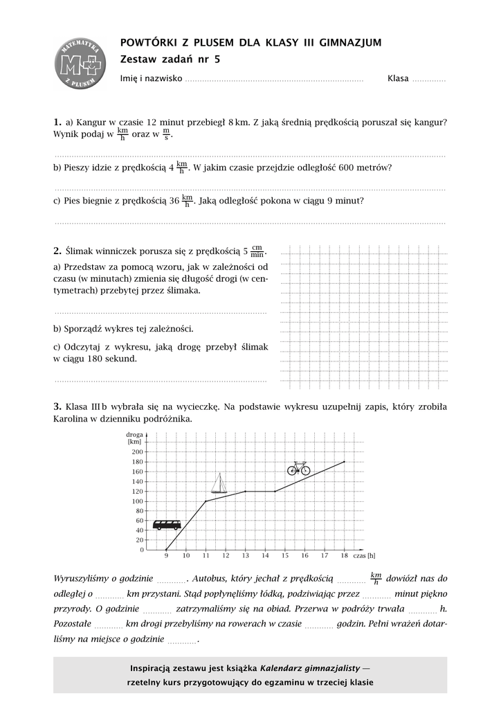 POWTÓRKI Z PLUSEM DLA KLASY III GIMNAZJUM Zestaw zadań nr 5 Imię i nazwisko Klasa .......................................................................... .............. 1. a) Kangur w czasie 12 minut przebiegł 8 km. Z jaką średnią prędkością poruszał się kangur? km m Wynik podaj w h oraz w s . .................................................................................................................................................................. km b) Pieszy idzie z prędkością 4 h . W jakim czasie przejdzie odległość 600 metrów? .................................................................................................................................................................. c) Pies biegnie z prędkością 36 km h . Jaką odległość pokona w ciągu 9 minut? .................................................................................................................................................................. cm 2. Ślimak winniczek porusza się z prędkością 5 min . a) Przedstaw za pomocą wzoru, jak w zależności od czasu (w minutach) zmienia się długość drogi (w centymetrach) przebytej przez ślimaka. ........................................................................................ b) Sporządź wykres tej zależności. c) Odczytaj z wykresu, jaką drogę przebył ślimak w ciągu 180 sekund. ........................................................................................ 3. Klasa III b wybrała się na wycieczkę. Na podstawie wykresu uzupełnij zapis, który zrobiła Karolina w dzienniku podróżnika. Wyruszyliśmy o godzinie odległej o ............ ............ . Autobus, który jechał z prędkością ............ km przystani. Stąd popłynęliśmy łódką, podziwiając przez przyrody. O godzinie Pozostałe ............ ............ dowiózł nas do ............ minut piękno zatrzymaliśmy się na obiad. Przerwa w podróży trwała km drogi przebyliśmy na rowerach w czasie liśmy na miejsce o godzinie km h ............ ............ ............ h. godzin. Pełni wrażeń dotar- . Inspiracją zestawu jest książka Kalendarz gimnazjalisty — rzetelny kurs przygotowujący do egzaminu w trzeciej klasie 4. Z miejscowości A o godzinie 9:00 wyjechał autobus PKS, a w ślad za nim o godzinie 10:00 samochód osobowy. Oba pojazdy jadą ze stałą prędkością do miejscowości B odległej od A o 240 km. a) W jakiej odległości od miejscowości B samochód osobowy wyprzedzi autobus? A. 160 km B. 80 km C. 120 km D. 60 km b) Z jaką prędkością jedzie samochód osobowy? A. 50 km h B. 60 km h C. 120 km h D. 96 km h c) O której godzinie samochód osobowy wyprzedzi autobus? A. o 11:20 B. o 11:40 C. o 12:30 D. o 12:00 5. Artur wybrał się rowerem do lasu. Wykres przedstawia, jak zmieniała się w czasie długość trasy, którą Artur miał jeszcze pokonać, by dotrzeć do lasu. a) Odczytaj z wykresu, jak długo Artur jechał do lasu. ....................................................................................................... b) Po jakim czasie Artur pokonał 3 pierwsze kilometry trasy? ....................................................................................................... c) Oblicz średnią prędkość jazdy Artura. Wynik podaj w km h . ....................................................................................................... 6. W pewnej korporacji koszt przejazdu taksówką składa się z opłaty początkowej w wysokości 6 zł oraz opłaty 3,50 zł za każdy przejechany kilometr. a) Ile złotych zapłaci pani Ania za przejazd taksówką tej korporacji do dworca PKP odległego o 9 km od jej miejsca zamieszkania? .................................................................................................................................................................. b) Pan Jurek zapłacił za kurs 20 zł. Ile kilometrów przejechał taksówką? .................................................................................................................................................................. c) Pan Adam zamówił taksówkę przez telefon, w związku z czym przysługuje mu 10% rabatu. Ile zapłaci za przejazd 15 km? .................................................................................................................................................................. 7. W II etapie wyścigu kolarskiego Tour de Pologne kolarz ma do mety jeszcze 180 km i jedzie ze średnią prędkością 45 km h . a) Narysuj wykres przedstawiający, jak zmieniała się odległość kolarza od mety (w kilometrach) w zależności od czasu (w godzinach). b) Odczytaj z wykresu, w jakiej odległości od mety, znajdował się kolarz po trzech godzinach jazdy. ............................................................................... Inspiracją zestawu jest książka Kalendarz gimnazjalisty — rzetelny kurs przygotowujący do egzaminu w trzeciej klasie