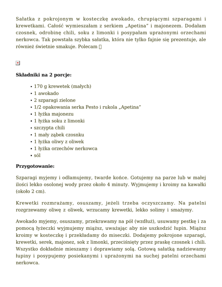Sałatka z pokrojonym w kosteczkę awokado, chrupiącymi szparagami i krewetkami. Całość wymieszałam z serkiem „Apetina” i majonezem. Dodałam czosnek, odrobinę chili, soku z limonki i posypałam uprażonymi orzechami nerkowca. Tak powstała szybka sałatka, która nie tylko fajnie się prezentuje, ale również świetnie smakuje. Polecam Składniki na 2 porcje: 170 g krewetek (małych) 1 awokado 2 szparagi zielone 1/2 opakowania serka Pesto i rukola „Apetina” 1 łyżka majonezu 1 łyżka soku z limonki szczypta chili 1 mały ząbek czosnku 1 łyżka oliwy z oliwek 1 łyżka orzechów nerkowca sól Przygotowanie: Szparagi myjemy i odłamujemy, twarde końce. Gotujemy na parze lub w małej ilości lekko osolonej wody przez około 4 minuty. Wyjmujemy i kroimy na kawałki (około 2 cm). Krewetki rozmrażamy, osuszamy, jeżeli trzeba oczyszczamy. Na patelni rozgrzewamy oliwę z oliwek, wrzucamy krewetki, lekko solimy i smażymy. Awokado myjemy, osuszamy, przekrawamy na pół (wzdłuż), usuwamy pestkę i za pomocą łyżeczki wyjmujemy miąższ, uważając aby nie uszkodzić łupin. Miąższ kroimy w kosteczkę i przekładamy do miseczki. Dodajemy pokrojone szparagi, krewetki, serek, majonez, sok z limonki, przeciśnięty przez praskę czosnek i chili. Wszystko dokładnie mieszamy i doprawiamy solą. Gotową sałatką nadziewamy łupiny i posypujemy posiekanymi i uprażonymi na suchej patelni orzechami nerkowca. Smacznego
