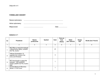 Załącznik nr 4 FORMULARZ CENOWY Nazwa wykonawcy ................................................................................................. Adres wykonawcy ................................................................................................. Miejscowość ................................................ Data ..................... Zadanie nr 1 Lp. Przedmiot Nazwa producenta 1 2 3 Symbol Ilość Cena za 1/szt. (Netto) Netto (kol. 5xkol.6) Kwota VAT Brutto (kol.7+kol.8) 4 5 6 7 8 9 1. MS Office w wersji dla edukacji: „OfficeProPlus SNGL LicSAPk OLP NL Acdmc” 37 2. VMware Workstation 10 upgrade from version 9 for Linux and Windows 3 3. 4. MS Visual studio w wersji dla edukacji: “VSProwMSDN ALNG LicSAPk OLP NL Acdmc Qlfd” Acronis Backup & Recovery Server 11.5 for Linux 1 1 1 Załącznik nr 4 5. 6. 7. Moduł dodatkowy do “Acronis Backup & Recovery Server 11.5 for Linux” z punktu 4: Universal Restore Autodesk Design Academy 2014 Education New NLM Moduł dodatkowy do: “Autodesk Design Academy 2014 Education New NLM” Autodesk Design Academy Education Subscription (1 year) 1 10 10 RAZEM (brutto) Wartości netto, VAT, brutto należy przenieść do formularza ofertowego w miejsce przeznaczone do wpisania wartości za wykonanie przedmiotu zamówienia. ................................................................................. (data i czytelny podpis wykonawcy) 2 Załącznik nr 4 FORMULARZ CENOWY Nazwa wykonawcy ................................................................................................. Adres wykonawcy ................................................................................................. Miejscowość ................................................ Data ..................... Zadanie nr 2 Lp. Przedmiot Nazwa producenta 1 2 3 1. Laserowe drukarki wielofunkcyjne Symbol Ilość Cena za 1/szt. (Netto) Netto (kol. 5xkol.6) Kwota VAT Brutto (kol.7+kol.8) 4 5 6 7 8 9 4 RAZEM (brutto) Wartości netto, VAT, brutto należy przenieść do formularza ofertowego w miejsce przeznaczone do wpisania wartości za wykonanie przedmiotu zamówienia. ................................................................................. (data i czytelny podpis wykonawcy) 3 Załącznik nr 4 FORMULARZ CENOWY Nazwa wykonawcy ................................................................................................. Adres wykonawcy ................................................................................................. Miejscowość ................................................ Data ..................... Zadanie nr 3 Lp. Przedmiot Nazwa producenta 1 2 3 1. HP ProLiant DL385p Generation 8 lub równoważny Symbol Ilość Cena za 1/szt. (Netto) Netto (kol. 5xkol.6) Kwota VAT Brutto (kol.7+kol.8) 4 5 6 7 8 9 1 RAZEM (brutto) Wartości netto, VAT, brutto należy przenieść do formularza ofertowego w miejsce przeznaczone do wpisania wartości za wykonanie przedmiotu zamówienia. ................................................................................. (data i czytelny podpis wykonawcy) 4 Załącznik nr 4 FORMULARZ CENOWY Nazwa wykonawcy ................................................................................................. Adres wykonawcy ................................................................................................. Miejscowość ................................................ Data ..................... Zadanie nr 4 Lp. Przedmiot Nazwa producenta 1 2 3 Symbol Ilość Cena za 1/szt. (Netto) Netto (kol. 5xkol.6) Kwota VAT Brutto (kol.7+kol.8) 4 5 6 7 8 9 Kabel USB 2.0 A-B M/M 3m 10 2 KABEL SIECIOWY ETHERNET LAN CAT.5E RJ-45 1,5m 60 3 KABEL SIECIOWY ETHERNET LAN CAT.5E RJ-45 3m 60 4 KABEL SIECIOWY ETHERNET LAN CAT.5E RJ-45 10m 60 5 Kabel krosowy RJ45, kat. 5e, UTP 30 6 Zestaw klawiatura/mysz Bezprzewodowa 4 1. 5 Załącznik nr 4 7 Kabel krosowy RJ45, kat. 5e, UTP 30 8 Mysz komputerowa, przewodowa -USB 10 9 Mysz komputerowa bezprzewodowe 4 10 Klawiatura komputerowa, przewodowa – PS2 10 11 Klawiatura komputerowa, przewodowa – USB 10 Dysk przenośny/zewnętrzny 4 Karta sieciowa 1000Base-T, 10 Twardy dysk wewnętrzny do komputera 15 Listwa sieciowa – zasilająca z ochroną przeciwprzepięciową 10 A 15 Listwa sieciowa – zasilająca z ochroną przeciwprzepięciową 10 A 15 Pilot do prezentacji USB 5 Pianka do czyszczenia ekranów LCD 10 12 13 14 15 16 17 18 6 Załącznik nr 4 19 20 Pianka do czyszczenia laptopów 10 Gaz sprężony 400 ml 12 21 Zestaw opasek zaciskowych – różnej długości, różne kolory 22 Słuchawki z mikrofonem do komputera 10 Dysk 900GB/10K SAS do serwera HP ProLiant DL385p Gen8 8 23 1-op. RAZEM (brutto) Wartości netto, VAT, brutto należy przenieść do formularza ofertowego w miejsce przeznaczone do wpisania wartości za wykonanie przedmiotu zamówienia. ................................................................................. (data i czytelny podpis wykonawcy) 7