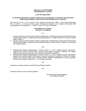 Uchwała nr XLVIII/775/2009 Rady Miejskiej w Czeladzi z dnia 26 lutego 2009r. w sprawie podwyższenia kapitału zakładowego Czeladzkiego Towarzystwa Budownictwa Społecznego Spółka z ograniczoną odpowiedzialnością w Czeladzi Na mocy art. 18 ust. 1 i ust. 2 pkt 9 lit. f) i g) ustawy z dnia 8 marca 1990 r. o samorządzie gminnym (Dz. U. z 2001 r., nr 142, poz. 1591, z późn. zmianami) w związku z art. 9 ustawy z 20 grudnia 1996 o gospodarce komunalnej (Dz. U. z 2997 nr 9 poz. 43 z późn. zmianami) Rada Miejska w Czeladzi uchwala, co następuje § 1. 1. 2. Wyrazić zgodę na podwyższenie kapitału zakładowego Czeladzkiego Towarzystwa Budownictwa Społecznego Spółka z ograniczoną odpowiedzialnością o kwotę 500.000 zł (słownie: pięćset tysięcy złotych). Wyrazić zgodę na podwyższenie kapitału zakładowego Czeladzkiego Towarzystwa Budownictwa Społecznego Spółka z ograniczoną odpowiedzialnością o kwotę 43.000 zł (słownie: czterdzieści trzy tysiące złotych). § 2. 1. 2. Podwyższenie kapitału zakładowego, o którym mowa w § 1 pkt 1 nastąpi poprzez utworzenie i objęcie przez Gminę Czeladź 5000 (słownie: pięć tysięcy) udziałów o wartości 100 złotych (słownie: sto złotych) każdy, które zostaną pokryte wkładem pieniężnym. Podwyższenie kapitału zakładowego, o którym mowa w § 1 pkt 2 nastąpi poprzez utworzenie i objęcie przez Gminę Czeladź 430 (słownie: czterysta trzydzieści) udziałów o wartości 100 złotych (słownie: sto złotych) każdy, które zostaną pokryte wkładem niepieniężnym w postaci sprzętu, którego wykaz stanowi załącznik nr 1 do niniejszej uchwały. § 3. Wykonanie uchwały powierza się Burmistrzowi Miasta Czeladź. § 4. Uchwała wchodzi w życie z dniem podjęcia. Przewodniczący Rady Miejskiej mgr Sławomir Święch Załącznik nr 1 do Uchwały nr XLVIII/775/2009 Rady Miejskiej w Czeladzi z dnia 26 lutego 2009 r. w sprawie: podwyższenia kapitału zakładowego Czeladzkiego Towarzystwa Budownictwa Społecznego Spółka z ograniczoną odpowiedzialnością w Czeladzi. Zestawienie wartości rynkowej środków trwałych Lp 1 2 3 4 5 6 7 8 9 10 11 12 13 14 15 16 17 18 19 20 21 22 23 24 25 26 27 28 29 30 31 32 33 34 35 36 37 38 39 Nazwa środka trwałego Szafka pomocnik Biurko Szafa aktowa Fotel ERAZM brązowy Fotel ERAZM brązowy Fotel ERAZM brązowy Szafka pomocnik Szafa aktowa Krzesło brąz marmur Krzesło brąz marmur Łacznik Szafka Szafka Szafka Fotel TANGO Szafa z nadstawką z zabudowy Biurko Szafa aktowa z nadstawką Stolik okolicznościowy Szafa aktowa Biurko Biurko Centrala telefoniczna NCT Szafka pod zlewozmywak Zlewozmywak dwukomorowy Ogrzewacz elektryczny Blat komputerowy Krzesło brąz marmur Krzesło brąz marmur Blat komputerowy Szafka pomocnik Stolik okolicznościowy Szafa aktowa Stolik Szafka pomocnik Biurko Łącznik Deska kreślarska Łącznik Rok prod. 1996 2000 1997 1996 1996 1996 1996 1996 1996 1996 1996 1996 1996 1996 1996 1996 1999 2003 1996 1996 1996 1997 2005 1997 1997 2003 1996 1996 1996 1996 1996 1996 1996 2003 1996 2001 1996 1996 1996 Wartość rynkowa [zł] 40 40 70 80 80 80 40 80 20 20 30 40 40 40 150 90 70 80 30 80 80 40 800 20 40 40 40 20 20 40 40 20 80 20 40 20 30 30 20 Lp 40 41 42 43 44 45 46 47 48 49 50 51 52 53 54 55 56 57 58 59 60 61 62 63 64 65 66 67 68 69 70 71 72 73 74 75 76 77 78 79 80 81 82 83 84 85 86 87 88 89 90 91 Nazwa środka trwałego Łącznik Szafa aktowa Nadstawka Biurko Biurko Klimatyzator Stolik na papier Szafka pomocnik Krzesło brąz marmur Szafa Stolik okolicznościowy Biurko Biurko Szafa aktowa Szafa aktowa Szafa aktowa Krzesło brąz marmur Nadstawka Nadstawka Nadstawka Stolik komputerowy Stolik komputerowy Szafka pomocnik Szafka pomocnik Krzesło brąz marmur Stolik na papier Biurko Szafka pomocnik Łącznik Krzesło brąz marmur Szafa krosowa UPS UPS HUB 3 COM – 2 szt. Szafka pod xero Szafa aktowa Regał Regał Regał Stolik Stolik Fotel Fotel Biurko Biurko Szafka ubraniowa Szafka niska Szafka ubraniowa Szafka Ławka Ławka Ławka Rok prod. 1998 1998 1998 1998 1998 2005 1997 1996 2002 1997 1996 1996 1996 1996 1996 1996 1996 1997 1997 1997 2002 2007 1996 1996 1996 1997 1996 1996 1996 1998 2002 2007 2007 2001 1996 1996 2000 2000 2000 2000 2000 2000 2000 2000 2000 2000 2000 2000 2000 1993 1993 1993 Wartość rynkowa [zł] 20 60 30 30 40 110 20 40 10 70 20 70 70 80 80 80 20 30 30 30 30 10 40 40 20 20 70 40 20 10 1 110 80 80 50 60 80 10 20 20 10 10 10 10 50 50 30 10 30 20 30 30 30 Lp 92 93 94 95 96 97 98 99 100 101 102 103 104 105 106 107 108 109 110 111 112 113 114 115 116 117 118 119 120 121 122 123 124 125 126 127 128 129 130 131 132 133 134 135 136 137 138 139 140 141 142 Nazwa środka trwałego Krzesło Graf Krzesło Graf Fotel Sylwia Fotel Sylwia Fotel Sylwia Fotel Sylwia Fotel Sylwia Fotel Sylwia Fotel Sylwia Fotel konferencyjny Fotel konferencyjny Fotel konferencyjny Fotel konferencyjny Fotel konferencyjny Fotel konferencyjny Fotel konferencyjny Fotel konferencyjny Fotel konferencyjny Fotel konferencyjny Wiertarka udarowa BOSCH Mieszarka 160A CELMA Młotowiertarka BPR 161 E Szlifierka mimoś. EX 125E Pilarka tarczowa do drewna MAC 1800 Betoniarka - 100l Betoniarka - 100l Mieszarka CELMA PRDA 160A Młot udarowo-obrotowy MAKITA HR 2450 Rusztowanie warszawskie 5,9 m (20 części) Poziomica elektryczna Tel. kom. NOKIA 6610i Krzesło VEGA Krzesło VEGA Krzesło VEGA Krzesło VEGA Krzesło VEGA Krzesło VEGA Krzesło VEGA Krzesło VEGA Krzesło VEGA Krzesło VEGA Młot pneumatyczny Wibrator – BUŁAWA 60 (Wibrator – BUŁAWA 60, napęd BGA HONDA, złączka ¾ bez stopu, redukcja ¾ x ½ MS) Rusztowanie warszawskie (18 części) Pilarka tarczowa 1800W 19 do drewna Wiertarko-wkrętarka HTC Wiertarko-wkrętarka HTC Grzejnik elektryczny-konwektor Gwoździarka SKN 50 Kalkulator CASIO FX-35 Szlifierka kątowa 125 METABO Rok prod. Wartość rynkowa [zł] 1995 1995 1994 1994 1994 1994 1994 1994 1994 1997 1997 1997 1997 1997 1997 1997 1997 1997 1997 2004 