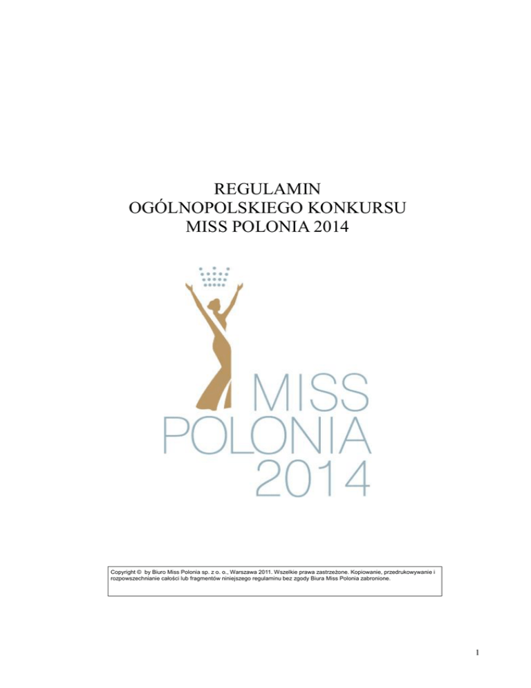 REGULAMIN OGÓLNOPOLSKIEGO KONKURSU MISS POLONIA 2014 Copyright © by Biuro Miss Polonia sp. z o. o., Warszawa 2011. Wszelkie prawa zastrzeżone. Kopiowanie, przedrukowywanie i rozpowszechnianie całości lub fragmentów niniejszego regulaminu bez zgody Biura Miss Polonia zabronione. 1 §1 Postanowienia ogólne 1. Regulamin Ogólnopolskiego Konkursu Miss Polonia 2014 określa sposób i warunki przeprowadzenia Ogólnopolskiego Konkursu Miss Polonia 2014 i może być integralną częścią każdej umowy zawartej pomiędzy Biurem Miss Polonia Spółka z ograniczoną odpowiedzialnością z siedzibą w Warszawie przy ul. Foksal 3/5, 00-366 Warszawa oraz: Uczestniczką Ogólnopolskiego Konkursu Miss Polonia 2014, zgodnie z § 2 pkt 21 niniejszego Regulaminu, Współorganizatorem, zgodnie z § 2 pkt 20. Regulaminu, Telewizją współorganizującą Ogólnopolski Konkurs Miss Polonia 2014. 2. Każda czynność sprzeczna z Regulaminem jest nieważna. W przypadku zaistnienia sprzeczności pomiędzy postanowieniami umów, o których mowa powyżej, a Regulaminem, odpowiednie postanowienia danej umowy tracą moc, a w ich miejsce obowiązują postanowienia niniejszego Regulaminu. Wszelkie zmiany w Regulaminie wymagają formy pisemnej i uchwały Zarządu Spółki Biuro Miss Polonia. 3. Organizator zastrzega sobie prawo do zmian w Regulaminie. §2 Definicje Użyte w niniejszym Regulaminie określenia mają następujące znaczenie: 1. Organizator Biuro Miss Polonia Spółka z ograniczoną odpowiedzialnością, z siedzibą w Warszawie, kod pocztowy 00 – 366, ul. Foksal 3/5, organizator i wyłączny właściciel Ogólnopolskiego Konkursu Miss Polonia, wpisana do Rejestru Przedsiębiorców prowadzonego przez Sąd Rejonowy XIII Wydział Gospodarczy Krajowego Rejestru Sądowego w Warszawie pod numerem KRS 0000064578, kapitał zakładowy 51 000,00 PLN, legitymująca się NIP 522-000-12-34 Dane korespondencyjne: Biuro Miss Polonia Sp. z o.o. Ul. Foksal 3/5 lok.12 00 – 366 Warszawa tel. (+48 22) 851 – 84 – 71 , 851 – 84 – 70, fax. (+48 22) 840 – 27 – 25 e-mail: [email protected] www: www.misspolonia.com.pl. 2. Ankieta Uczestniczki Kwestionariusz określony w załączniku nr 1 do Regulaminu składany przez Uczestniczkę u odpowiedniego Organizatora Regionalnego. 3. Członek Rodziny Uczestniczki Rodzice, rodzeństwo i jego małżonkowie, ojczym, macocha, zstępni rodzeństwa, rodzeństwo rodziców Uczestniczki, 4. Ćwierćfinalistka Uczestniczka Wyborów Ćwierćfinałowych, 5. Dzika Karta Udzielona wyłącznie przez przedstawiciela Organizatora, obecnego w Jury Wyborów Regionalnych lub Wojewódzkich, uprawnia Uczestniczki do udziału w kolejnej eliminacji konkursu, 6. Finalistka Uczestniczka Finału Konkursu, 7. Finał Konkursu Etap Konkursu, w którym, decyzją Jury, wybierana jest jego Zwycięż2 czyni oraz zdobywczynie drugiego i trzeciego miejsca w Konkursie. 8. Jury Konkursu Osoby powoływane decyzją Organizatora lub Współorganizatorów do dokonania wyboru Laureatek Konkursu na poszczególnych jego Etapach w składach: Jury Wyborów Regionalnych, Jury Wyborów Ćwierćfinałowych, Jury Wyborów Półfinałowych, Jury Finału Konkursu. 9. Kadencja Laureatki Konkursu Okres od daty wyboru Laureatki danego Etapu Konkursu do dnia wyboru jej bezpośredniej następczyni. 10. Konkurs Ogólnopolski Konkurs Miss Polonia 2014, 11. Laureatka Konkursu Zdobywczyni przynajmniej jednego z tytułów wymienionych w § 6 i Załączniku Nr 2 do Regulaminu. 12 Miss Polonia 2014 Zwyciężczyni Konkursu. 13. Miss Polonia Regionu 2014 Zwyciężczyni odpowiednich Wyborów Regionalnych, zgodnie z załącznikiem nr 2 do Regulaminu. 14. Miss Polonia Województwa 2014 15. Organizator Regionalny Zwyciężczyni odpowiednich Wyborów Wojewódzkich, zgodnie z załącznikiem nr 2 do Regulaminu Każda osoba fizyczna, osoba prawna, jednostka organizacyjna nie posiadająca osobowości prawnej, z którą Organizator zawarł stosowną umowę o organizację Wyborów Regionalnych i udzielił na piśmie licencji na wykorzystanie Znaków Towarowych. Ilekroć mowa o Współorganizatorze Konkursu należy przez to rozumieć również Organizatora Regionalnego. Organizatorem Regionalnym Wyborów Miss Polonia Warszawy 2014 i/lub Miss Polonia Mazowsza 2014 jest Organizator. 16. Oświadczenie Uczestniczki Oświadczenie o zapoznaniu się przez Uczestniczkę z Regulaminem Konkursu i zobowiązanie do jego przestrzegania, składane odpowiedniemu Organizatorowi Regionalnemu, 17. Półfinalistka Uczestniczka Wyborów Półfinałowych, 18. Regulamin Niniejszy Regulamin Konkursu, 19. Siła wyższa Zdarzenie o charakterze nadzwyczajnym niemożliwe do przewidzenia i zapobieżenia, a w szczególności: działanie sił przyrody, wojna, strajki, lokauty, awarie w dostawie energii, akty władzy państwowej, samorządowej 20. Telewizja Stacja telewizyjna, z którą Organizator zawarł Umowę o Współpracy dotyczącą organizacji Finału Konkursu oraz udzielił stosownych licencji i pozwoleń, 21. Umowa Impresaryjna Umowa zawarta pomiędzy Uczestniczką a Organizatorem, określająca zasady współpracy impresaryjnej na zasadach wyłączności pomiędzy Organizatorem, a Uczestniczką z tytułu udziału Uczestniczki w Konkursie, stanowiąca załącznik nr 5+ do Regulaminu 22. Umowa o Współpracy Umowa zawarta w formie pisemnej pod rygorem nieważności pomiędzy Organizatorem a Współorganizatorem Konkursu dla realizacji uzgodnionego Etapu Konkursu, 23. Uczestniczka Każda dziewczyna biorąca udział w co najmniej jednym z Etapów Konkursu, spełniająca warunki określone w Regulaminie. Ilekroć mowa o Uczestniczce Konkursu rozumie się przez to również Miss Polonia 3 24. Współorganizator Konkursu 25. Wybory Ćwierćfinałowe 2014, I Wicemiss Polonia 2014, II Wicemiss Polonia 2014. Każda osoba fizyczna, osoba prawna, jednostka organizacyjna nie posiadająca osobowości prawnej, z którą Organizator zawarł stosowną Umowę o Współpracy i udzie