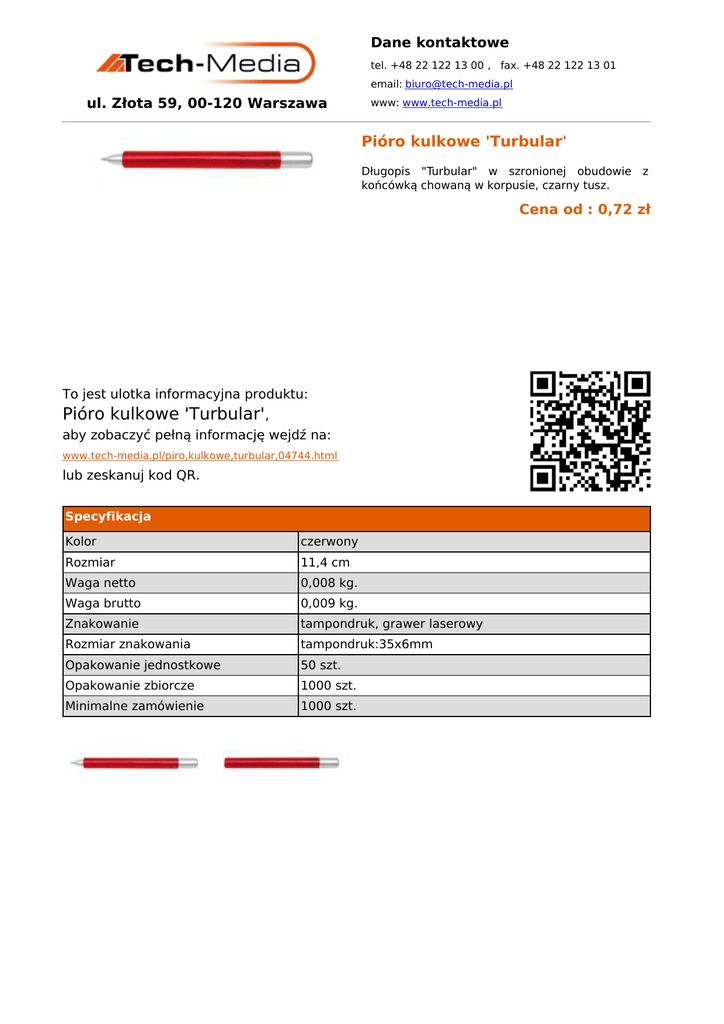 Dane kontaktowe tel. +48 22 122 13 00 , fax. +48 22 122 13 01 email: [email protected] ul. Złota 59, 00-120 Warszawa www: www.tech-media.pl Pióro kulkowe 'Turbular' Długopis "Turbular" w szronionej obudowie końcówką chowaną w korpusie, czarny tusz. z Cena od : 0,72 zł To jest ulotka informacyjna produktu: Pióro kulkowe 'Turbular', aby zobaczyć pełną informację wejdź na: www.tech-media.pl/piro,kulkowe,turbular,04744.html lub zeskanuj kod QR. Specyfikacja Kolor czerwony Rozmiar 11,4 cm Waga netto 0,008 kg. Waga brutto 0,009 kg. Znakowanie tampondruk, grawer laserowy Rozmiar znakowania tampondruk:35x6mm Opakowanie jednostkowe 50 szt. Opakowanie zbiorcze 1000 szt. Minimalne zamówienie 1000 szt.