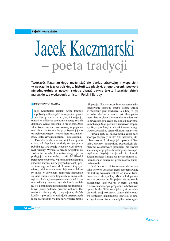 tajniki warsztatu Jacek Kaczmarski – poeta tradycji TwórczoÊç Kaczmarskiego mo˝e staç si´ bardzo atrakcyjnym wsparciem w nauczaniu j´zyka polskiego, historii czy plastyki, a jego piosenki pozwolà niejednokrotnie w nowym Êwietle ukazaç dawne teksty literackie, dzie∏a malarskie czy wydarzenia z historii Polski i Europy. ■ KRZYSZTOF GAJDA J acek Kaczmarski znalaz∏ swoje miejsce w polskiej kulturze jako autor pieÊni i piosenek. ¸àczàc wiersze z muzykà, Êpiewajàc je, obni˝y∏ w odbiorze spo∏ecznym rang´ swoich dokonaƒ. Wszak piosenka to nie wiersz. Zbyt silnie kojarzona jest z rozrywkowym, popularnym obliczem kultury, by przypisywaç jej status pe∏noprawnego – wobec literatury, malarstwa, teatru czy chocia˝ filmu – dzie∏a sztuki. Piosenka nak∏ada na autora tekstu ograniczenia, z którymi nie musi si´ zmagaç poeta publikujàcy swe poezje w postaci wydrukowanych wierszy. Wynika to przede wszystkim ze z∏o˝onoÊci kana∏u komunikacyjnego, jakim pos∏uguje si´ ten rodzaj sztuki. Mo˝liwoÊci percepcyjne odbiorcy w przypadku piosenki sà znacznie s∏absze, ni˝ w przypadku tekstu prezentowanego w formie drukowanej. Czytajàc wiersz, odbiorca sam kontroluje tempo lektury, mo˝e w dowolnym momencie zatrzymaç si´ nad trudniejszym fragmentem, mo˝e cofnàç wzrok do wybranego momentu w tekÊcie – nie zak∏ócajàc procesu czytania. Utwór audialny jest komunikatem o znacznie bardziej ustalonym przez nadawc´ procesie odbioru. Ponadto – sk∏adajàc si´ z przynajmniej dwóch kodów – piosenka o ambicjach artystycznych mo˝e natrafiaç na wi´ksze bariery percepcyjne 34 162 ni˝ poezja. Nie wystarczy bowiem samo zainteresowanie tekstem, trzeba jeszcze utrafiç w muzyczny gust s∏uchacza, a i tutaj w gr´ wchodzà z∏o˝one czynniki, jak akompaniament, barwa g∏osu i ewentualne maniery wykonawcze Êpiewajàcego czy stopieƒ muzycznej komplikacji. Stàd pewnie w znacznym stopniu wynikajà problemy z wartoÊciowaniem tego typu twórczoÊci na terenie literaturoznawstwa. Prawdà jest, ˝e zdecydowana cz´Êç tego sporego (liczàcego blisko 500 utworów) dorobku swój urok ukazuje jako piosenki. Sam tekst, czytany, pozbawiony pozosta∏ych elementów ca∏oÊciowego przekazu, nie zawsze spe∏nia wymogi, jakie stawialibyÊmy s∏owu poetyckiemu. Wydaje si´ jednak, ˝e piosenki Kaczmarskiego i mogà byç nieocenionym sojusznikiem w nauczaniu przedmiotów humanistycznych. Jacek Kaczmarski, konsekwentnie prezentujàc w swych utworach treÊci zarezerwowane dla kultury wysokiej, zbli˝y∏ ten model twórczoÊci do sztuki wysokiej. Mimo m∏odego wieku – w po∏owie lat 70. pojawi∏ si´ na scenie studenckiej jako twórca w pe∏ni dojrza∏y o ostro zarysowanym programie artystycznym i przez blisko 30 lat rozwija∏ jedynie zasadnicze wàtki swej twórczoÊci, uzupe∏nia∏ je o nowe konteksty, ka˝dorazowo oÊwietla∏ z innej strony. Co zaÊ istotne – nie tylko po to wypo- polonistyka Pantone tajniki warsztatu wiada si´ Kaczmarski, by przekazaç s∏uchaczom spreparowane do odczytania przes∏anie. Wielokrotne przetwarzanie podobnych treÊci przy u˝yciu czerpanych z bogatej tradycji motywów przekonuje, i˝ istotà tych piosenek jest nie tylko odkrycie zewn´trznego sensu, lecz przede wszystkim poszukiwanie ciàgle nowych sposobów na powiedzenie czegoÊ o Êwiecie, o cz∏owieku i jego relacjach z Historià, Kulturà czy Kosmosem. Poszczególne postacie, zdarzenia, dzie∏a bàdê tematy stajà si´ za sprawà kulturowych powiàzaƒ autonomicznymi tematami literackimi, wymagajàc odczytania w Êwietle relacji, w jakie wchodzà z innymi tekstami kultury. Poeta s∏owa Twórczy dialog z cudzym dzie∏em obecny w dorobku Jacka Kaczmarskiego obejmuje zarówno literatur´, malarstwo, jak i twórczoÊç pozostajàcà na obrze˝ach kultury wysokiej. WÊród bezpoÊrednich odniesieƒ do tekstów literackich znajdziemy, ju˝ na poziomie samych tytu∏ów, nawiàzania do twórczoÊci Jana Kochanowskiego (Jan Kochanowski), Adama Mickiewicza (Czaty Êmie∏owskie), Cypriana Kamila Norwida (Ostatnie dni Norwida) i Zbigniewa Herberta (Zbigniewowi Herbertowi, Tren spadkobierców, Kwestia odwagi), a tak˝e Miko∏aja Reja (Pana Rejowe gadanie), Henryka Sienkiewicza (Pan Wo∏odyjowski, Pan Podbipi´ta, Pan Kmicic, Kniazia Jaremy nawrócenie), Witolda Gombrowicza (Wg Gombrowicza narodu obra˝anie), Brunona Jasieƒskiego (Epitafium dla Brunona Jasieƒskiego), Aleksandra Wata (Aleksander Wat), Kazimierza Wierzyƒskiego (Kazimierz Wierzyƒski), Krzysztofa Kamila Baczyƒskiego (Barykada – Êmierç Baczyƒskiego), Owidiusza (StaroÊç Owidiusza), Fran˜oisa Villona (Testament mój), Jonathana Swifta (cykl Podró˝e Guliwera), Aleksandra Dumasa (DwadzieÊcia lat póêniej), Osipa Mandelsztama (Zmartwychwstanie Mandelsztama) i wielu innych, równie znamienitych autorów. Bardzo cz´sto twórczoÊç i biografia danego autora stanowià swoisty kostium, by ukazaç szerszà, cz´sto wspó∏czesnà problematyk´, dotyczàcà polityki, historii, ˝ycia spo∏ecznego, uniwersaliów na temat sztuki i losów artysty, albo wr´cz wypowiedzi autorskie Kaczmar- 3/2005 Pantone skiego, identyfikujàcego si´ z podmiotem tekstu. Tak jest na przyk∏ad w piosence pt. Jan Kochanowski, gdzie Kaczmarski przywdziewajàc mask´ autora Trenów, Fraszek i PieÊni wyra˝a renesansowà pochwa∏´ ˝ycia, dystans do polityki, ale i pytania o w∏asnà przysz∏oÊç – wszystko to przy wykorzystaniu subtelnej archaizacji oraz ulubionej przez Jana z Czarnolasu miary trzynastozg∏oskowca ze Êredniówkà po siódmej sylabie. Jest to tak˝e pochwa∏a tradycji i poszukiwania w wiekach dawnych odpowiedzi na te same co dziÊ pytania: Przypomina pergamin czy ciel´ca skóra ˚e i drzewiej wiedziano – co dziÊ skrobià pióra. Krom grosiwa i jad∏a, i chybkiej ob∏apki Zaw˝dy cz∏eka kusi∏y te same zagadki. W finale pieÊniarz, odnoszàc si´ do dylematów pojawiajàcych si´ i w