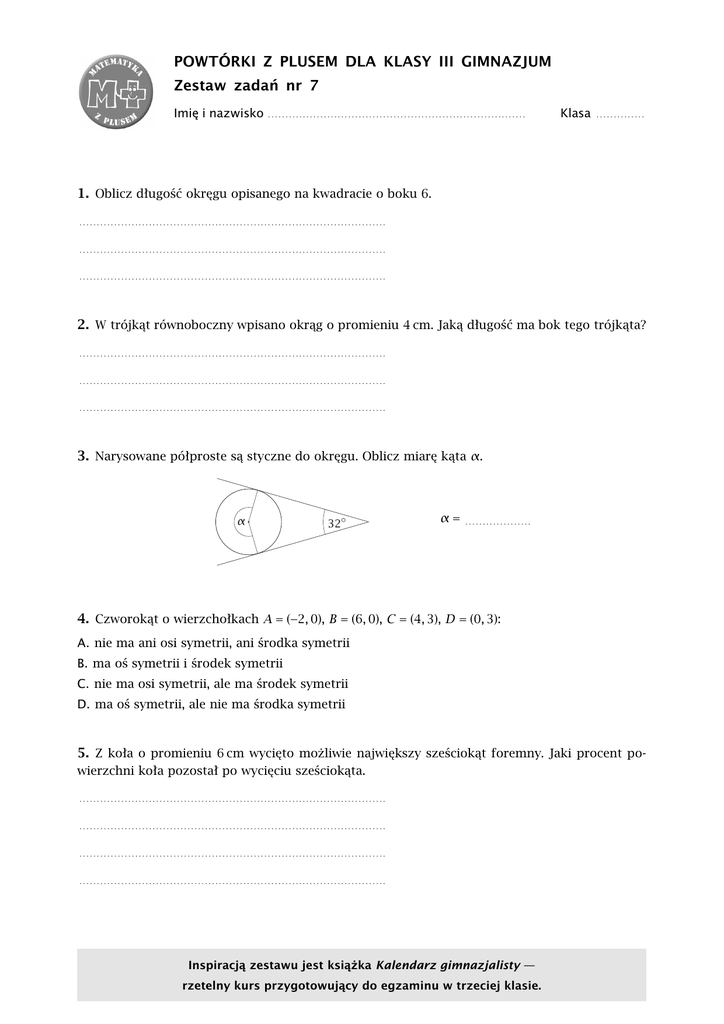POWTÓRKI Z PLUSEM DLA KLASY III GIMNAZJUM Zestaw zadań nr 7 Imię i nazwisko .......................................................................... Klasa .............. 1. Oblicz długość okręgu opisanego na kwadracie o boku 6. ........................................................................................ ........................................................................................ ........................................................................................ 2. W trójkąt równoboczny wpisano okrąg o promieniu 4 cm. Jaką długość ma bok tego trójkąta? ........................................................................................ ........................................................................................ ........................................................................................ 3. Narysowane półproste są styczne do okręgu. Oblicz miarę kąta α. α= ................... 4. Czworokąt o wierzchołkach A = (−2, 0), B = (6, 0), C = (4, 3), D = (0, 3): A. nie ma ani osi symetrii, ani środka symetrii B. ma oś symetrii i środek symetrii C. nie ma osi symetrii, ale ma środek symetrii D. ma oś symetrii, ale nie ma środka symetrii 5. Z koła o promieniu 6 cm wycięto możliwie największy sześciokąt foremny. Jaki procent powierzchni koła pozostał po wycięciu sześciokąta. ........................................................................................ ........................................................................................ ........................................................................................ ........................................................................................ Inspiracją zestawu jest książka Kalendarz gimnazjalisty — rzetelny kurs przygotowujący do egzaminu w trzeciej klasie. 6. Oblicz długości odcinków oznaczonych literami. x= y= ................... ................... 7. Uzasadnij, że przedstawione na rysunku trójkąty są podobne. Oblicz obwody tych tójkątów. .................................................................................................................................................................. .................................................................................................................................................................. .................................................................................................................................................................. .................................................................................................................................................................. 8. Boisko w kształcie prostokąta o wymiarach 50 m i 90 m powiększono przez dodanie pasa o szerokości 10 m z każdej strony. Sprawdź, czy te boiska są prostokątami podobnymi. ........................................................................................ ........................................................................................ ........................................................................................ 9. Jezioro o powierzchni 0,3 ha ma na mapie pole 30 cm2 . Skala tej mapy wynosi: A. 1 : 10 B. 1 : 1 000 000 C. 1 : 1000 D. 1 : 10 000 10. W trapezie ABCD podstawy mają: |AB| = 13 cm i |CD| = 12 cm, a ramię AD ma 6 cm. O ile centymetrów należałoby przedłużyć ramię AD, aby przecięło się z przedłużeniem ramienia BC? ........................................................................................ ........................................................................................ ........................................................................................ ........................................................................................ Inspiracją zestawu jest książka Kalendarz gimnazjalisty — rzetelny kurs przygotowujący do egzaminu w trzeciej klasie. 11. Wieża rzuca cień długości 31,5 m. W tym samym czasie drzewo o wysokości 3,2 m rzuca cień długości 2,4 m. Jaką wysokość ma wieża? .................................................................................................................................................................. .................................................................................................................................................................. .................................................................................................................................................................. *12. Wykaż, że odcinek łączący środki dwóch boków trójkąta jest równoległy do trzeciego boku trójkąta i równy połowie tego boku. .................................................................................................................................................................. .................................................................................................................................................................. .................................................................................................................................................................. .................................................................................................................................................................. Inspiracją zestawu jest książka Kalendarz gimnazjalisty — rzetelny kurs przygotowujący do egzaminu w trzeciej klasie. GIMNAZJUM Odpowiedzi do zestawu nr 7 √ 1. 6π 2 √ 2. 8 3 cm ≈ 13,86 cm 3. α = 212◦ 4. D 5. około 17% 6. x = 1,5; y = 15 7. Obwód trójkąta ABC = 24, obwód trójkąta DEF = 48 8. Nie są podobne 9. C 10. O 72 cm 11. 42 m Inspiracją zestawu jest książka Kalendarz gimnazjalisty — rzetelny kurs przygotowujący do egzaminu w trzeciej klasie.