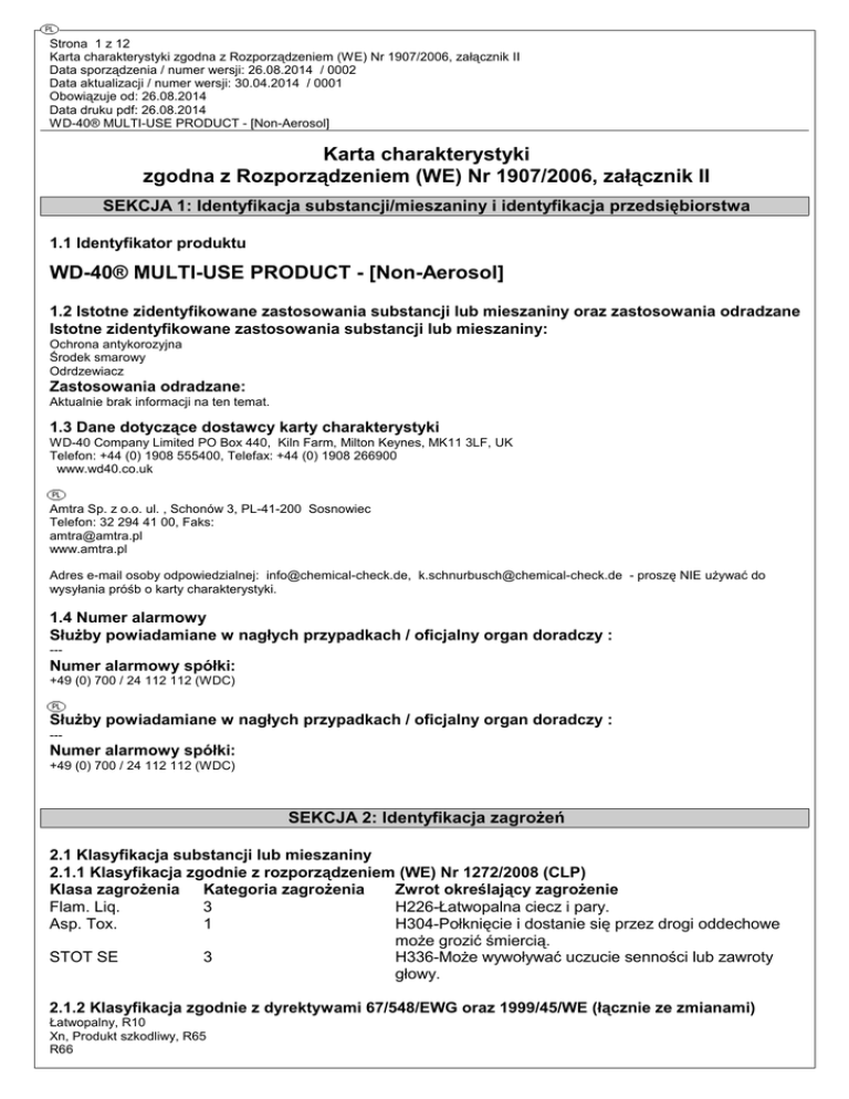Strona 1 z 12 Karta charakterystyki zgodna z Rozporządzeniem (WE) Nr 1907/2006, załącznik II Data sporządzenia / numer wersji: 26.08.2014 / 0002 Data aktualizacji / numer wersji: 30.04.2014 / 0001 Obowiązuje od: 26.08.2014 Data druku pdf: 26.08.2014 WD-40® MULTI-USE PRODUCT - [Non-Aerosol] Karta charakterystyki zgodna z Rozporządzeniem (WE) Nr 1907/2006, załącznik II SEKCJA 1: Identyfikacja substancji/mieszaniny i identyfikacja przedsiębiorstwa 1.1 Identyfikator produktu WD-40® MULTI-USE PRODUCT - [Non-Aerosol] 1.2 Istotne zidentyfikowane zastosowania substancji lub mieszaniny oraz zastosowania odradzane Istotne zidentyfikowane zastosowania substancji lub mieszaniny: Ochrona antykorozyjna Środek smarowy Odrdzewiacz Zastosowania odradzane: Aktualnie brak informacji na ten temat. 1.3 Dane dotyczące dostawcy karty charakterystyki WD-40 Company Limited PO Box 440, Kiln Farm, Milton Keynes, MK11 3LF, UK Telefon: +44 (0) 1908 555400, Telefax: +44 (0) 1908 266900 www.wd40.co.uk Amtra Sp. z o.o. ul. , Schonów 3, PL-41-200 Sosnowiec Telefon: 32 294 41 00, Faks: [email protected] www.amtra.pl Adres e-mail osoby odpowiedzialnej: [email protected], [email protected] - proszę NIE używać do wysyłania próśb o karty charakterystyki. 1.4 Numer alarmowy Służby powiadamiane w nagłych przypadkach / oficjalny organ doradczy : --- Numer alarmowy spółki: +49 (0) 700 / 24 112 112 (WDC) Służby powiadamiane w nagłych przypadkach / oficjalny organ doradczy : --- Numer alarmowy spółki: +49 (0) 700 / 24 112 112 (WDC) SEKCJA 2: Identyfikacja zagrożeń 2.1 Klasyfikacja substancji lub mieszaniny 2.1.1 Klasyfikacja zgodnie z rozporządzeniem (WE) Nr 1272/2008 (CLP) Klasa zagrożenia Kategoria zagrożenia Zwrot określający zagrożenie Flam. Liq. 3 H226-Łatwopalna ciecz i pary. Asp. Tox. 1 H304-Połknięcie i dostanie się przez drogi oddechowe może grozić śmiercią. STOT SE 3 H336-Może wywoływać uczucie senności lub zawroty głowy. 2.1.2 Klasyfikacja zgodnie z dyrektywami 67/548/EWG oraz 1999/45/WE (łącznie ze zmianami) Łatwopalny, R10 Xn, Produkt szkodliwy, R65 R66 Strona 2 z 12 Karta charakterystyki zgodna z Rozporządzeniem (WE) Nr 1907/2006, załącznik II Data sporządzenia / numer wersji: 26.08.2014 / 0002 Data aktualizacji / numer wersji: 30.04.2014 / 0001 Obowiązuje od: 26.08.2014 Data druku pdf: 26.08.2014 WD-40® MULTI-USE PRODUCT - [Non-Aerosol] R67 2.2 Elementy oznakowania 2.2.1 Oznakowanie zgodnie z rozporządzeniem (WE) Nr 1272/2008 (CLP) Niebezpieczeństwo H226-Łatwopalna ciecz i pary. H304-Połknięcie i dostanie się przez drogi oddechowe może grozić śmiercią. H336-Może wywoływać uczucie senności lub zawroty głowy. P101-W razie konieczności zasięgnięcia porady lekarza należy pokazać pojemnik lub etykietę. P102-Chronić przed dziećmi. P210-Przechowywać z dala od źródeł ciepła, gorących powierzchni, źródeł iskrzenia, otwartego ognia i innych źródeł zapłonu. Nie palić. P261-Unikać wdychania par i rozpylonej cieczy. P271-Stosować wyłącznie na zewnątrz lub w dobrze wentylowanym pomieszczeniu P301+P310+P331-W PRZYPADKU POŁKNIĘCIA: natychmiast skontaktować się z OŚRODKIEM ZATRUĆ/lekarzem. NIE wywoływać wymiotów. P312-W przypadku złego samopoczucia skontaktować się z OŚRODKIEM ZATRUĆ/lekarzem. P405-Przechowywać pod zamknięciem. P501-Zawartość/pojemnik usuwać po zabezpieczeniu do zakładu utylizacji odpadów. EUH066-Powtarzające się narażenie może powodować wysuszanie lub pękanie skóry. Węglowodory, C9-C11, n-alkanay, izoalkany, cykloalkany, < 2% związki aromatyczne 2.3 Inne zagrożenia Mieszanina nie zawiera substancji vPvB (vPvB = very persistent, very bioaccumulative) bądź nie jest wykazana w załączniku XIII rozporządzenia (WE) 1907/2006. Mieszanina nie zawiera substancji PBT (PBT = persistent, bioaccumulative, toxic) bądź nie jest wykazana w załączniku XIII rozporządzenia (WE) 1907/2006. Produkt może tworzyć błonę na powierzchni wody, która może uniemożliwić wymianę tlenu. SEKCJA 3: Skład/informacja o składnikach Nie zawiera: CFC 3.1 Substancja n.s. 3.2 Mieszanina Węglowodory, C9-C11, n-alkanay, izoalkany, cykloalkany, < 2% związki aromatyczne Numer rejestracji (REACH) Index EINECS, ELINCS, NLP CAS Stęż.% Klasyfikacja zgodnie z dyrektywą 67/548/EWG Klasyfikacja zgodnie z rozporządzeniem (WE) Nr 1272/2008 (CLP) 01-2119463258-33-XXXX --919-857-5 (REACH-IT List-No.) CAS --60-80 Łatwopalny, R10 Produkt szkodliwy, Xn, R65 R66 R67 Flam. Liq. 3, H226 Asp. Tox. 1, H304 STOT SE 3, H336 Tekst formuł R i H, a także ich kod klasyfikacji (GHS/CLP) patrz sekcja 16. Substancje wymienione w tym punkcie mają określoną faktycznie obowiązującą klasyfikację! W przypadku substancji wymienionych w załączniku VI, tabela 3.1/3.2 rozporządzenia (WE) nr 1272/2008 (rozporządzenie CLP) oznacza to, że zostały uwzględnione wszystkie ewentualne wymienione tam uwagi dla podanej tutaj klasyfikacji. Strona 3 z 12 Karta charakterystyki zgodna z Rozporządzeniem (WE) Nr 1907/2006, załącznik II Data sporządzenia / numer wersji: 26.08.2014 / 0002 Data aktualizacji / numer wersji: 30.04.2014 / 0001 Obowiązuje od: 26.08.2014 Data druku pdf: 26.08.2014 WD-40® MULTI-USE PRODUCT - [Non-Aerosol] SEKCJA 4: Środki pierwszej pomocy 4.1 Opis środków pierwszej pomocy Drogi oddechowe Osobę usunąć z zagrożonej strefy. Osobie zapewnić dopływ świeżego powietrza, w zależności od objawów skonsultować się z lekarzem. W przypadku utraty przytomności poszkodowanego położyć w stabilnej pozycji bocznej i bezzwłocznie zasięgnąć porady lekarskiej. Bezdech - potrzebny aparat sztucznego oddychania. Kontakt ze skórą Zanieczyszczone, nasączone ubranie należy niezwłocznie zdjąć, dokładnie wyprać w wodzie z mydłem, w razie podrażnienia skóry (zaczerwienienie itd.), zasięgnać porady lekarskiej. Kontakt z oczami Usunąć szkła kontaktowe. Przez kilka minut dokładnie spłukać dużą 