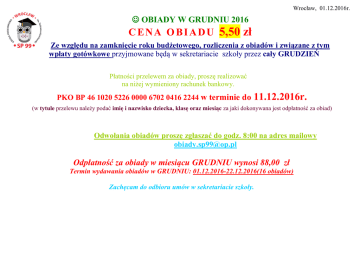 Wrocław, 01.12.2016r. OBIADY W GRUDNIU 2016 C E N A O B I A D U 5,50 zł Ze względu na zamknięcie roku budżetowego, rozliczenia z obiadów i związane z tym wpłaty gotówkowe przyjmowane będą w sekretariacie szkoły przez cały GRUDZIEŃ Płatności przelewem za obiady, proszę realizować na niżej wymieniony rachunek bankowy. PKO BP 46 1020 5226 0000 6702 0416 2244 w terminie do 11.12.2016r. (w tytule przelewu należy podać imię i nazwisko dziecka, klasę oraz miesiąc za jaki dokonywana jest odpłatność za obiad) Odwołania obiadów proszę zgłaszać do godz. 8:00 na adres mailowy [email protected] Odpłatność za obiady w miesiącu GRUDNIU wynosi 88,00 zł Termin wydawania obiadów w GRUDNIU: 01.12.2016-22.12.2016(16 obiadów) Zachęcam do odbioru umów w sekretariacie szkoły.