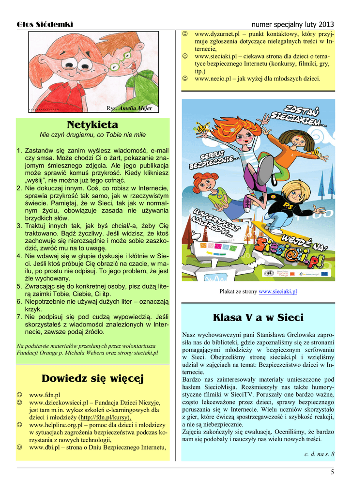 numer specjalny luty 2013 Głos Siódemki ________________________________________________________________________________________________________________________________________________________________________________________________________________________________________________________________________________________________________________________________________________________________________________________________________________________________________________________________ ……………. www.dyzurnet.pl – punkt kontaktowy, który przyjmuje zgłoszenia dotyczące nielegalnych treści w Internecie, www.sieciaki.pl – ciekawa strona dla dzieci o tematyce bezpiecznego Internetu (konkursy, filmiki, gry, itp.) www.necio.pl – jak wyżej dla młodszych dzieci. Rys. Amelia Mejer Netykieta Nie czyń drugiemu, co Tobie nie miłe 1. Zastanów się zanim wyślesz wiadomość, e-mail czy smsa. Może chodzi Ci o żart, pokazanie znajomym śmiesznego zdjęcia. Ale jego publikacja może sprawić komuś przykrość. Kiedy klikniesz „wyślij”, nie można już tego cofnąć. 2. Nie dokuczaj innym. Coś, co robisz w Internecie, sprawia przykrość tak samo, jak w rzeczywistym świecie. Pamiętaj, że w Sieci, tak jak w normalnym życiu, obowiązuje zasada nie używania brzydkich słów. 3. Traktuj innych tak, jak byś chciał/-a, żeby Cię traktowano. Bądź życzliwy. Jeśli widzisz, że ktoś zachowuje się nierozsądnie i może sobie zaszkodzić, zwróć mu na to uwagę. 4. Nie wdawaj się w głupie dyskusje i kłótnie w Sieci. Jeśli ktoś próbuje Cię obrazić na czacie, w mailu, po prostu nie odpisuj. To jego problem, że jest źle wychowany. 5. Zwracając się do konkretnej osoby, pisz dużą literą zaimki Tobie, Ciebie, Ci itp. 6. Niepotrzebnie nie używaj dużych liter – oznaczają krzyk. 7. Nie podpisuj się pod cudzą wypowiedzią. Jeśli skorzystałeś z wiadomości znalezionych w Internecie, zawsze podaj źródło. Na podstawie materiałów przesłanych przez wolontariusza Fundacji Orange p. Michała Webera oraz strony sieciaki.pl Dowiedz się więcej www.fdn.pl www.dzieckowsieci.pl – Fundacja Dzieci Niczyje, jest tam m.in. wykaz szkoleń e-learningowych dla dzieci i młodzieży (http://fdn.pl/kursy), www.helpline.org.pl – pomoc dla dzieci i młodzieży w sytuacjach zagrożenia bezpieczeństwa podczas korzystania z nowych technologii, www.dbi.pl – strona o Dniu Bezpiecznego Internetu, Plakat ze strony www.sieciaki.pl Klasa V a w Sieci Nasz wychowawczyni pani Stanisława Grelowska zaprosiła nas do biblioteki, gdzie zapoznaliśmy się ze stronami pomagającymi młodzieży w bezpiecznym serfowaniu w Sieci. Obejrzeliśmy stronę sieciaki.pl i wzięliśmy udział w zajęciach na temat: Bezpieczeństwo dzieci w Internecie. Bardzo nas zainteresowały materiały umieszczone pod hasłem SiecioMisja. Rozśmieszyły nas także humorystyczne filmiki w SieciTV. Poruszały one bardzo ważne, często lekceważone przez dzieci, sprawy bezpiecznego poruszania się w Internecie. Wielu uczniów skorzystało z gier, które ćwiczą spostrzegawczość i szybkość reakcji, a nie są niebezpiecznie. Zajęcia zakończyły się ewaluacją. Oceniliśmy, że bardzo nam się podobały i nauczyły nas wielu nowych treści. c. d. na s. 8 ________________________________________________________________________________________________________________________________________________________________________________________________________________________________________________________________________________________________________________________________________________________________________________________________________________________________________________________________________________________________________________________________________________________________________________ 5