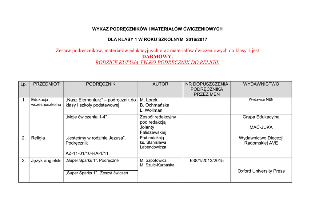 WYKAZ PODRĘCZNIKÓW I MATERIAŁÓW ĆWICZENIOWYCH DLA KLASY 1 W ROKU SZKOLNYM 2016/2017 Zestaw podręczników, materiałów edukacyjnych oraz materiałów ćwiczeniowych do klasy 1 jest DARMOWY. RODZICE KUPUJĄ TYLKO PODRĘCZNIK DO RELIGII. Lp. PRZEDMIOT 1. Edukacja wczesnoszkolna 2. Religia PODRĘCZNIK AUTOR NR DOPUSZCZENIA PODRĘCZNIKA PRZEZ MEN WYDAWNICTWO Wydawca MEN „Nasz Elementarz” – podręcznik do M. Lorek, klasy I szkoły podstawowej. B. Ochmańska L. Wollman „Moje ćwiczenia 1-4” Zespół redakcyjny pod redakcją Jolanty Faliszewskiej Pod redakcją „Jesteśmy w rodzinie Jezusa”. ks. Stanisława Podręcznik Grupa Edukacyjna MAC-JUKA Wydawnictwo Diecezji Radomskiej AVE Łabendowicza AZ-11-01/10-RA-1/11 3. Język angielski „Super Sparks 1”. Podręcznik. „Super Sparks 1”. Zeszyt ćwiczeń M. Szpotowicz M. Szulc-Kurpaska 638/1/2013/2015 Oxford University Press