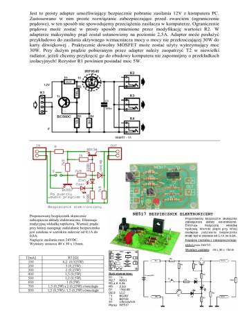 Jest to prosty adapter umożliwiający bezpiecznie pobranie zasilania 12V z komputera PC. Zastosowano w nim proste rozwiązanie zabezpieczające przed zwarciem (ograniczenie prądowe), w ten sposób nie spowodujemy przeciążenia zasilacza w komputerze. Ograniczenie prądowe może zostać w prosty sposób zmienione przez modyfikację wartości R2. W adapterze maksymalny prąd został ustanowiony na poziomie 2,5A. Adapter może posłużyć przykładowo do zasilania aktywnego wzmacniacza mocy o mocy nie przekraczającej 30W do karty dźwiękowej . Praktycznie dowolny MOSFET może zostać użyty wytrzymujący moc 30W. Przy dużym prądzie pobieranym przez adapter należy zaopatrzyć T2 w niewielki radiator, jeżeli chcemy przykręcić go do obudowy komputera nie zapomnijmy o przekładkach izolacyjnych! Rezystor R1 powinien posiadać moc 5W. Proponowany bezpiecznik skutecznie zabezpiecza układy elektroniczne. Eliminuje tradycyjną wkładkę topikową. Wartość prądu przy której następuje zadziałanie bezpiecznika jest ustalana w szerokim zakresie od 0,1A do 0,8A. Napięcie zasilania max 24VDC. Wymiary zestawu 40 x 30 x 15mm.