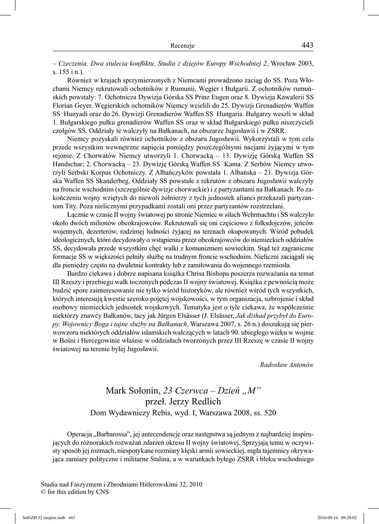443 Recenzje – Czeczenia. Dwa stulecia konfliktu, Studia z dziejów Europy Wschodniej 2, Wrocław 2003, s. 155 i n.). Również w krajach sprzymierzonych z Niemcami prowadzono zaciąg do SS. Poza Włochami Niemcy rekrutowali ochotników z Rumunii, Węgier i Bułgarii. Z ochotników rumuńskich powstały: 7. Ochotnicza Dywizja Górska SS Prinz Eugen oraz 8. Dywizja Kawalerii SS Florian Geyer. Węgierskich ochotników Niemcy wcielili do 25. Dywizji Grenadierów Waffen SS Hunyadi oraz do 26. Dywizji Grenadierów Waffen SS Hungaria. Bułgarzy weszli w skład 1. Bułgarskiego pułku grenadierów Waffen SS oraz w skład Bułgarskiego pułku niszczycieli czołgów SS. Oddziały te walczyły na Bałkanach, na obszarze Jugosławii i w ZSRR. Niemcy pozyskali również ochotników z obszaru Jugosławii. Wykorzystali w tym celu przede wszystkim wewnętrzne napięcia pomiędzy poszczególnymi nacjami żyjącymi w tym rejonie. Z Chorwatów Niemcy utworzyli 1. Chorwacką – 13. Dywizję Górską Waffen SS Handschar; 2. Chorwacką – 23. Dywizję Górską Waffen SS Kama. Z Serbów Niemcy utworzyli Serbski Korpus Ochotniczy. Z Albańczyków powstała 1. Albańska – 21. Dywizja Górska Waffen SS Skanderbeg. Oddziały SS powstałe z rekrutów z obszaru Jugosławii walczyły na froncie wschodnim (szczególnie dywizje chorwackie) i z partyzantami na Bałkanach. Po zakończeniu wojny wziętych do niewoli żołnierzy z tych jednostek alianci przekazali partyzantom Tity. Poza nielicznymi przypadkami zostali oni przez partyzantów rozstrzelani. Łącznie w czasie II wojny światowej po stronie Niemiec w siłach Wehrmachtu i SS walczyło około dwóch milionów obcokrajowców. Rekrutowali się oni częściowo z folksdojczów, jeńców wojennych, dezerterów, rodzimej ludności żyjącej na terenach okupowanych. Wśród pobudek ideologicznych, które decydowały o wstąpieniu przez obcokrajowców do niemieckich oddziałów SS, decydowała przede wszystkim chęć walki z komunizmem sowieckim. Stąd też zagraniczne formacje SS w większości pełniły służbę na trudnym froncie wschodnim. Nieliczni zaciągali się dla pieniędzy często na dwuletnie kontrakty lub z zamiłowania do wojennego rzemiosła. Bardzo ciekawa i dobrze napisana książka Chrisa Bishopa poszerza rozważania na temat III Rzeszy i przebiegu walk toczonych podczas II wojny światowej. Książka z pewnością może budzić spore zainteresowanie nie tylko wśród historyków, ale również wśród tych wszystkich, których interesują kwestie szeroko pojętej wojskowości, w tym organizacja, uzbrojenie i skład osobowy niemieckich jednostek wojskowych. Tematyka jest o tyle ciekawa, że współcześnie niektórzy znawcy Bałkanów, tacy jak Jürgen Elsässer (J. Elsässer, Jak dżihad przybył do Europy. Wojownicy Boga i tajne służby na Bałkanach, Warszawa 2007, s. 26 n.) doszukują się pierwowzoru niektórych oddziałów islamskich walczących w latach 90. ubiegłego wieku w wojnie w Bośni i Hercegowinie właśnie w oddziałach tworzonych przez III Rzeszę w czasie II wojny światowej na terenie byłej Jugosławii. Radosław Antonów Mark Sołonin, 23 Czerwca – Dzień „M” przeł. Jerzy Redlich Dom Wydawniczy Rebis, wyd. I, Warszawa 2008, ss. 520 Operacja „Barbarossa”, jej antecendencje oraz następstwa są jednym z najbardziej inspirujących do różnorakich rozważań zdarzeń okresu II wojny światowej. Sprzyjają temu w oczywisty sposób jej rozmach, niespotykane rozmiary klęski armii sowieckiej, mgła tajemnicy okrywająca zamiary polityczne i militarne Stalina, a w warunkach byłego ZSRR i bloku wschodniego Studia nad Faszyzmem i Zbrodniami Hitlerowskimi 32, 2010 © for this edition by CNS SnFiZH 32 imrpim.indb 443 2010-09-16 09:28:02 444 Recenzje potrzeba zmierzenia się z narzucaną przez półwiecze ideologiczną interpretacją tych zdarzeń. Jedną z osób zmagających się ze wspomnianą problematyką jest rosyjski historyk wojskowości Mark Siemionowicz Sołonin. Jego publikacje, w tym wydane po polsku 22 Czerwca 1941, czyli jak zaczęła się wielka wojna ojczyźniana11 oraz 23 Czerwca – Dzień „M” wpisują się przy tym w rewizjonistyczny nurt rosyjskiej publicystyki historycznej i historiografii, zapoczątkowany przez Wiktora Suworowa i jego dzieło Lodołamacz12. Godzi się tu jednak podkreślić, że urodzony w 1958 r. Sołonin nie jest zawodowym historykiem. Na swej oficjalnej stronie internetowej wyjaśnia ten fakt tym, że zdawał sobie sprawę z nieadekwatności nauk historycznych w wersji sowieckiej i dlatego wybrał naukę w Instytucie Lotniczym w Kujbyszewie13. Jako jeden z powodów zajmowania się historią wojny niemiecko-sowieckiej podaje względy rodzinne: ojciec Sołonina był żołnierzem Armii Czerwonej, podczas wojny polegli jego brat oraz szwagier, a rodzina straciła cały majątek w czasie ewakuacji z Ukrainy do centralnej Rosji. Praca 23 Czerwca – Dzień „M” należy, jak wspomniano, do publicystyki historycznej. Przejawia się to w swobodnym języku, polemicznym, żywym stylu, a nawet włączeniu do książki rozdziału o charakterze political fiction („Zbędny rozdział”). Głównym wątkiem książki jest próba wyjaśnienia przyczyn gigantycznych strat ludzkich i sprzętowych, poniesionych przez Armię Czerwoną latem 1941 r. Autor polemizuje w tym aspekcie z licznymi źródłami, podającymi jako przyczyny klęski rzekome nieprzygotowanie armii sowieckiej do walki, braki sprzętowe, niedostateczną jakość uzbrojenia, wadliwą organizację jednostek oraz złą łączność. Sołonin dokonuje tu porównania liczebności oraz wyposażenia sił sowieckich i niemieckich, wykazując oczywistą przewagę liczebną Armii Czerwonej, wyrażoną między innymi 12 379 czołgami sowieckimi wobec 3266 niemieckich, również wielokrotną przewagą pod względem posiadanych środków transportu itp. Podobnie, porównanie składów jednostek (s. 98 n.) wskazuje, że formułowane przez