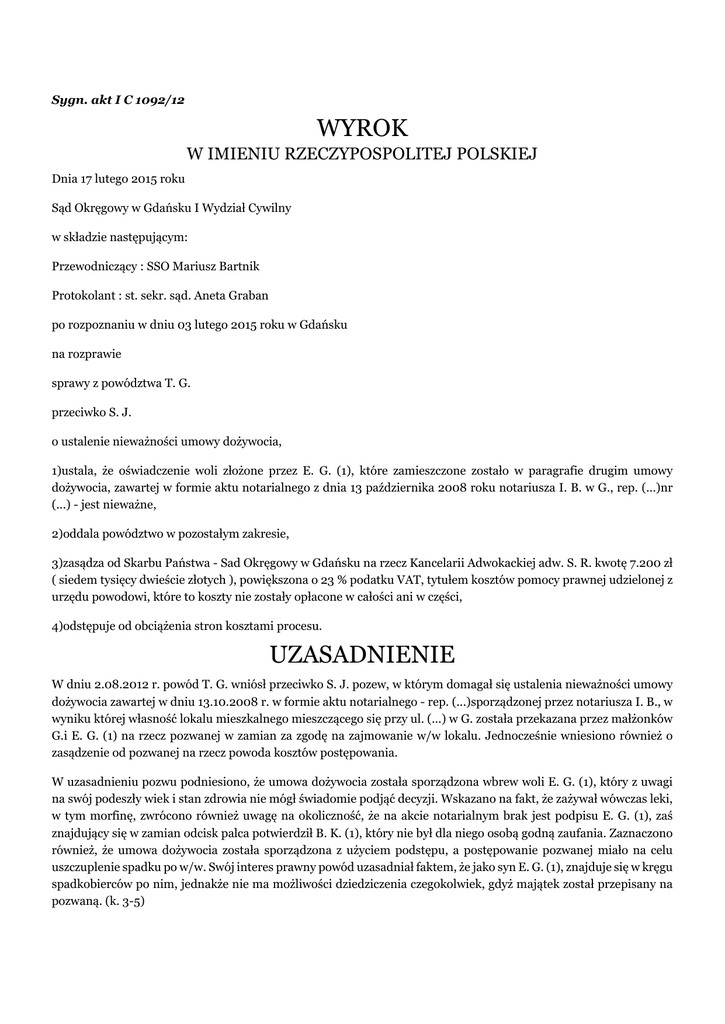 Sygn. akt I C 1092/12 WYROK W IMIENIU RZECZYPOSPOLITEJ POLSKIEJ Dnia 17 lutego 2015 roku Sąd Okręgowy w Gdańsku I Wydział Cywilny w składzie następującym: Przewodniczący : SSO Mariusz Bartnik Protokolant : st. sekr. sąd. Aneta Graban po rozpoznaniu w dniu 03 lutego 2015 roku w Gdańsku na rozprawie sprawy z powództwa T. G. przeciwko S. J. o ustalenie nieważności umowy dożywocia, 1)ustala, że oświadczenie woli złożone przez E. G. (1), które zamieszczone zostało w paragrafie drugim umowy dożywocia, zawartej w formie aktu notarialnego z dnia 13 października 2008 roku notariusza I. B. w G., rep. (...)nr (...) - jest nieważne, 2)oddala powództwo w pozostałym zakresie, 3)zasądza od Skarbu Państwa - Sad Okręgowy w Gdańsku na rzecz Kancelarii Adwokackiej adw. S. R. kwotę 7.200 zł ( siedem tysięcy dwieście złotych ), powiększona o 23 % podatku VAT, tytułem kosztów pomocy prawnej udzielonej z urzędu powodowi, które to koszty nie zostały opłacone w całości ani w części, 4)odstępuje od obciążenia stron kosztami procesu. UZASADNIENIE W dniu 2.08.2012 r. powód T. G. wniósł przeciwko S. J. pozew, w którym domagał się ustalenia nieważności umowy dożywocia zawartej w dniu 13.10.2008 r. w formie aktu notarialnego - rep. (...)sporządzonej przez notariusza I. B., w wyniku której własność lokalu mieszkalnego mieszczącego się przy ul. (...) w G. została przekazana przez małżonków G.i E. G. (1) na rzecz pozwanej w zamian za zgodę na zajmowanie w/w lokalu. Jednocześnie wniesiono również o zasądzenie od pozwanej na rzecz powoda kosztów postępowania. W uzasadnieniu pozwu podniesiono, że umowa dożywocia została sporządzona wbrew woli E. G. (1), który z uwagi na swój podeszły wiek i stan zdrowia nie mógł świadomie podjąć decyzji. Wskazano na fakt, że zażywał wówczas leki, w tym morfinę, zwrócono również uwagę na okoliczność, że na akcie notarialnym brak jest podpisu E. G. (1), zaś znajdujący się w zamian odcisk palca potwierdził B. K. (1), który nie był dla niego osobą godną zaufania. Zaznaczono również, że umowa dożywocia została sporządzona z użyciem podstępu, a postępowanie pozwanej miało na celu uszczuplenie spadku po w/w. Swój interes prawny powód uzasadniał faktem, że jako syn E. G. (1), znajduje się w kręgu spadkobierców po nim, jednakże nie ma możliwości dziedziczenia czegokolwiek, gdyż majątek został przepisany na pozwaną. (k. 3-5) Ustanowiony dla strony powodowej pełnomocnik z urzędu w piśmie z dnia 7.03.2013 r. podtrzymał wywiedzione żądanie ustalenia na podstawie art. 82 kc w zw. z art. 189 kpc nieważności umowy dożywocia z 13.10.2008 r. zawartej pomiędzy E. iG. G. (2)a S. J. a także wniosek, że ustalenie nieważności oświadczenia woli E. G. (1) w przedmiocie umowy dożywocia skutkuje nieważnością całej czynności prawnej. Wskazywał na stan zdrowia E. G. (1) w dacie zawarcia kwestionowanej umowy, w tym stan psychicznym powodujący w ocenie strony brak po stronie składającego oświadczenie woli świadomości powzięcia decyzji Wyjaśnił też, że podnoszony uprzednio przez powoda zarzut podstępu oceniać należy wyłącznie jako dezaprobata dla postępowania siostrzenicy, która wykorzystawszy trudne położenie dziadków doprowadziła do zawarcia umowy, mocą której E. i G. G. (2) rozporządzili głównym składnikiem swego majątku. Natomiast wniosek o nieważności umowy dożywocia uzasadniał treścią art. 35 kro i faktem, że majątek wspólny małżonków G. objęty był tzw. wspólnością łączną, co oznaczało, że dla skutecznego zawarcia kwestionowanej umowy konieczne były dwa ważne oświadczenia woli małżonków. Odnosząc się natomiast do uzasadnienia interesu prawnego powoda w żadaniu ustalenia nieważności zawartej między S. J. a E. i G. G. (2) umowy dożywocia wskazał na trzy okoliczności: prawo powoda, jako spadkobiercy E. G. (1) do ustalenia składu majątku podlegającego działowi, istnienie niepewności co do prawa własności mieszkania przy ul. (...), która może zostać usunięta tylko w drodze ustalenia nieważności tejże umowy oraz brak roszczenia o świadczenie, które w sposób pełny mogłoby zaspokoić interes prawny powoda. (k. 103-115) W odpowiedzi na pozew pozwana S. J. wniosła o oddalenie żądań pozwu w całości i zasądzenie od powoda na jej rzecz kosztów postępowania, w tym kosztów zastępstwa procesowego w wysokości prawem przewidzianej. Pozwana zarzuciła, że powód nie wykazał interesu prawnego w żądaniu ustalenia nieważności umowy, a tym samym legitymacji w sprawie. Wskazała także, że nieważnością nie może być dotknięta cała umowa, bowiem nieruchomość w chwili zawarcia umowy stanowiła współwłasność łączną małżonków G. i E. G. (1), zaś zarzuty powoda nie obejmują oświadczenia woli G. G. (2) - współwłaścicielki nieruchomości. Uzasadniano także, że wbrew twierdzeniom powoda E. G. (1) w chwili zawarcia umowy świadomie i swobodnie podjął decyzję o jej zawarciu oraz wyraźnie wyraził wolę jej zawarcia. Pozwana wskazywała, że jej dziadek mimo starszego wieku miał doskonałe rozeznanie w rzeczywistości, wykazywał bardzo dobrą orientację, miał dobrą pamięć i nie chorował psychicznie. Podkreślono, iż E. G. (1) nie był zmuszany przez kogokolwiek, tym bardziej podstępnie, powód zaś nie wykazał, kto użył podstępu i na czym miałby on polegać. Pozwana wskazywała również, że decyzja o wspólnym zamieszkaniu w przedmiotowym lokalu oraz przeniesieniu prawa własności tego lokalu na pozwaną w zamian za dożywocie została przez dziadków pozwanej podjęta w związku z tym, że dziadkowie, jako osoby starsze i schorowane, potrzebowali opieki, którą w ich ocenie najlepiej mogła zapewnić im pozwana. Powód zaś nie interesował się rodzicami, nie odwiedzał ich i nie świadczył pomocy. Podkreślano, że pozwana wywiązywała się z 