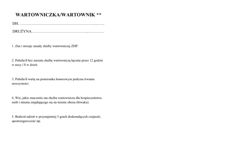 WARTOWNICZKA/WARTOWNIK ** DH. ………………………………….………………..…… DRUŻYNA……………………………………...………… 1. Zna i stosuje zasady służby wartowniczej ZHP. 2. Pełniła/ił bez zarzutu służbę wartowniczą łącznie przez 12 godzin w nocy i 8 w dzień. 3. Pełniła/ił wartę na posterunku honorowym podczas trwania uroczystości. 4. Wie, jakie znaczenie ma służba wartownicza dla bezpieczeństwa osób i mienia znajdującego się na terenie obozu (biwaku). 5. Brała/ał udział w przynajmniej 5 grach doskonalących czujność, spostrzegawczość itp.