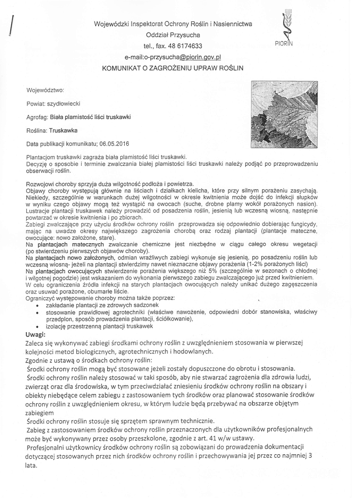Wojewódzki lnspektorat ochrony RośIini Nasiennictwa oddział Przysucha tel., fax.48 6174633 e- m a i I : o-przysucha @ p iori n. gov. ol KoMUNIKAT o ZAGRozENlU UPRAW RoŚLlN WojewÓdztwo: Powiat: szydłowiecki Agrofag: Biała plamistośćliścitruskawki Roślina; Truskawka Data publikacji komunikatu; 06.05.201 6 Plantacjom truskawki zagraża biała plamistośćliścitruskawki. Decyzję o sposobie i terminie zwalczania białej plamistości liścitruskawki naleŻy podjąc po przeprowadzeniu obserwacji roślin. Rozwojowi choroby sprzyja duza wilgotnośćpodłoza i powietrza. objawy choroby występują głównie na liściach i działkach kielicha, które przy silnym porazeniu zasychają. Niekiedy, szczególnie w warunkach duzej wilgotności w okresie kwitnienia moze dojśc do infekcji słupków w wyniku czego objawy mogą tez wystąpic na owocach (suche, drobne plamy wokół porazonych nasion). Lustracje plantacji truskawek należy prowadzić od posadzenia roślin,jesienią lub wczesną wiosną, następnie powtarzać w okresie kwitnienia i po zbiorach. Zabiegi zwalczające przy użyciu środków ochrony roślin przeprowadza się odpowiednio dobierając fungicydy, mając na uwadze okresy największego zagrożenia chorobą oraz rodzaj plantacji (plantacje mateczne, owocujące: nowo załozone, stare). Na plantacjach matecznych zwalczanie chemiczne jest niezbędne w ciągu całego okresu wegetacji ( po stwierdzen u pie rwszych objawów ch oroby)' i Na plantacjach nowo założonych, odmian wrazliwych zabiegi wykonuje się jesienią' po posadzeniu roślinlub Wczesną wiosną_ jezeli na plantacji stwierdzimy nawet nieznaczne objawy porażenia (1-2%o porazonych liści) Na plantacjach owocujących stwierdzenie porażenia większego niż 5% (szczególnie w sezonach o chłodnej i wilgotnej pogodzie) jest wskazaniem do wykonania pienłszego zabiegu zwalczającego juz przed kwitnieniem. W celu ograniczenia żrodłainfekcji na starych plantacjach owocujących należy unikac duzego zagęszczenia oraz usuwać porazone, obumarłe liście. ograniczyć występowanie choroby można także poprzez'. t o zakładanie plantacji ze zdrov,tych sadzonek r stosowanie prawidłowej agrotechniki (właściwenawożenie, odpowiedni dobÓr stanowiska, właściwy przed plon, sposób prowadzen ia pla ntacj i, ściółkowa n ie), . izolację przestrzenną plantacji truskawek Uwagi: 7aleca się wykonywać zabiegi środkamiochrony roślinz uwzględnieniem stosowania w pierwszej kolejności metod biologicznych, agrotechnicznych i hodowlanych. Zgodnie z ustawą o środkach ochrony roślin: Środki ochrony roślinmogą być stosowane jeżeli zostały dopuszczone do obrotu i stosowania. Środki ochrony roślinnależy stosować w taki sposób, aby nie stwarzać zagrozenia dla zdrowia ludzi, zwierząt oraz dla środowiska, W tym przeciwdziałać zniesieniu środkow ochrony roślinna obszary i obiekty niebędące celem zabiegu z zastosowaniem tych środkóW oraz planować stosowanie środkow ochrony roślinz uwzględnieniem okresu, W którym ludzie będą przebywać na obszarze objętym zabiegiem środkiochrony roślinstosuje się sprzętem sprawnym technicznie' Zabiegz zastosowaniem środków ochrony roślin przeznaczonych dla uzytkownikow profesjonalnych może być WykonywanY przez osoby przeszkolone, zgodnie z art.4I w/w ustawy. Profesjonalni uzytkownicy środkóW ochrony roślin są zobowiązani do prowadzenia dokumentacji dotyczącej stosowanych przez nich środkowochrony roślin i przechowywania jej przez co najmniej 3 l^r^ td td. UV/AGA: łnformacje o środkachochrony roś[!ndopuszczoriych przez fulinisira Rolnic$"ła i Rozwojł.t Vt/si do obrotu stosowania w Polsce są dostępne pod adresem: http:i/unnłw.nrinrol.gov.pi > lnforrnac1'e branŹowe > Produkcja roślinna > ochrona roślin Kierownik Marzena Stolińska i