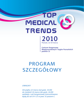 2010 Poznañ, 12–14 marca Centrum Kongresowe Miêdzynarodowych Targów Poznañskich pawilon 15 PROGRAM SZCZEGÓ£OWY UWAGA!!! Od pi¹tku 12 marca (od godz. 14.00) do niedzieli 14 marca (do godz. 14.00) wyk³ady z sali kongresowej transmitowane bêd¹ do sal C4 i C5 w paw. 15 poziom C. pi¹tek, 12 marca 2010 r. SALA KONGRESOWA sala kongresowa pi¹tek, 12 marca 2010 r. 9.00–9.10 sala C2 OTWARCIE KONGRESU: prof. Andrzej Steciwko, prezes Janusz Michalak sala C3 sala C4 sala C5 9.10–10.40 GINEKOLOGIA I PO£O¯NICTWO przewodnicz¹cy sesji: prof. Tomasz Pertyñski, prof. Krzysztof Szaflik, prof. Mariusz Zimmer, dr n. med. Bartosz J. Sapilak 9.10–11.00 ALERGOLOGIA przewodnicz¹cy sesji: prof. Krzysztof Zeman, lek. Monika Melon-Sapilak 9.10–10.40 ANESTEZJOLOGIA, OPIEKA PALIATYWNA przewodnicz¹cy sesji: prof. Krystyna de Walden-Ga³uszko, prof. Jan Dobrogowski, dr n. med. Anna Oroñska, lek. El¿bieta Gwiazda 9.10–10.45 ZABURZENIA UKRWIENIA SIATKÓWKI I NERWU WZROKOWEGO W PRZEBIEGU STARZENIA I CHORÓB OGÓLNOUSTROJOWYCH przewodnicz¹cy sesji: prof. Andrzej Stankiewicz, dr hab. Jaros³aw Kociêcki, lek. Dominika Siejka 9.10–10.35 ZAGRO¯ENIA CYWILIZACYJNE JAKO PROBLEM ZDROWIA PUBLICZNEGO przewodnicz¹cy sesji: dr hab. Beata Karakiewicz, prof. Rafa³ Kurzawa, prof. Aleksandra ¯ukrowska, dr n. med. Donata Kurpas 9.10–9.40 prof. Tomasz Pertyñski Wspó³czesne pogl¹dy na opiekê menopauzaln¹ 9.10–9.30 prof. Krzysztof Zeman Lato blisko – k¹sa, gryzie i truje wszystko – wydanie trzecie, uzupe³nione i poprawione 9.10–9.30 prof. Jan Dobrogowski Leczenie bólu przewlek³ego 9.10–9.25 prof. Andrzej Stankiewicz Wspó³czesna terapia AMD 9.10–9.25 prof. Rafa³ Kurzawa Niep³odnoœæ jako problem spo³eczny 9.25–9.50 dr n. med. Joanna Wierzbowska Niedokrwienie siatkówki i nerwu wzrokowego w przebiegu jaskry i AMD 9.25–9.40 dr hab. Beata Karakiewicz Metody diagnostyki, terapii i realizacji programów spo³ecznych szkód zdrowotnych i spo³ecznych narkomanii w Polsce 9.50–10.05 dr n. med. Agnieszka Kubicka-Trz¹ska Diagnostyka i leczenie niedro¿noœci naczyñ ¿ylnych i têtniczych siatkówki 9.40–9.55 prof. Aleksandra ¯ukrowska Samotnoœæ cz³owieka starego jako problem zdrowia psychicznego 9.40–10.10 prof. Krzysztof Szaflik Postêpy w diagnostyce i terapii p³odu 10.10–10.40 prof. Mariusz Zimmer Postêpy w endoskopii ginekologicznej Dyskusja w sali 403 9.30–9.50 dr n. med. Agnieszka Cywiñska-Bernas Nie taka ¿mija straszna, a kobra? 9.50–10.10 dr n. med. Anna Hogendorf Nie jedzcie kwiatów 10.10–10.30 dr n. med. Anna Stañczyk-Przy³uska B³onkoskrzyd³e 10.30–10.50 dr n. med. Magdalena Wiszniewska Uwaga na nietoperze i je¿e 10.50–11.00 Dyskusja 9.30–9.50 prof. Krystyna de Walden-Ga³uszko Trudne sytuacje w opiece paliatywnej – mo¿liwoœci psychofarmakoterapii 9.50–10.10 dr n. med. Anna Oroñska Trudne sytuacje w opiece paliatywnej – mo¿liwoœci farmakoterapii 10.10–10.30 mgr Dorota Go³¹b Trudne sytuacje w opiece paliatywnej – mo¿liwoœci pomocy psychologicznej 10.05–10.20 dr hab. Jaros³aw Kociêcki Gdzie i na jakie badania kierowaæ chorego podejrzanego o AMD 10.20–10.35 dr n. med. Ma³gorzata Figurska Bariery internistyczne w leczeniu AMD 10.30–10.40 Dyskusja 10.35–10.45 Dyskusja 9.55–10.10 dr n. med. Maja Gañczak Zaka¿enia zawodowe patogenami krwiopochodnymi wœród personelu medycznego w kontekœcie zadañ dla zdrowia publicznego 10.10–10.25 dr n. med. Bo¿ena Mroczek Kierunki w profilaktyce zaniedbania dziecka we wczesnych fazach rozwoju 10.25–10.35 Dyskusja 10.40–11.00 Przerwa na kawê 11.00–11.20 Przerwa na kawê 10.40–12.10 Przerwa na kawê 10.45–11.00 Przerwa na kawê 10.35–10.50 Przerwa na kawê 11.00–13.10 NEUROLOGIA I PSYCHIATRIA przewodnicz¹cy sesji: prof. Wojciech Kozubski, prof. Hubert Kwieciñski, prof. Stanis³aw Nowak, prof. Janusz Rybakowski, dr n. med. Bartosz J. Sapilak 11.20–12.50 CHIRURGIA NACZYNIOWA, DIAGNOSTYKA OBRAZOWA przewodnicz¹cy sesji: prof. Pawe³ Chêciñski, prof. Jerzy Walecki, lek. El¿bieta Gwiazda 12.10–13.10 Sesja satelitarna firmy SERVIER 11.00–12.10 MO¯LIWOŒCI SZYBKIEJ DIAGNOSTYKI I NAJCZÊSTSZE INFEKCJE W POZ przewodnicz¹cy sesji: prof. Andrzej Steciwko, dr Agnieszka Muszyñska, dr Dagmara Pokorna-Ka³wak 10.50–12.00 CHOROBY PRZEWLEK£E – KOSZTY W OPIECE PODSTAWOWEJ przewodnicz¹cy sesji: prof. Wojciech Drygas, dr n. med. Donata Kurpas, dr n. med. Patryk Piotrowski, dr hab. Piotr Tyszko 11.00–11.30 prof. Wojciech Kozubski Patogeneza, obraz kliniczny oraz próby terapii udaru zatokowego mózgu 11.20–11.50 prof. Pawe³ Chêciñski Co nowego w chirurgii naczyniowej i angiologii? 12.10–12.25 prof. Danuta Czarnecka Blokada uk³adu RAA a zawa³ serca. Które leki umo¿liwiaj¹ najskuteczniejsz¹ prewencjê? 11.00–11.15 dr Agnieszka Muszyñska Wczesne wykrywanie PChN w praktyce lekarza rodzinnego 11.30–12.00 prof. Hubert Kwieciñski Nowoœci w diagnostyce i terapii schorzeñ neurologicznych 11.50–12.30 prof. Jerzy Walecki Postêpy w diagnostyce obrazowej zmian zwyrodnieniowych uk³adu kostno-stawowego 10.50–11.05 prof. Wojciech Drygas Koszty profilaktyki chorób sercowo-naczyniowych w ramach opieki podstawowej Pytania do eksperta przewodnicz¹cy sesji: prof. Stefan Grajek, prof. Henryk Wysocki 12.25–12.40 prof. Andrzej Wykrêtowicz Cytoprotekcja w ChNS w œwietle najnowszych doniesieñ. Którzy pacjenci odnios¹ korzyœci z leczenia metabolicznego? 11.15–11.30 dr Dagmara Pokorna-Ka³wak Przydatnoœæ testów paskowych do badania ogólnego moczu u dzieci z gor¹czk¹ 11.05–11.20 dr n. med. Donata Kurpas Koszty opieki nad chorymi przewlekle w UE sala kongresowa 12.00–12.30 prof. Stanis³aw Nowak Postêpy w diagnostyce i leczeniu guzów mózgu sala C2 12.30–12.50 Dyskusja 12.30–13.00 prof. Janusz Rybakowski Postêpy diagnostyczne i terapeutyczne w depresji i chorobie afektywnej dwubiegunowej sala C3 12.40–12.55 dr hab. Leszek Czupr