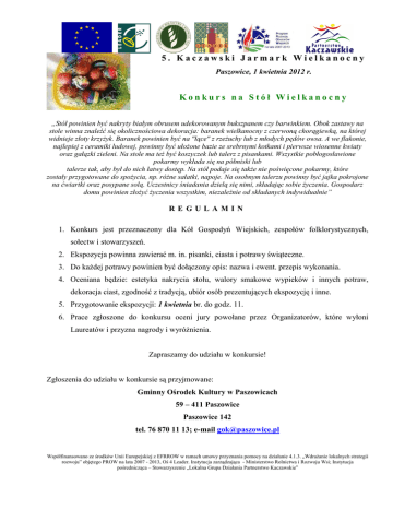 5. Kaczawski Jarmark Wielkanocny Paszowice, 1 kwietnia 2012 r. Konkurs na Stół Wielkanocny „Stół powinien być nakryty białym obrusem udekorowanym bukszpanem czy barwinkiem. Obok zastawy na stole winna znaleźć się okolicznościowa dekoracja: baranek wielkanocny z czerwoną chorągiewką, na której widnieje złoty krzyżyk. Baranek powinien być na "łące" z rzeżuchy lub z młodych pędów owsa. A we flakonie, najlepiej z ceramiki ludowej, powinny być ułożone bazie ze srebrnymi kotkami i pierwsze wiosenne kwiaty oraz gałązki zieleni. Na stole ma też być koszyczek lub talerz z pisankami. Wszystkie pobłogosławione pokarmy wykłada się na półmiski lub talerze tak, aby był do nich łatwy dostęp. Na stół podaje się także nie poświęcone pokarmy, które zostały przygotowane do spożycia, np. różne sałatki, napoje. Na osobnym talerzu powinny być jajka pokrojone na ćwiartki oraz posypane solą. Uczestnicy śniadania dzielą się nimi, składając sobie życzenia. Gospodarz domu powinien złożyć życzenia wszystkim, niezależnie od składanych indywidualnie” REGULAMIN 1. Konkurs jest przeznaczony dla Kół Gospodyń Wiejskich, zespołów folklorystycznych, sołectw i stowarzyszeń. 2. Ekspozycja powinna zawierać m. in. pisanki, ciasta i potrawy świąteczne. 3. Do każdej potrawy powinien być dołączony opis: nazwa i ewent. przepis wykonania. 4. Oceniana będzie: estetyka nakrycia stołu, walory smakowe wypieków i innych potraw, dekoracja ciast, zgodność z tradycją, ubiór osób prezentujących ekspozycję i inne. 5. Przygotowanie ekspozycji: 1 kwietnia br. do godz. 11. 6. Prace zgłoszone do konkursu oceni jury powołane przez Organizatorów, które wyłoni Laureatów i przyzna nagrody i wyróżnienia. Zapraszamy do udziału w konkursie! Zgłoszenia do udziału w konkursie są przyjmowane: Gminny Ośrodek Kultury w Paszowicach 59 – 411 Paszowice Paszowice 142 tel. 76 870 11 13; e-mail [email protected] Współfinansowano ze środków Unii Europejskiej z EFRROW w ramach umowy przyznania pomocy na działanie 4.1.3. „Wdrażanie lokalnych strategii rozwoju” objętego PROW na lata 2007 - 2013, Oś 4 Leader. Instytucja zarządzająca - Ministerstwo Rolnictwa i Rozwoju Wsi; Instytucja pośrednicząca – Stowarzyszenie „Lokalna Grupa Działania Partnerstwo Kaczawskie”
