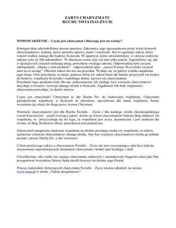 ZARYS CHARYZMATU RUCHU ŚWIATŁO-ŻYCIE WPROWADZENIE – Czym jest charyzmat i dlaczego jest on ważny? Któregoś dnia odwiedziliśmy pewne opactwo. Zakonnicy tego zgromadzenia przez wieki krzewili chrześcijaństwo, kulturę, nowe sposoby uprawy ziemi i rzemiosło. Był to ogromny zakon, który wniósł wielkie zasługi dla budowy Kościoła. W opactwie, które odwiedziliśmy, w okresie rozkwitu zakonu żyło aż 300 zakonników. W obecnym czasie żyje ich tam tylko pięciu. Zapytaliśmy się, jak w dzisiejszych czasach realizują misję, powołanie swojego zakonu. Odpowiedzią było szczere zakłopotanie. „Mamy z tym problem” - odpowiedział opat - „nawet Prymas Wyszyński zwracał nam na to uwagę”. Obecnie zakon ten nie ma powołań. Wydaje się, że gdzieś została zagubiona jego misja. Owo powołanie, ta misja, poprzez którą ów zakon która tak bardzo przyczynił się kiedyś do budowy wspólnoty Kościoła i wspólnego dobra, nazywa się charyzmatem. Przesłanie tego spotkania było dla nas jednoznaczne: nie zasługi, lecz wierność charyzmatowi decyduje o trwaniu i rozwoju danego dzieła w Kościele. Zagubienie lub brak znajomości charyzmatu powoduje, że dzieło umiera. Czym jest charyzmat? Charyzmat to dar Ducha Św. do budowania wspólnoty. Charyzmat jakiejkolwiek wspólnoty w Kościele to określone, specyficzne dla danej wspólnoty formy wyrażania jej relacji do Boga przez Jezusa Chrystusa. Wierność charyzmatowi jest dla Ruchu Światło – Życie i dla każdego dzieła chrześcijańskiego czymś kluczowym – jeżeli tworzący jakieś dzieło są wierni charyzmatowi którym Bóg obdarzył ich wspólnotę, to przyczyniają się do tego, że wspólnota jest żywa, dynamiczna i jest znakiem dla świata, że Bóg, Królestwo Boże, prawdziwie jest pośród nas. Zatem jeżeli pragniemy budować wspólnotę na drodze pewnego ruchu czy wspólnoty, to należy zachować wierność charyzmatowi danego dzieła. Aby być wiernym charyzmatowi trzeba go jednak poznać i prosić Ducha Św. o dar wierności. Celem poniższego szkicu o charyzmacie Światło – Życie nie jest wyczerpujący opis lecz jedynie zarysowanie najważniejszych elementów charyzmatu i krótki opis każdego z nich. Chcielibyśmy, aby osoby nie znające charyzmatu zobaczyły i zasmakowały bogactwa daru jaki Pan przygotował wszystkim, którzy będą chcieli kroczyć na drodze tego Dzieła. Więcej materiałów dotyczących charyzmatu Światło – Życie można odnaleźć na stronie www.oaza.pl w dziale „Teksty programowe”. 2 UWAGI WSTĘPNE Charyzmat Ruchu Światło – Życie obejmuje z jednej strony duchowość, która określa jego istotę, tożsamość, pokazuje to, czym jest Ruch. Z drugiej strony ta duchowość ujawnia się na zewnątrz poprzez różnorakie formy działania, metody pracy, diakonie (służby). Charyzmat Ruchu Światło - Życie Duchowość (czym jest Ruch) Formy działania (jak działa Ruch) Na duchowość Ruchu Światło – Życie składają się następujące elementy: 1. Charyzmat podstawowy wyrażający się w znaku FOS-DZOE 2. Charyzmat spotkania ujawniający się przez charyzmat maryjny, którego istotą jest oblubieńczość w relacji pomiędzy człowiekiem a Jezusem Chrystusem. Wzorem tej relacji jest Maryja Niepokalana, Matka Kościoła. 3. Charyzmat diakonii (służby), gdzie wzorem służby jest Jezus Chrystus Sługa. 4. Charyzmat 15-dniowych rekolekcji oazowych. 5. Krucjata Wyzwolenia Człowieka (KWC). Duchowość Ruchu 1) Charyzmat podstawowy: 2) Charyzmat spotkania Niepokalana, Matka Kościoła 3) Charyzmat chrystologiczny Idea chrystocentrycznej diakonii 4) 15-dniowe rekolekcje 5) KWC Autor: Jolanta i Jerzy Prokopiuk strona 2 Φ ΖΩΗ Σ 3 Wymienione powyżej elementy charyzmatu Ruchu określają jego istotę, opisują to czym on jest. To „być” wyraża się poprzez różnorakie formy działania, metody pracy, diakonie (służby). Krajowe Kongregacje Odpowiedzialnych (coroczne spotkania odpowiedzialnych Ruchu) określiły sposoby, formy działania Ruchu jako syntezę ruchów odnowy. Ruch Światło-Życie jest więc ruchem biblijnym, liturgicznym, ekumenicznym, charyzmatyczno-modlitewnym, ewangelizacyjnokatechumenalnym oraz ruchem wspólnot chrześcijańskich. Ruch Światło – Życie jako synteza ruchów odnowy 1) Biblijny 2) Liturgiczny 3) Ekumeniczny 4) Charyzmatyczno-modlitewny 5) Ewangelizacyjno-katechumenalny 6) Wspólnot chrześcijańskich Autor: Jolanta i Jerzy Prokopiuk strona 3 4 CHARYZMAT PODSTAWOWY Wszystkie działania w Ruchu Światło-Życie przez ewangelizację, formację i służbę mają prowadzić do coraz głębszej integracji (scalania) wewnętrznej członka ruchu, tak aby każdy z nas jak najlepiej rozpoznał i wypełnił to, co Bóg przygotował dla jego życia. Tę prawdę wyraża Φ charyzmat podstawowy w znaku FOS-DZOE, ŚWIATŁO-ŻYCIE. Jest to znak Ζ Ω Η starochrześcijański, znaleziony w katakumbach syryjskich. Jest znakiem Chrystusa, Σ który jest światłem życia. Jest to znak ukazujący proces wyzwalania w myśl słów Jezusa „Poznacie prawdę, a prawda was wyzwoli” (J 8,32). Owo wyzwalanie dokonuje się poprzez swego rodzaju przyswajanie światła na poziomie rozumu i serca. Światło dociera do nas przez sumienie, Słowo Boże, przez Chrystusa jako wzór osobowy i jako światło Kościoła: Lumen gentium, Kościoła, który dba o nieskażony przekaz poprzednich źródeł światła oraz ich należną interpretację w aktualnych sytuacjach.1 Światło jest przez nas przyswajane w naturalny sposób na poziomie rozumu. Aby nie pozostało jedynie doświadczeniem intelektualnym musi przejść z poziomu rozumu na poziom serca. Bez tego fundamentalnego procesu przejścia światła na poziom serca, czyli nawrócenia, niewiele się w człowieku zmienia oprócz zdobywania wiedzy, która w konsekwencji może rodzić pychę i zatwardziałość serca. Przejście o którym mówimy, nie dokonuje się automatycznie, ponieważ 