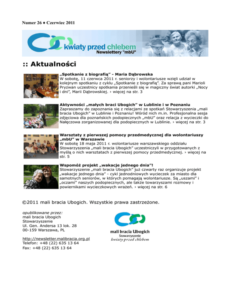 Numer 26 ♦ Czerwiec 2011 :: Aktualności „Spotkanie z biografią” - Maria Dąbrowska W sobotę, 11 czerwca 2011 r. seniorzy i wolontariusze wzięli udział w kolejnym spotkaniu z cyklu „Spotkanie z biografią”. Za sprawą pani Marioli Pryzwan uczestnicy spotkania przenieśli się w magiczny świat autorki „Nocy i dni”, Marii Dąbrowskiej. › więcej na str. 3 Aktywności „małych braci Ubogich” w Lublinie i w Poznaniu Zapraszamy do zapoznania się z relacjami ze spotkań Stowarzyszenia „mali bracia Ubogich” w Lublinie i Poznaniu! Wśród nich m.in. Profesjonalna sesja zdjęciowa dla poznańskich podopiecznych „mbU” oraz relacja z wycieczki do Nałęczowa zorganizowanej dla podopiecznych w Lublinie. › więcej na str. 3 Warsztaty z pierwszej pomocy przedmedycznej dla wolontariuszy „mbU” w Warszawie W sobotę 18 maja 2011 r. wolontariusze warszawskiego oddziału Stowarzyszenia „mali bracia Ubogich” uczestniczyli w przygotowanych z myślą o nich warsztatach z pierwszej pomocy przedmedycznej. › więcej na str. 5 Wspomóż projekt „wakacje jednego dnia”! Stowarzyszenie „mali bracia Ubogich” już czwarty raz organizuje projekt „wakacje jednego dnia” - cykl jednodniowych wycieczek za miasto dla samotnych seniorów, w których pomagają wolontariusze. Są „uszami” i „oczami” naszych podopiecznych, ale także towarzyszami rozmowy i powiernikami wycieczkowych wrażeń. › więcej na str. 6 ©2011 mali bracia Ubogich. Wszystkie prawa zastrzeżone. opublikowane przez: mali bracia Ubogich Stowarzyszenie Ul. Gen. Andersa 13 lok. 28 00-159 Warszawa, PL http://newsletter.malibracia.org.pl Telefon: +48 (22) 635 13 64 Fax: +48 (22) 635 13 64 :: Od redakcji Szanowni Czytelnicy! Oddajemy w Państwa ręce czerwcowy numer newslettera Stowarzyszenia „mali bracia Ubogich”. Znajdą w nim Państwo m.in. relację ze spotkania sobotniego w ramach cyklu „Opowiem Ci o mojej Warszawie”, którego narratorką była ambasadorka firmy emporia Telecompani, pani Jadwiga Ślawska-Szalewicz oraz relację z kursu pierwszej pomocy dla wolontariuszy warszawskiego oddziału „mbU”. Trwa też realizacja projektu „wakacje jednego dnia”, w ramach którego podopieczni i wolontariusze z Lublina, Poznania i Warszawy wyjeżdżają wspólnie na jednodniowe wycieczki! W tym numerze relacja z lubelskiej wycieczki do Nałęczowa. Jednocześnie informujemy, że w czerwcu Stowarzyszenie „mbU” dopełniło wszelkich formalności wynikających z obowiązku organizacji pożytku publicznego - sprawozdania merytoryczne oraz finansowe z naszej działalności znajdą Państwo w dziale „o nas” na stronie internetowej Stowarzyszenia. W razie jakichkolwiek pytań pozostajemy do Państwa dyspozycji. Na koniec zapraszamy Państwa na nową stronę internetową poświęconą projektowi polskoniemieckiemu, która znajduje się pod adresem http://projekt.malibracia.org.pl/. Życzymy miłej lektury!! Redakcja "mbU" :: Tak będzie Spotkania, wycieczki, warsztaty, konsultacje...Bądź na bieżąco!!! Zapraszamy do zapoznania się z bieżącym harmonogramem działań Stowarzyszenia „mali bracia Ubogich”! Dowiedz się, co wydarzy się jeszcze w lipcu! › więcej na str. 6 :: Szczegóły prowadzonego projektu Ruszyła strona internetowa projektu polsko-niemieckiego! Pragniemy poinformować Państwa, że funkcjonuje już strona internetowa projektu polskoniemieckiego, w którym biorą udział m.in. wolontariusze i podopieczni warszawskiego oddziału „mbU”. › więcej na str. 7 Dobiega końca konkurs fotograficzny Fundacji „Pamięć, Odpowiedzialność i Przyszłość”! To już ostatni dzwonek na udział wolontariuszy-fotografów w konkursie Fundacji „Pamięć, Odpowiedzialność i Przyszłość”. Nie zwlekaj! Zgłoszenia można dostarczać tylko do 27 lipca 2011 r.! › więcej na str. 8 Muzyczny powrót do przeszłości - koncert pt. „Lata dwudzieste, lata trzydzieste” W czwartkowe popołudnie 9 czerwca dzięki współpracy Stowarzyszenia „mali bracia Ubogich” z Klubem na Andersa - filią Domu Kultury Śródmieście - odbyło się wyjątkowe muzyczne spotkanie pt. „Lata dwudzieste, lata trzydzieste”. Pomysłodawczynią i autorką scenariusza spotkania była wolontariuszka „mbU” i zarazem pianistka, Lucyna Drugowiec-Szwarc. Dzięki jej pomysłowi goście spotkania mogli na chwilę przenieść się w barwne lata ubiegłego wieku. › więcej na str. 9 „Opowiem Ci o mojej Warszawie” - spotkanie z p. Jadwigą Ślawską-Szalewicz W sobotę 25 czerwca 2011 r. w czasie długiego weekendu odbyło się kolejne spotkanie z cyklu „Opowiem Ci o mojej Warszawie”. Na szczęście nie wszyscy wyjechali w tym czasie poza Warszawę, o czym świadczy bardzo duża liczba zgromadzonych słuchaczy. Narratorką czerwcowego spotkania była pani Jadwiga Ślawska-Szalewicz, aktywna seniorka, babcia czwórki wnucząt. › więcej na str. 9 „Spotkanie z biografią” - Maria Dąbrowska W sobotę, 11 czerwca 2011 r. seniorzy i wolontariusze wzięli udział w kolejnym spotkaniu z cyklu „Spotkanie z biografią”. Za sprawą pani Marioli Pryzwan uczestnicy spotkania przenieśli się w magiczny świat autorki „Nocy i dni”, Marii Dąbrowskiej. Autorka książki pt. „Wypisałam całą siebie. Maria Dąbrowska we wspomnieniach i listach” zebrała i opracowała wspomnienia osób, którym bliska była pisarka. Mariola Pryzwan nie kryje fascynacji twórczością Dąbrowskiej. Jednocześnie przyznała, że dopiero przygotowując książkę, miała okazję poznać pisarkę od zupełnie innej strony: jako osobę bardzo wrażliwą, chwilami poważną, o bezkompromisowym podejściu do wielu spraw. Uczestnicy spotkania zgodzili się, że nie sposób nie polubić Marii Dąbrowskiej po wysłuchaniu opowieści pani Marioli, która pokazała zebranym nowy wizerunek popularnej autorki, jak też podzieliła się anegdotami nieznanymi szerszej publiczności. Podczas spotkania seni