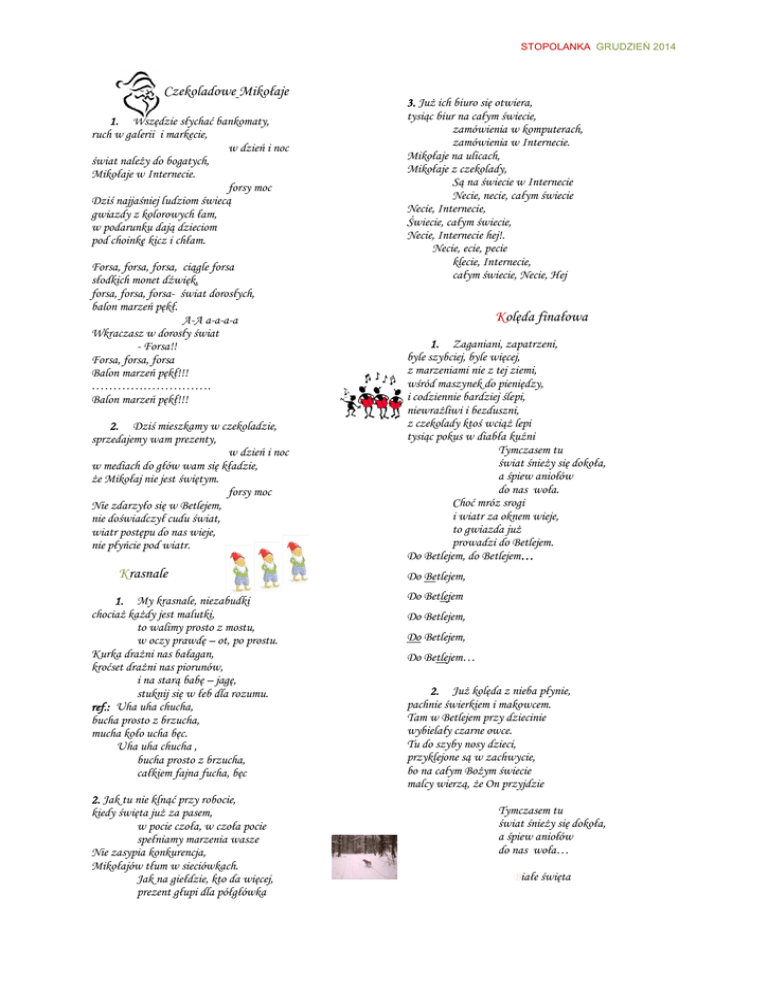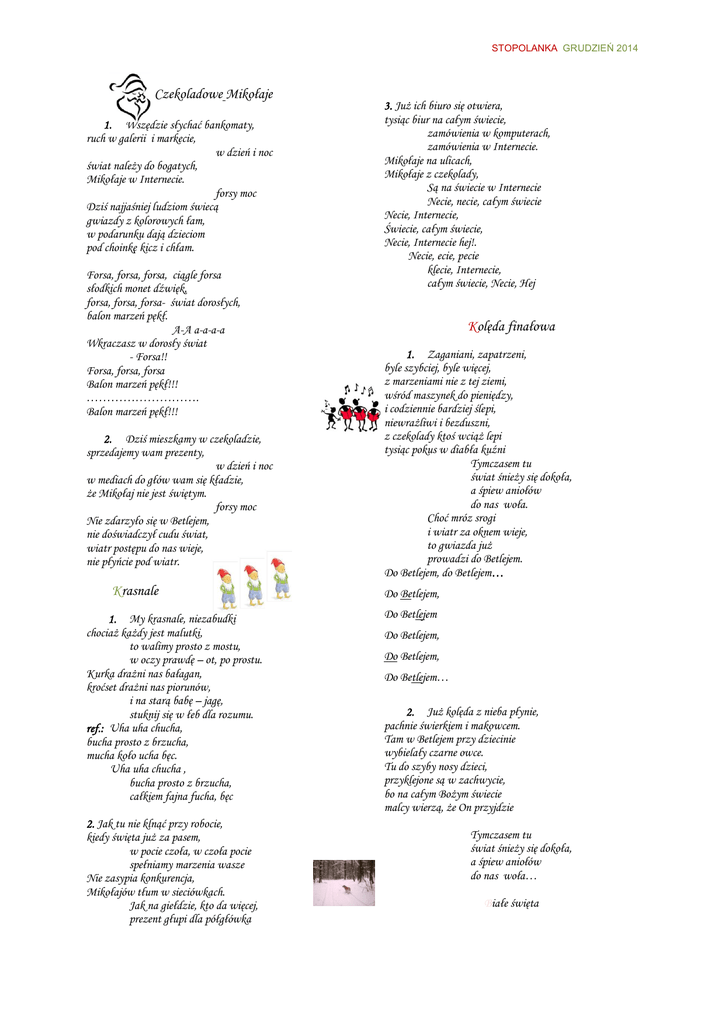 STOPOLANKA GRUDZIEŃ 2014 Czekoladowe Mikołaje 1. Wszędzie słychać bankomaty, ruch w galerii i markecie, w dzień i noc świat należy do bogatych, Mikołaje w Internecie. forsy moc Dziś najjaśniej ludziom świecą gwiazdy z kolorowych łam, w podarunku dają dzieciom pod choinkę kicz i chłam. Forsa, forsa, forsa, ciągle forsa słodkich monet dźwięk, forsa, forsa, forsa- świat dorosłych, balon marzeń pękł. A-A a-a-a-a Wkraczasz w dorosły świat - Forsa!! Forsa, forsa, forsa Balon marzeń pękł!!! ………………………. Balon marzeń pękł!!! 2. Dziś mieszkamy w czekoladzie, sprzedajemy wam prezenty, w dzień i noc w mediach do głów wam się kładzie, że Mikołaj nie jest świętym. forsy moc Nie zdarzyło się w Betlejem, nie doświadczył cudu świat, wiatr postępu do nas wieje, nie płyńcie pod wiatr. Krasnale 1. My krasnale, niezabudki chociaż każdy jest malutki, to walimy prosto z mostu, w oczy prawdę – ot, po prostu. Kurka drażni nas bałagan, kroćset drażni nas piorunów, i na starą babę – jagę, stuknij się w łeb dla rozumu. ref.: Uha uha chucha, bucha prosto z brzucha, mucha koło ucha bęc. Uha uha chucha , bucha prosto z brzucha, całkiem fajna fucha, bęc 2. Jak tu nie klnąć przy robocie, kiedy święta już za pasem, w pocie czoła, w czoła pocie spełniamy marzenia wasze Nie zasypia konkurencja, Mikołajów tłum w sieciówkach. Jak na giełdzie, kto da więcej, prezent głupi dla półgłówka 3. Już ich biuro się otwiera, tysiąc biur na całym świecie, zamówienia w komputerach, zamówienia w Internecie. Mikołaje na ulicach, Mikołaje z czekolady, Są na świecie w Internecie Necie, necie, całym świecie Necie, Internecie, Świecie, całym świecie, Necie, Internecie hej!. Necie, ecie, pecie klecie, Internecie, całym świecie, Necie, Hej Kolęda finałowa 1. Zaganiani, zapatrzeni, byle szybciej, byle więcej, z marzeniami nie z tej ziemi, wśród maszynek do pieniędzy, i codziennie bardziej ślepi, niewrażliwi i bezduszni, z czekolady ktoś wciąż lepi tysiąc pokus w diabła kuźni Tymczasem tu świat śnieży się dokoła, a śpiew aniołów do nas woła. Choć mróz srogi i wiatr za oknem wieje, to gwiazda już prowadzi do Betlejem. Do Betlejem, do Betlejem… Do Betlejem, Do Betlejem Do Betlejem, Do Betlejem, Do Betlejem… 2. Już kolęda z nieba płynie, pachnie świerkiem i makowcem. Tam w Betlejem przy dziecinie wybielały czarne owce. Tu do szyby nosy dzieci, przyklejone są w zachwycie, bo na całym Bożym świecie malcy wierzą, że On przyjdzie Tymczasem tu świat śnieży się dokoła, a śpiew aniołów do nas woła… Białe święta STOPOLANKA GRUDZIEŃ 2014 1. Marzyłem O tych białych Świętach Bo je w pamięci zawsze mam Migocących bombek srebrzyste twarze magiczne dzwonki śnieżnych sań. 2. Marzyłem o tych białych świętach Bo je w pamięci zawsze mam Migocących światełek czar Oraz stukot rozpędzonych sań. 3. O białych świętach wciąż marzę Kiedy świąteczne kartki ślę Życzę Tobie szczęścia i miłych wrażeń Gdy Święty Mikołaj zjawi się. 4. O białych świętach wciąż marzę Ślę kartki pełne ciepłych słów. Niech się spełnią marzenia me I bielutkie będą święta te. Czy to sen ? Czy to sen ze wszystkich najpiękniejszy? Skrzy się świat metaforami wierszy. Czy ja śnię? Świat pachnie dookoła. Z nieba śpiew... to chór aniołów woła. 3. Świąteczne aniołki Popatrz, jak na szybach Mróz maluje wzorki, A z nieba na ziemię wędrują aniołki /2X Ref. Świąteczne aniołki, wesołe aniołki Na chmurkach fikają koziołki Fikają z radości, że będziesz je gościć Na święta kolęda, kolęda... Skrzydlate aniołki Fikają na chmurkach. Czy to śnieżek leci Czy anielskie piórka? /2X W Boże Narodzenie Do ciebie przylecą Przyniosą podarki I gwiazdkę zaświecą /2x Bałwany 1. Bałwanów wokół tyle, że aż uwierzyć strach. Przetrwają jesień, zimę, nawet plażowy piach. Bałwany są wielgachne, gdzie dzieciom do nich, gdzie? Od dzieci trochę starsze, i się kojarzą źle. Czy ja śnię?, czy ja śnię?, Czy to sen? Czy to sen?, czy to sen? Czy ja śnię? Spełnią się najskrytsze me marzenia, gwiazdy mrok nadzieją opromienią, przyjdzie ktoś, do moich drzwi zastuka dobry gość posłaniec Julebukka. Czy ja śnię?, czy ja śnię?, Czy to sen? Czy to sen?, czy to sen? Czy ja śnię? Kolęda na niebie 1. Aniołek maleńki jak wróbelek przyfrunął do szopy do Betlejem zapalił na niebie jasną gwiazdę aż noc się zrobiła jak dzień jasny Ref. Kolęda na niebie, Kolęda na ziemi, kolęda Kolęda na niebie, Kolęda na ziemi Dla Ciebie kolędujemy 2. Zaśpiewał głosikiem jak dzwoneczek, że w szopie na sianie leży dziecię Kto widział te cuda nad cudami, że Bóg choć maleńki będzie z nami Przybiegli pasterze i zwierzęta Królowie przynieśli już prezenty I Ciebie zaprasza do Betlejem Aniołek maleńki jak wróbelek Ja nie jestem tym bałwanem, o którym w piosence, ja jestem belfrem z Polanek i mam dobre serce. 2. Bałwany wcale nie są ze śnieżnych białych kul to przestarzały przesąd nieczułe są na sól bałwany na urzędach bałwanów cały grom nie uczą się na błędach być może wśród nas są.